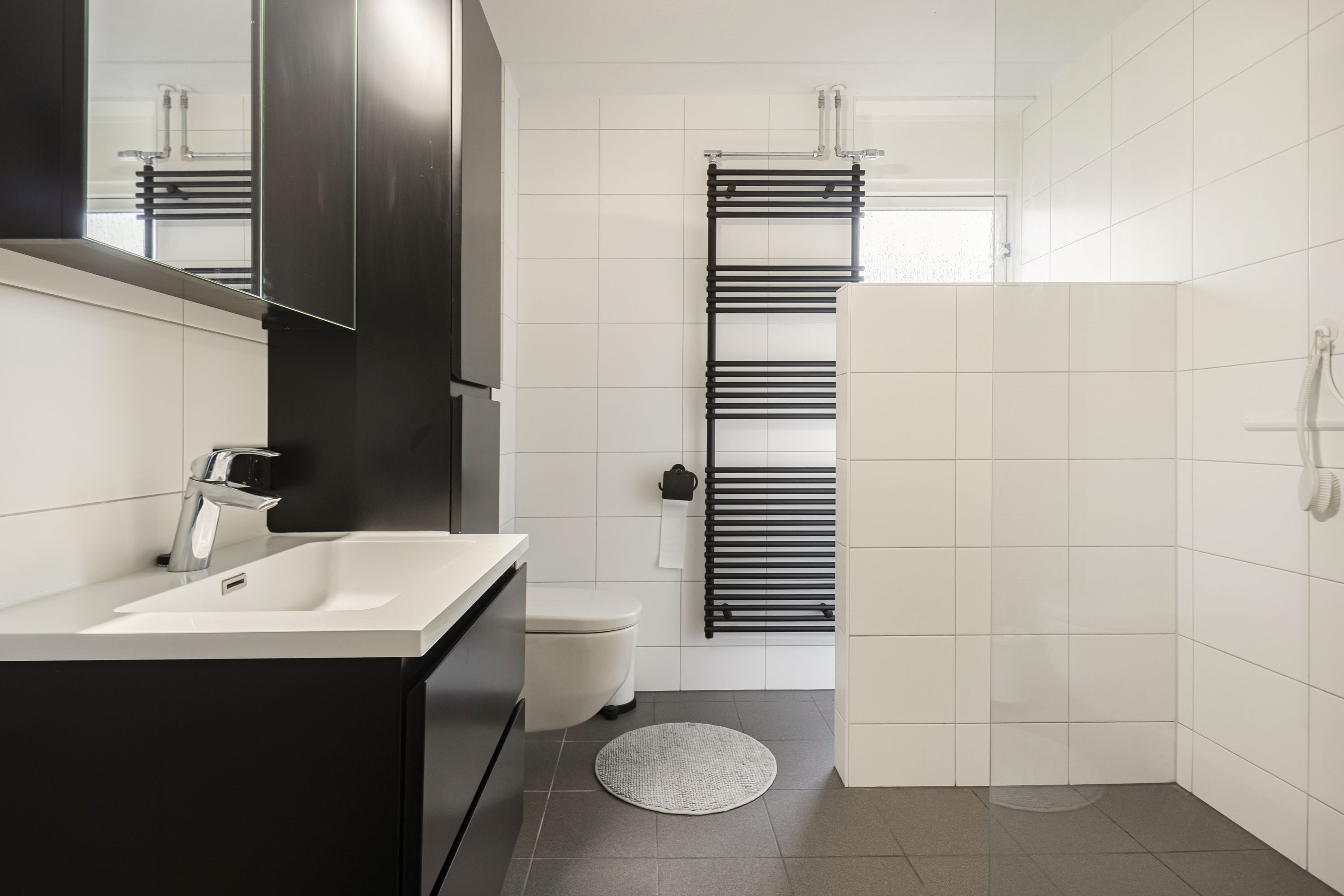 De badkamer heeft een nette uitstraling en is uitgerust met een inloopdouche, wastafelmeubel, toilet en designradiator.