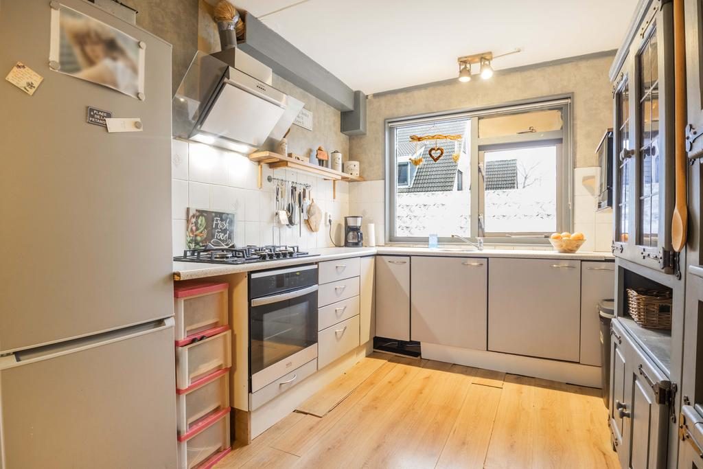 Via de entree kom je bij de ruime hal met een toiletruimte, de trapopgang naar de eerste verdieping en de deur die toegang geeft tot de woonkamer. Bij binnenkomst tref je een praktische indeling met een lichte, tuingerichte woonkamer. Centraal tussen de woonkamer en keuken bevindt zich het eetgedeelte. Hier is meer dan voldoende ruimte voor een grote eettafel met stoelen. Een fijne plek om met familie en/of vrienden te genieten van een hapje, drankje en spelletje! De L-vormige keuken is aan de voorzijde van de woning gelegen en beschikt over een oven, afzuigkap, gasfornuis en een losse koelkast. Vanuit de keuken kijk je de gezellige straat in.