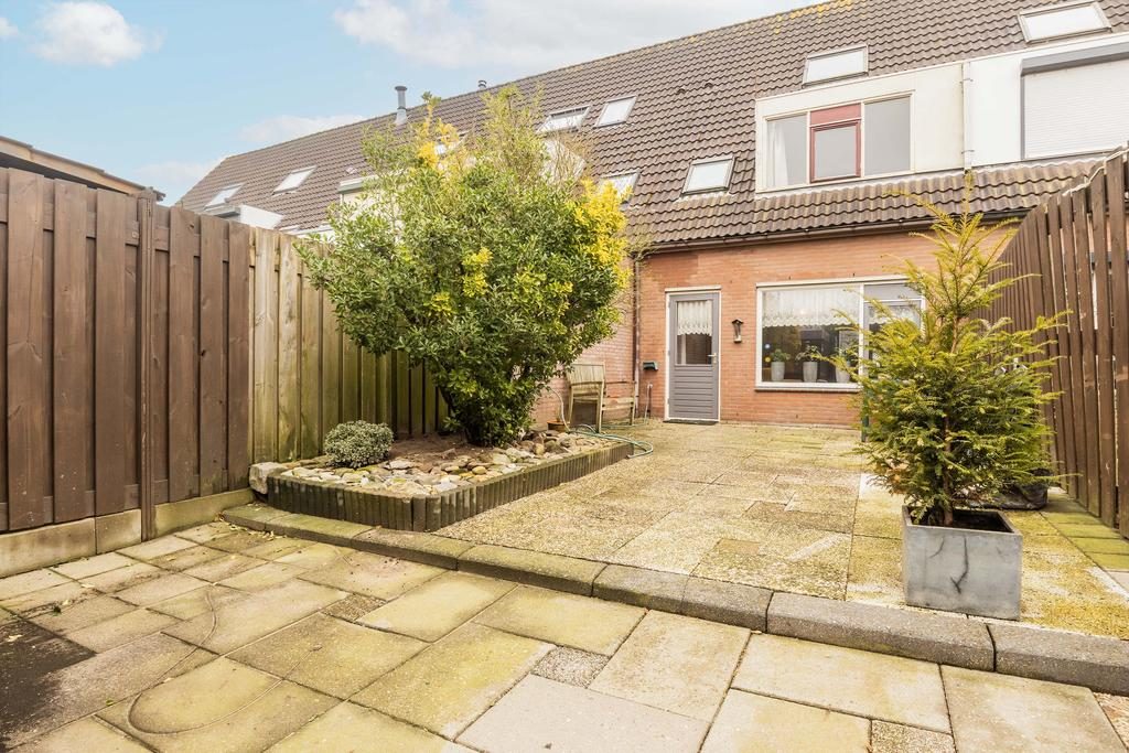De achtertuin is gelegen op het noorden en grotendeels betegeld. De tuin is voorzien van groene borders en door de diepte is er altijd een plekje in de zon of schaduw te vinden. Rust en privacy staan hier centraal!