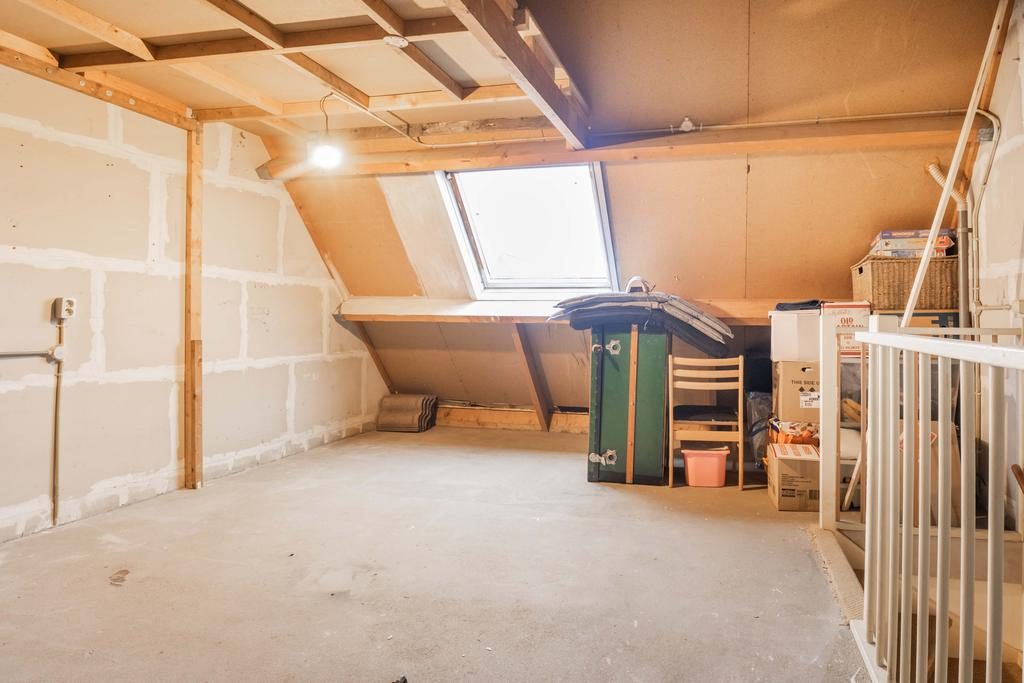 Via de vaste trap kom je bij de tweede verdieping. Hier is een royale open zolderruimte met mogelijkheden voor extra slaapkamers of een werkplek. Hier is ook de cv-installatie gesitueerd.