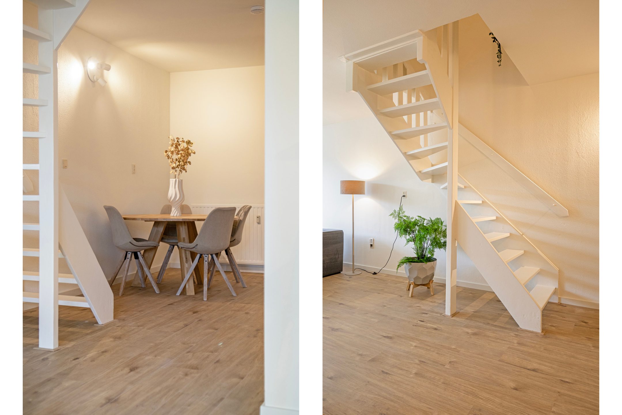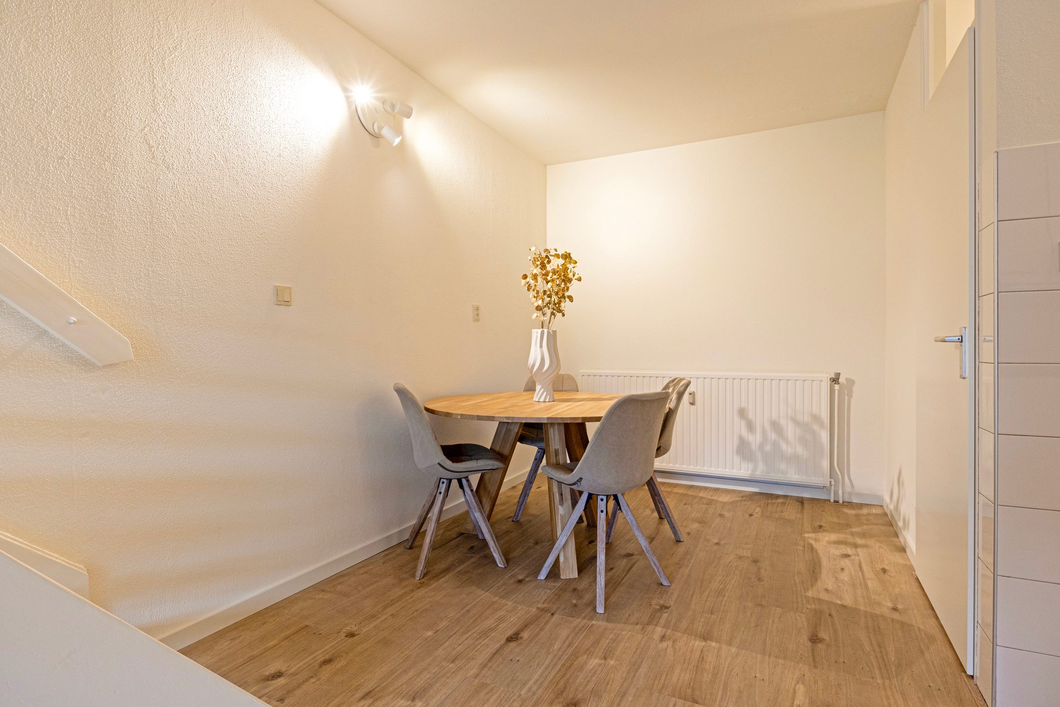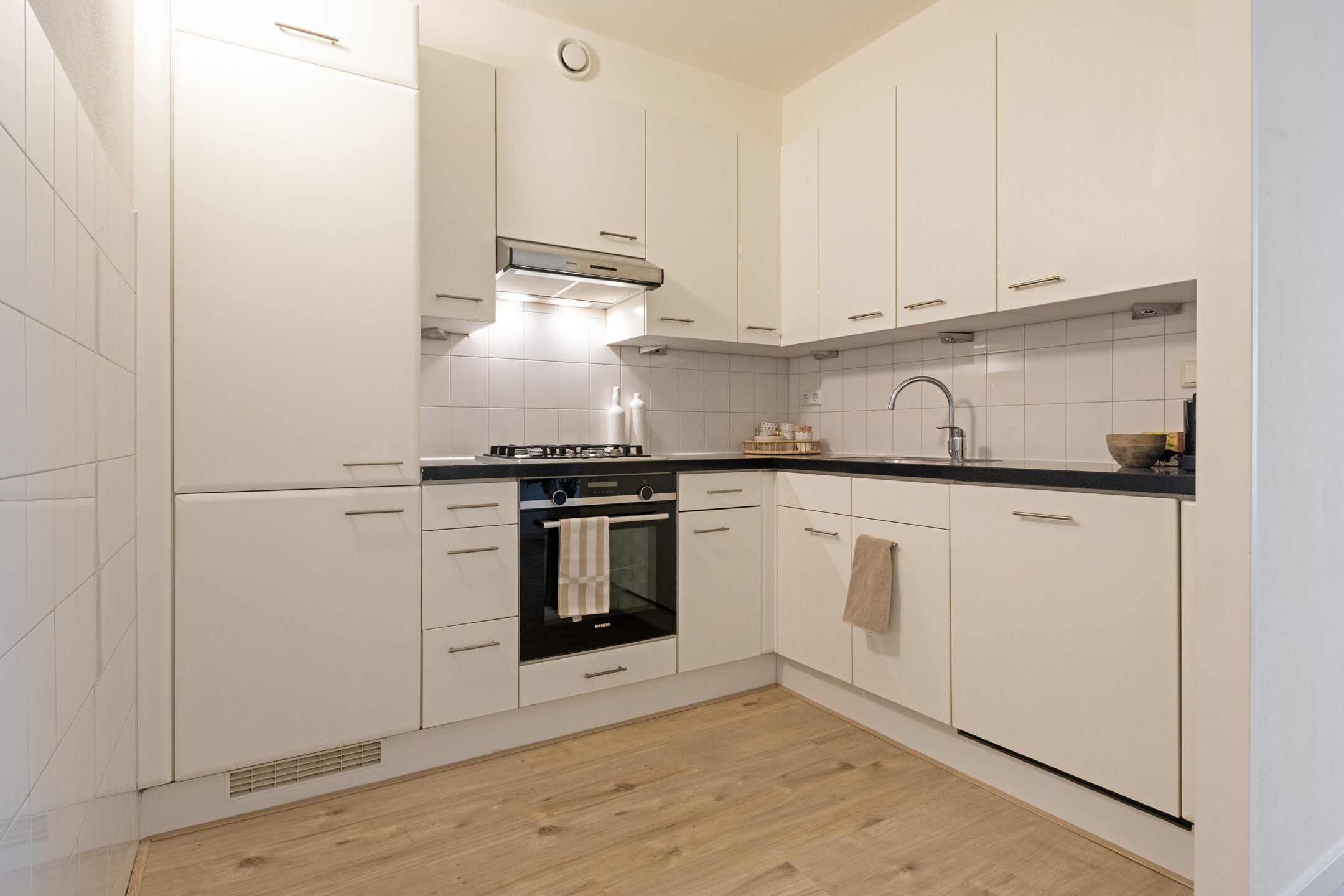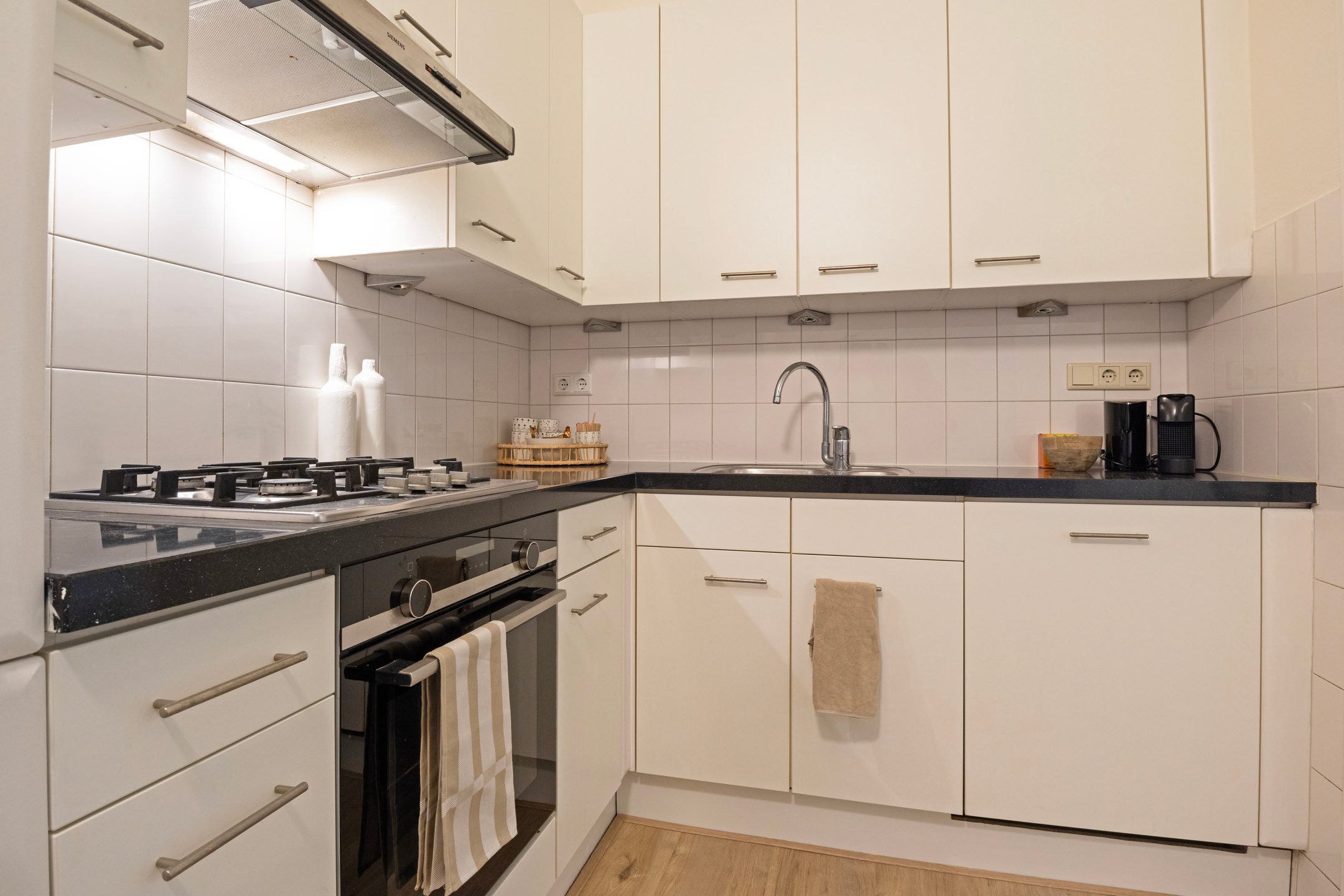 De halfopen keuken in hoekopstelling is strak afgewerkt en voorzien van alle gemakken: een vaatwasser, koelkast, vriezer, oven, afzuigkap en kookplaat. Naast de keuken is voldoende ruimte voor een eettafel, zodat je uitgebreid kunt tafelen met vrienden en familie.