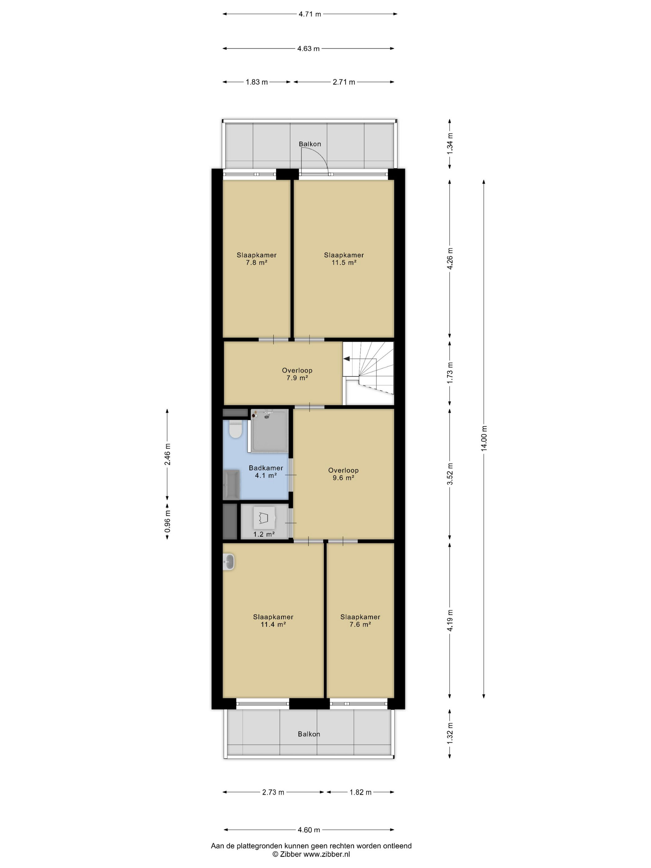 Via de trap in de woonkamer bereik je de bovenverdieping. Hier vind je maar liefst vier slaapkamers, met mooie oppervlaktes van 11,5 m², 11,4 m², 7,6 m² en 7,8 m². Twee slaapkamers bieden bovendien toegang tot een balkon: eentje op het oosten en de andere op het westen, zodat je altijd een plekje in de zon of schaduw hebt.