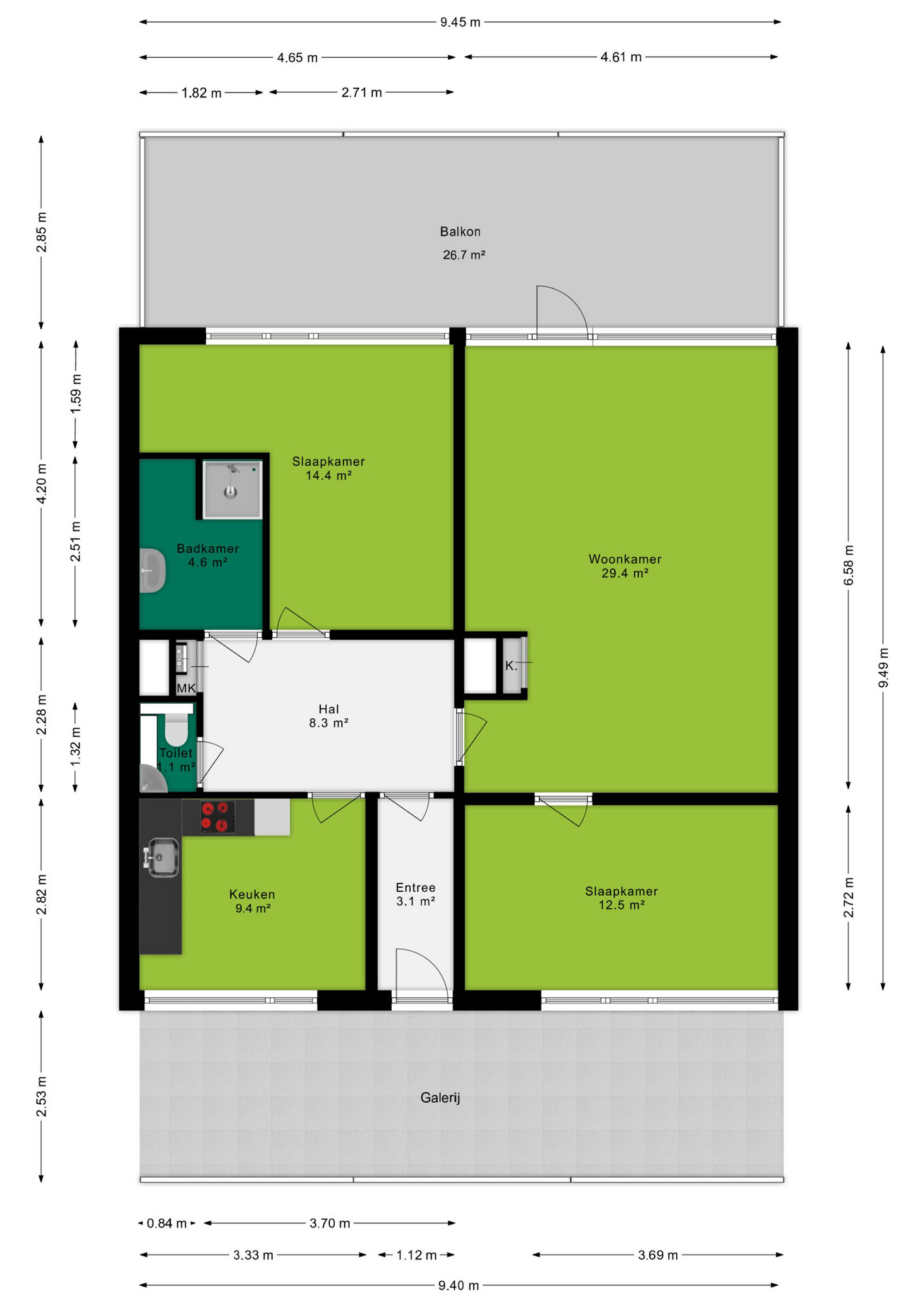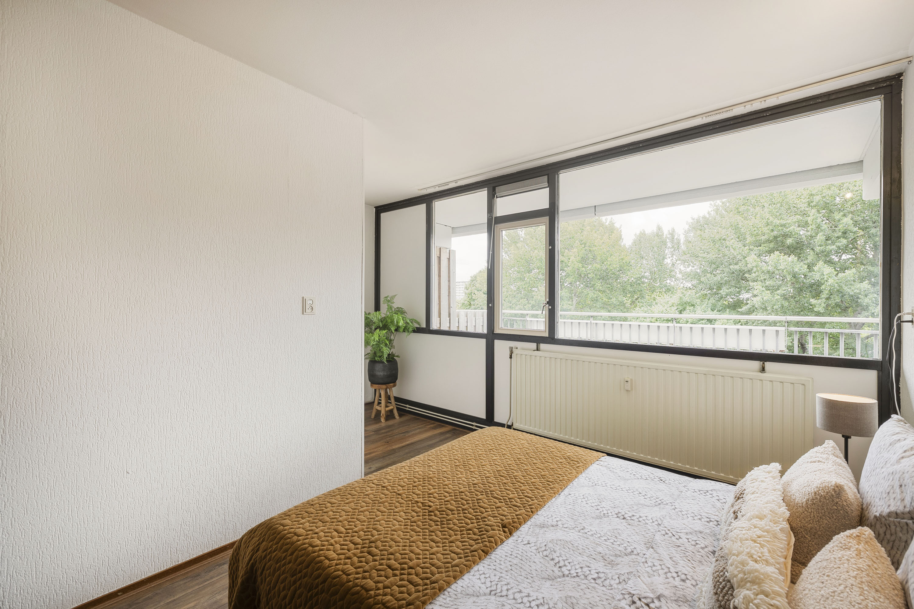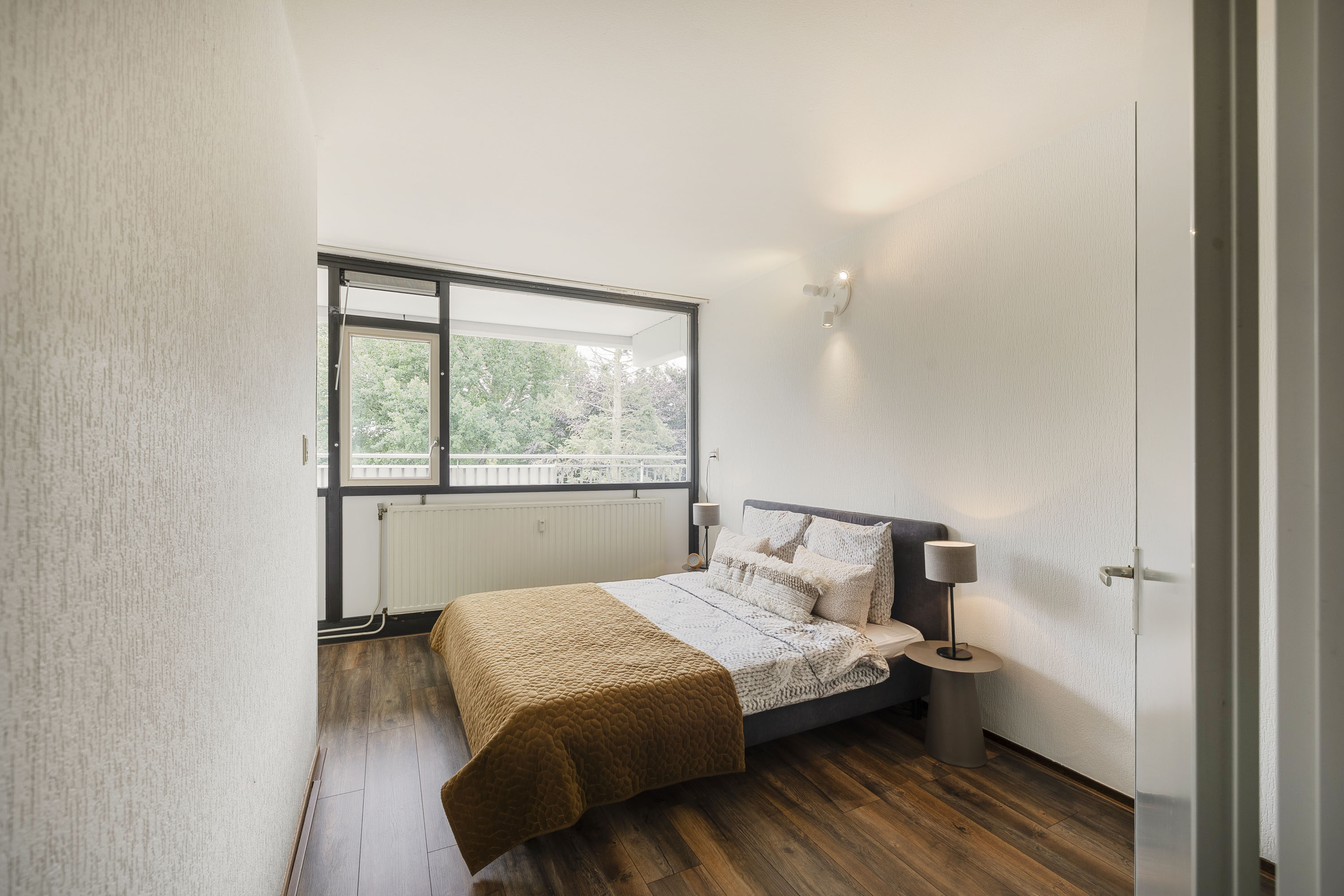 Het appartement beschikt over twee ruime slaapkamers van respectievelijk circa 14,5 m² en 13 m². De slaapkamer aan de balkonzijde is voorzien van grote ramen en biedt een mooi, vrij uitzicht. De tweede slaapkamer, gelegen aan de galerijzijde, is ideaal als werk- of logeerkamer. Beide kamers zijn keurig afgewerkt en bieden volop indelingsmogelijkheden.
