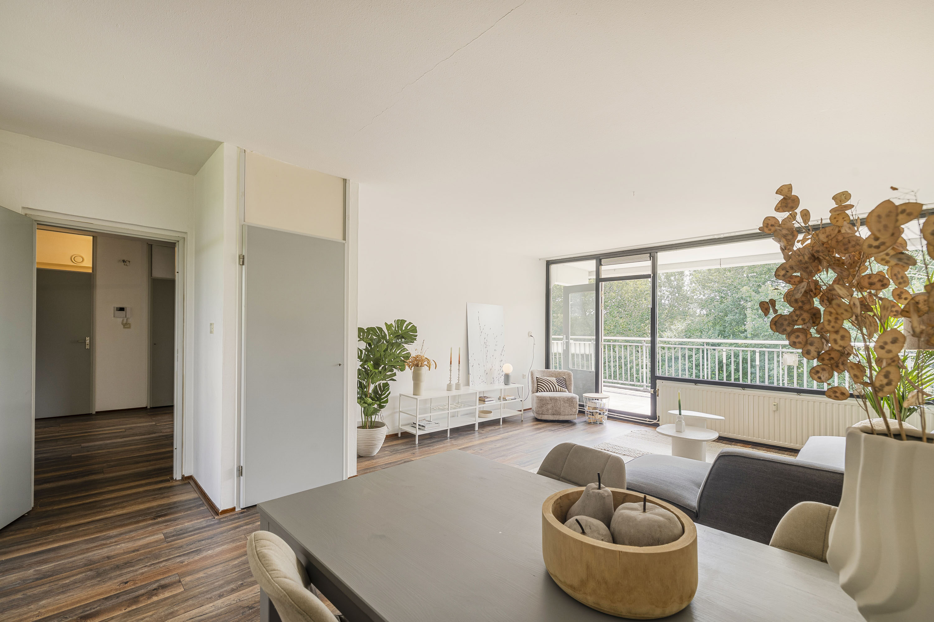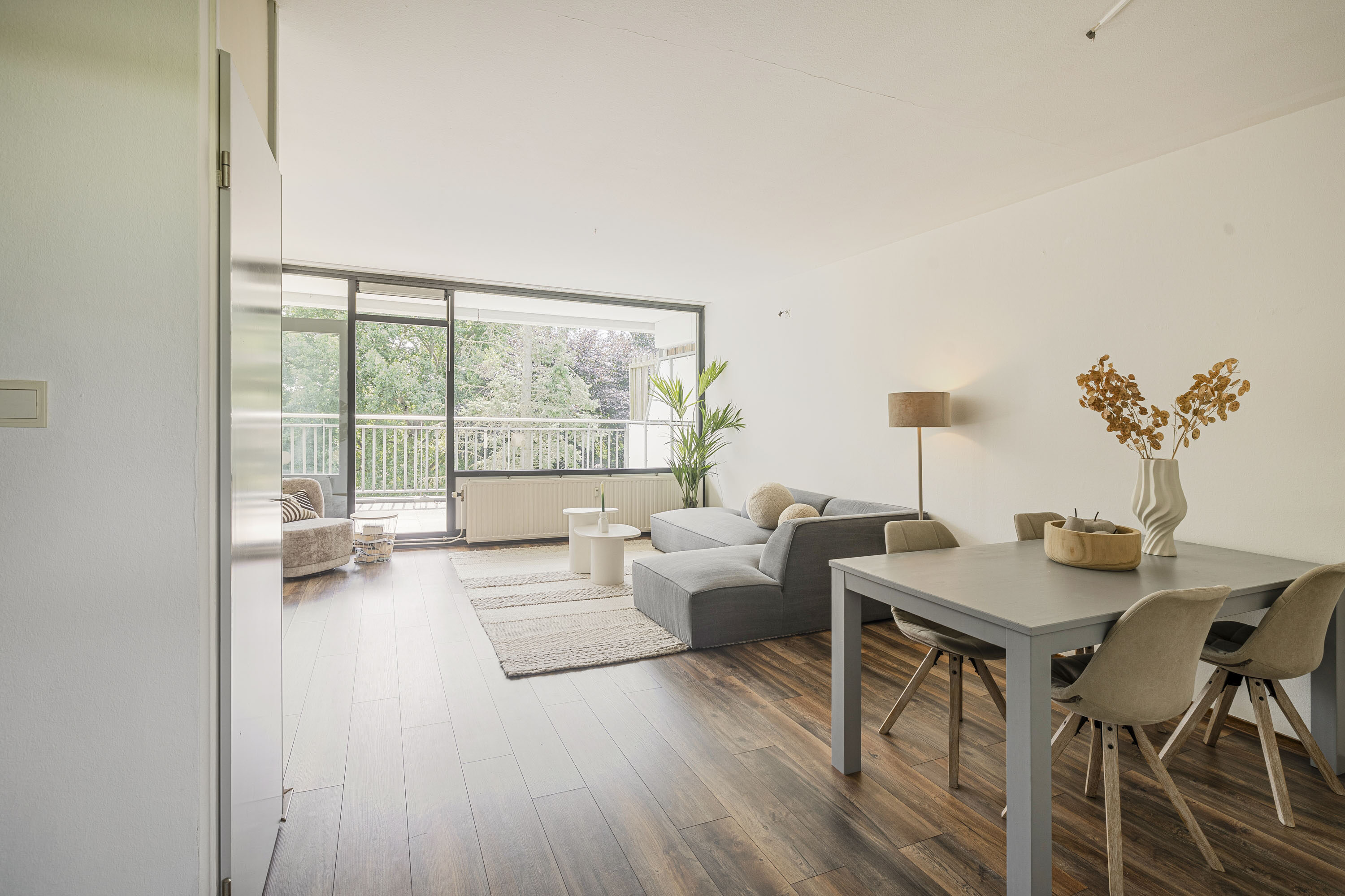 Bij binnenkomst kom je in de entree met een doorloop naar de hal, die toegang biedt tot meerdere vertrekken. De woonkamer van circa 29 m² is ruim en licht, dankzij de grote raampartijen die zorgen voor een prettige natuurlijke lichtinval. Vanuit de woonkamer heb je direct toegang tot het royale balkon van circa 27 m², gelegen op het zuiden. Hier kun je in alle rust genieten van het prachtige uitzicht en ontspannen in de zon.