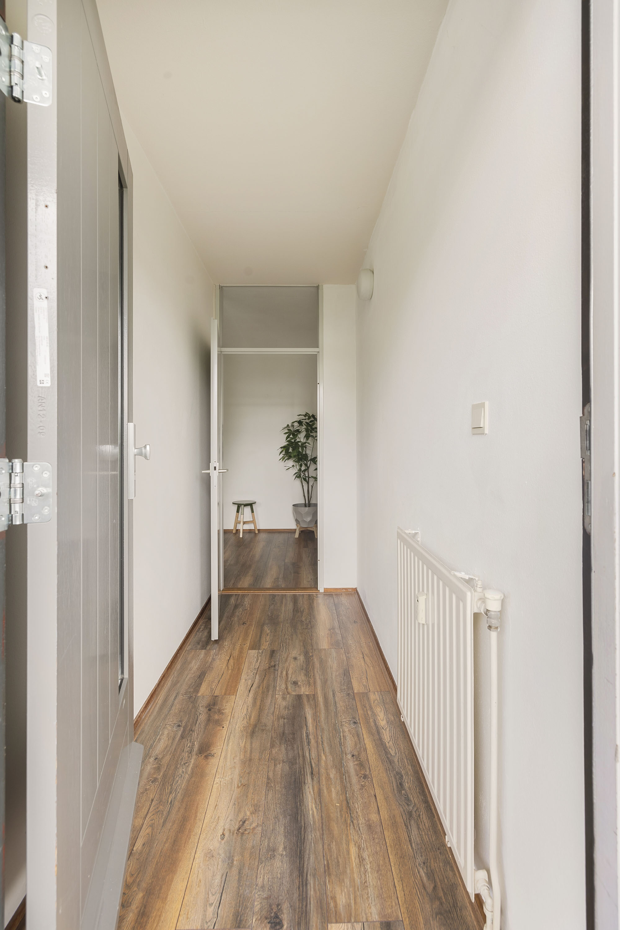 Vanuit de hal zijn de gesloten keuken, badkamer en het separate toilet bereikbaar.