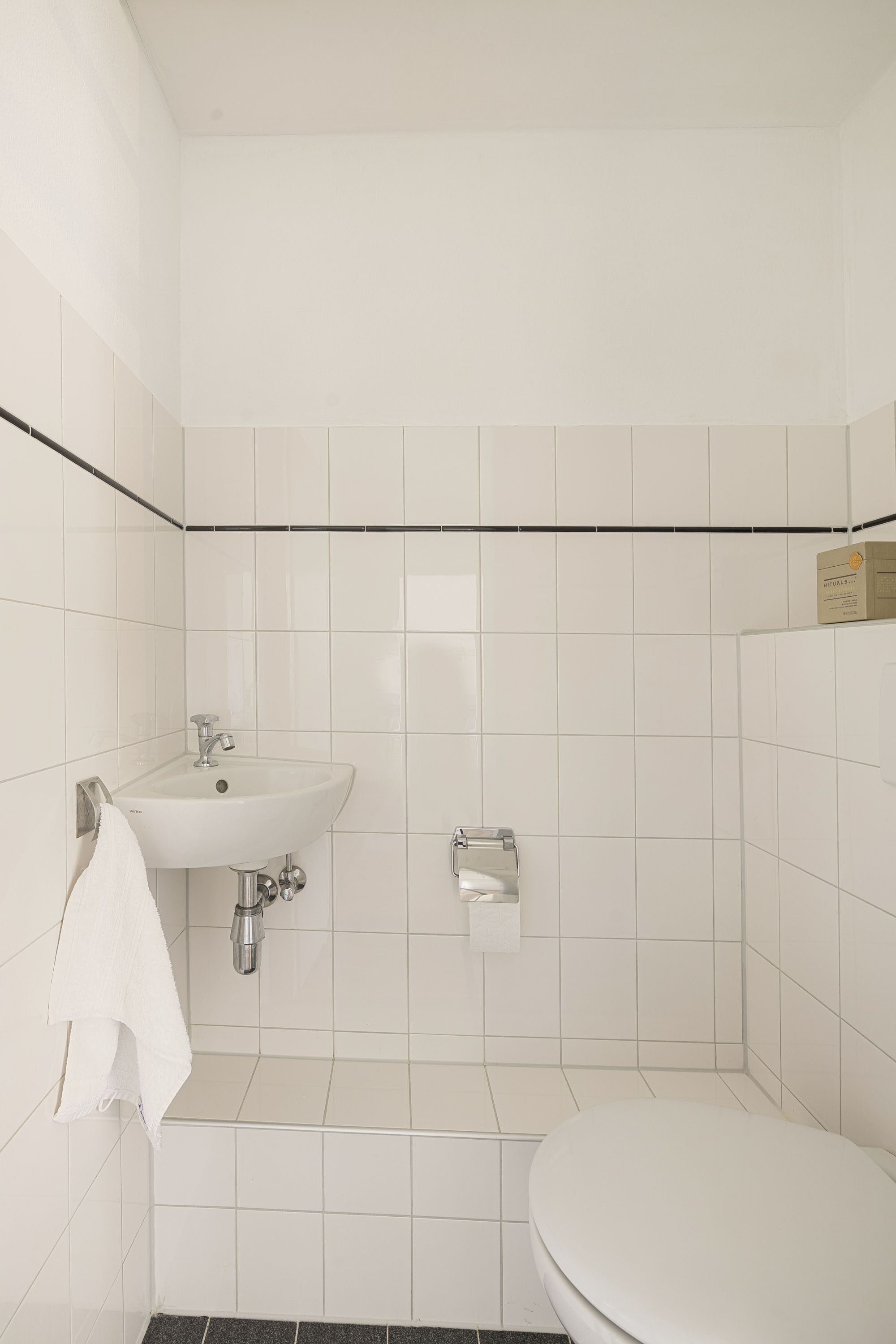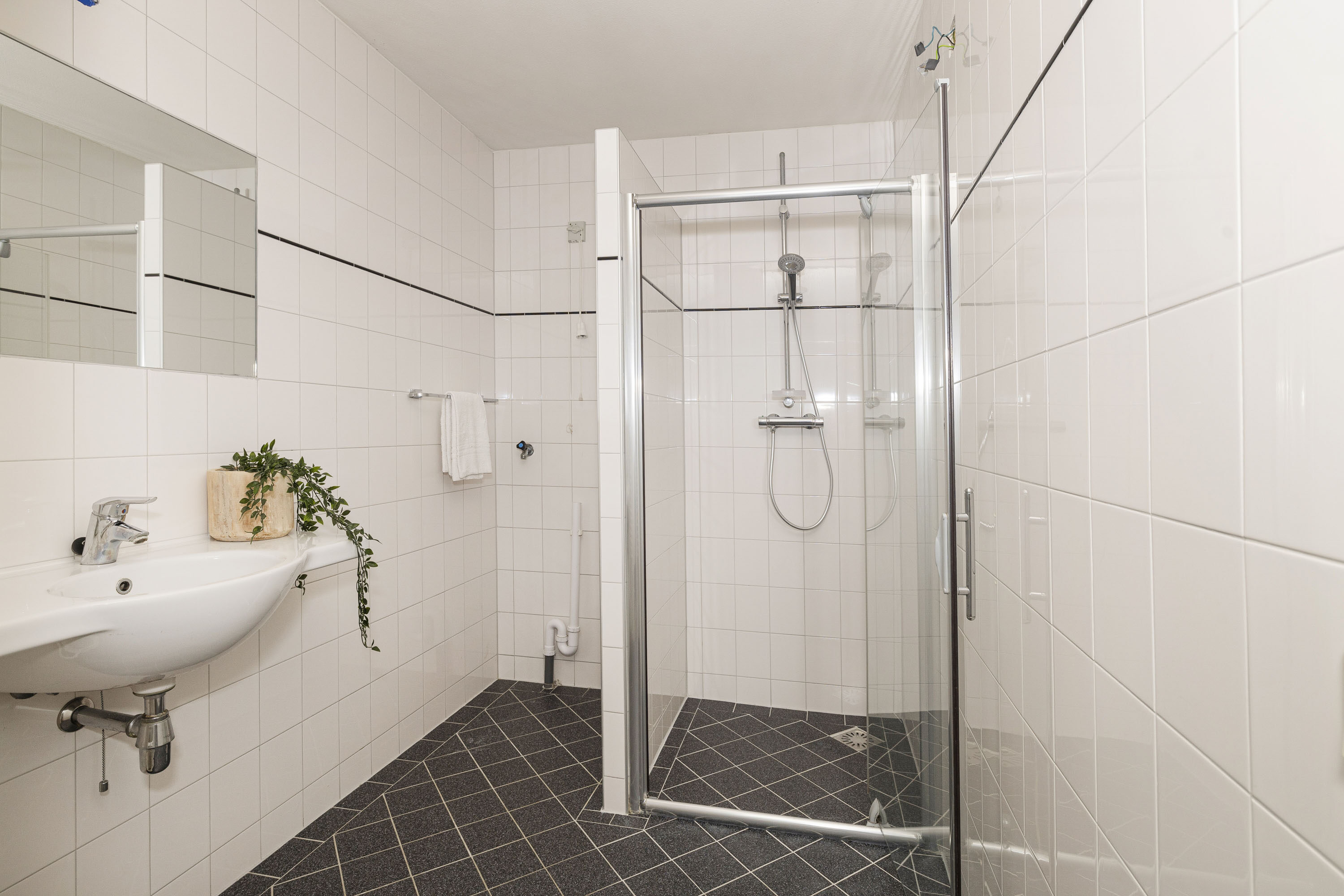De badkamer beschikt over een wastafel en een comfortabele douchecabine. In de badkamer bevindt zich ook de opstelplaats voor de wasmachine. Het separate toilet is uitgerust met een wandcloset en een fonteintje.