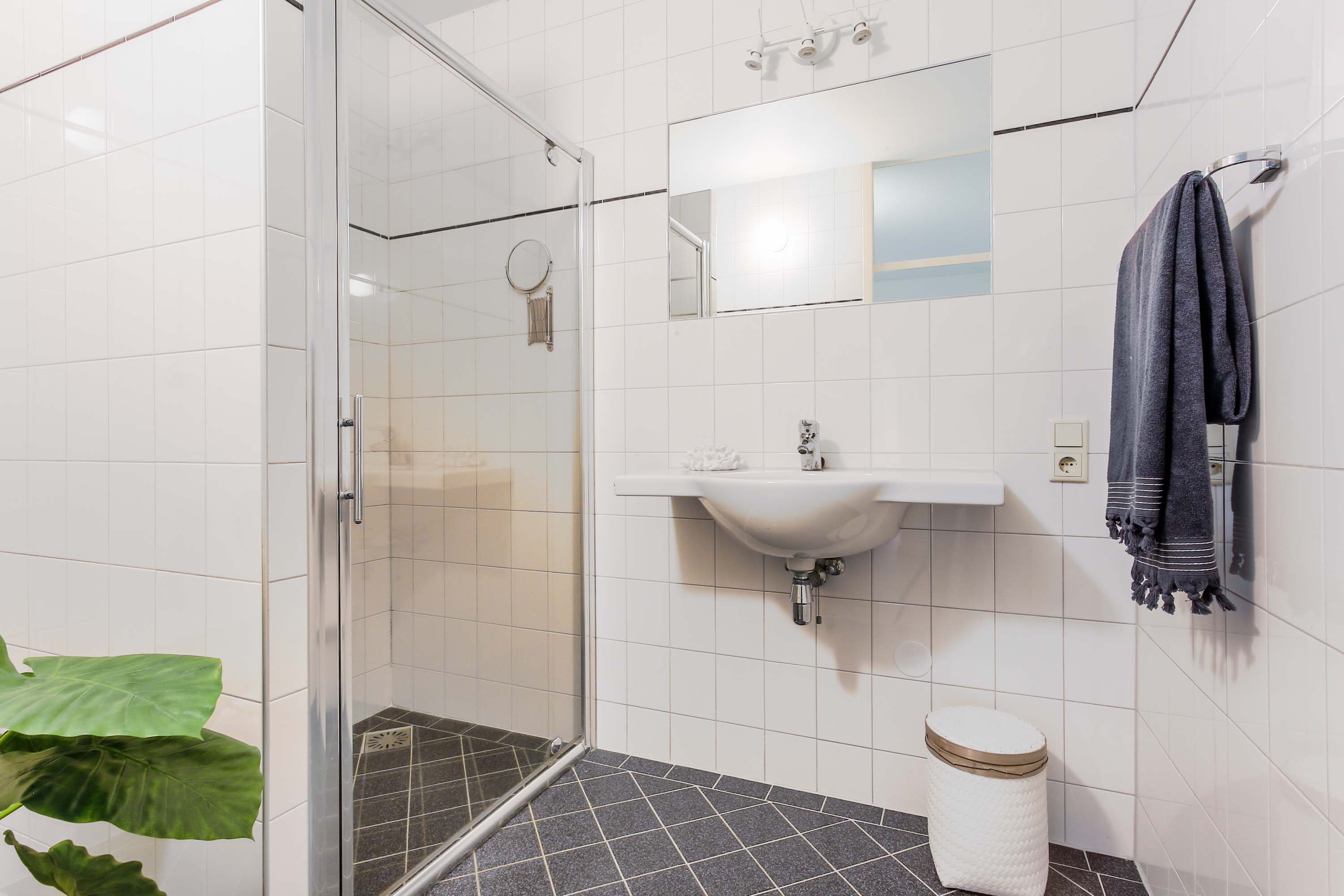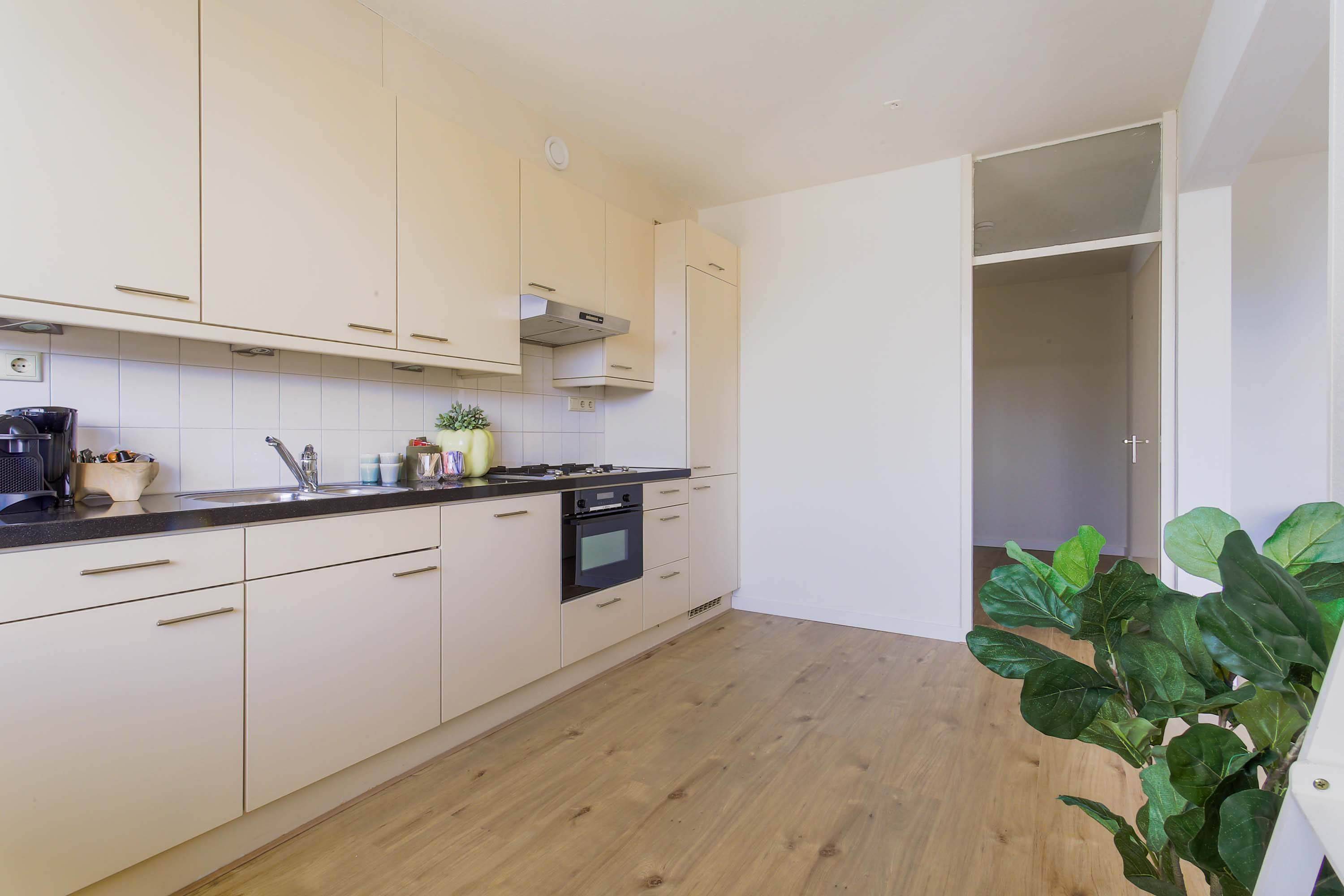 De half open keuken is modern ingericht, voorzien van inbouwapparatuur zoals een koelkast, oven en gasfornuis. De badkamer heeft een stijlvolle en eigentijdse uitstraling en beschikt over een inloopdouche en losse wastafel.