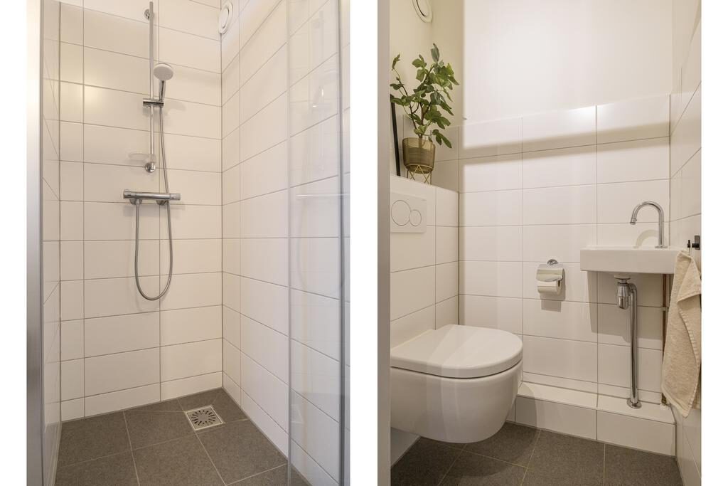 Eenmaal teruggekomen in de hal kom je bij de stijlvolle badkamer, deze is volledig licht betegeld, strak afgewerkt in 2020 en voorzien van een inloopdouche, wastafel en een raam voor natuurlijk licht en ventilatie. Ook is er een wasmachine aansluiting.
