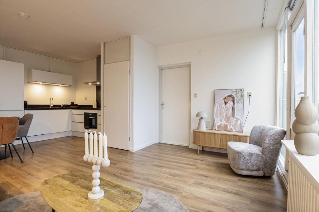 De ruime woonkamer met grote raampartijen op het zuidwesten, zorgen voor een overvloed aan daglicht en is de woonkamer een heerlijke plek om te ontspannen na een lange werkdag. Vanuit de woonkamer heb je uitzicht over het zonnige balkon (14m2) welke gelegen is op het zuidwesten en waar je tot in de laatste uurtjes kunt genieten van de zon!