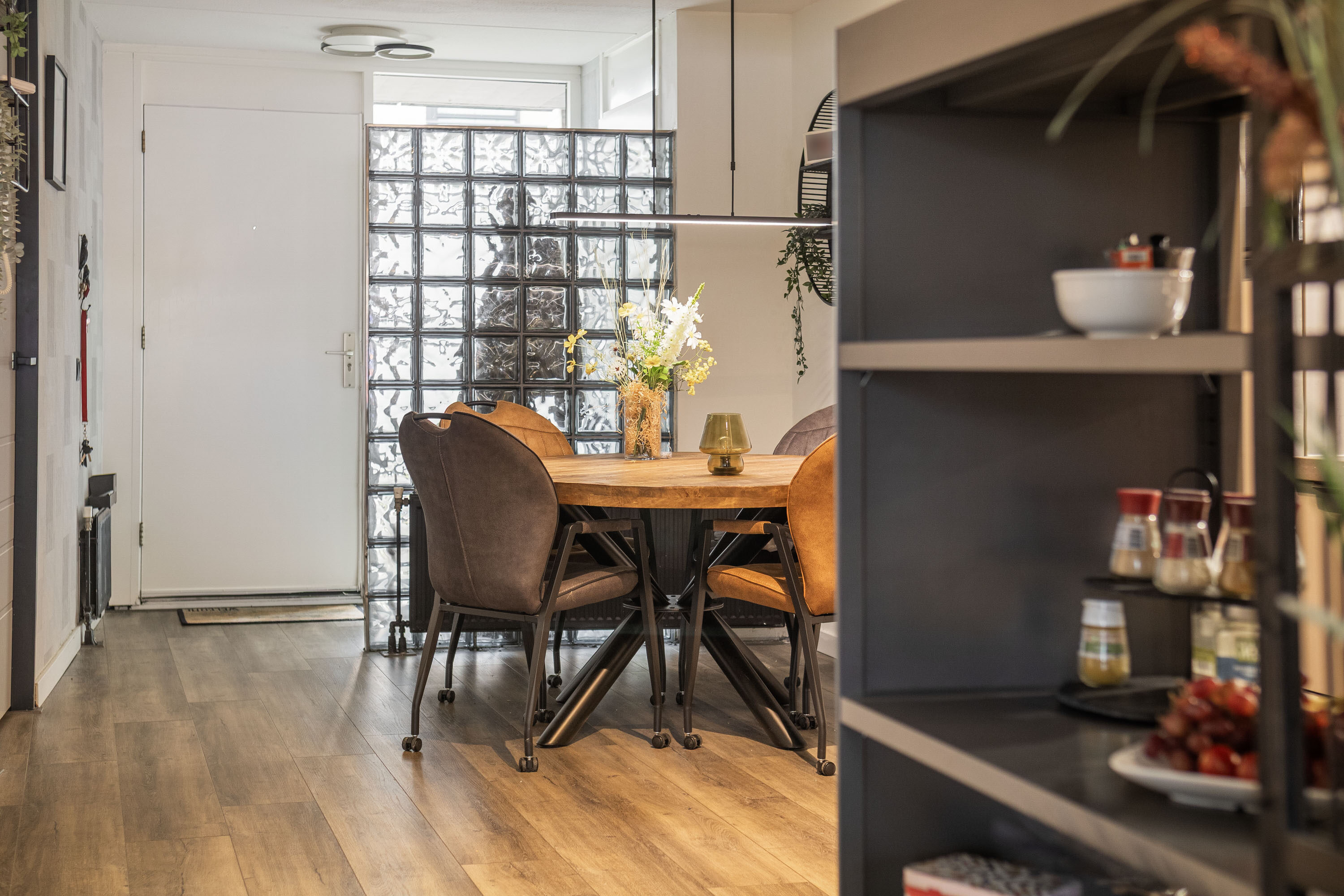 Aan de woonkamer grenst de schuifpui die leidt naar het balkon.