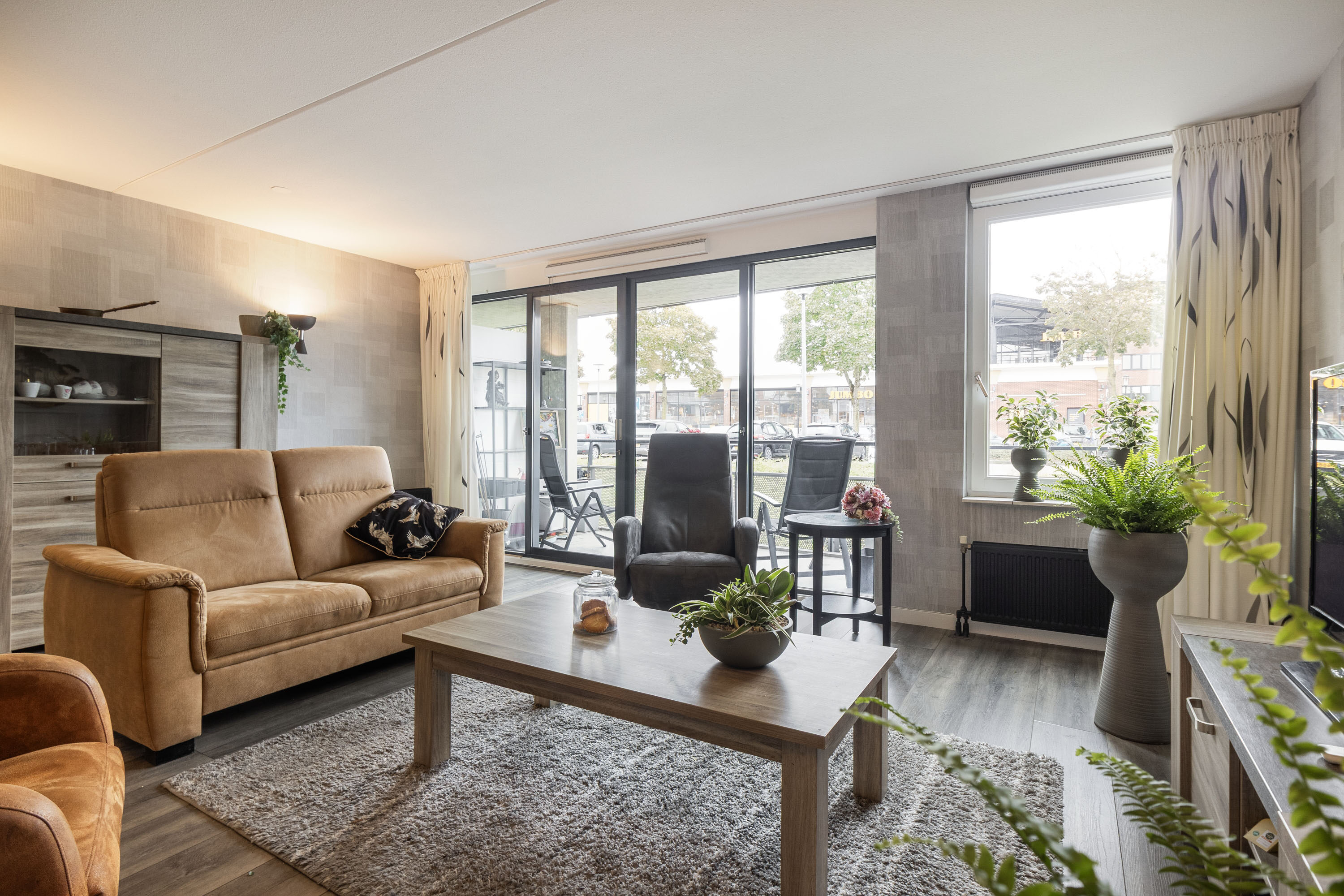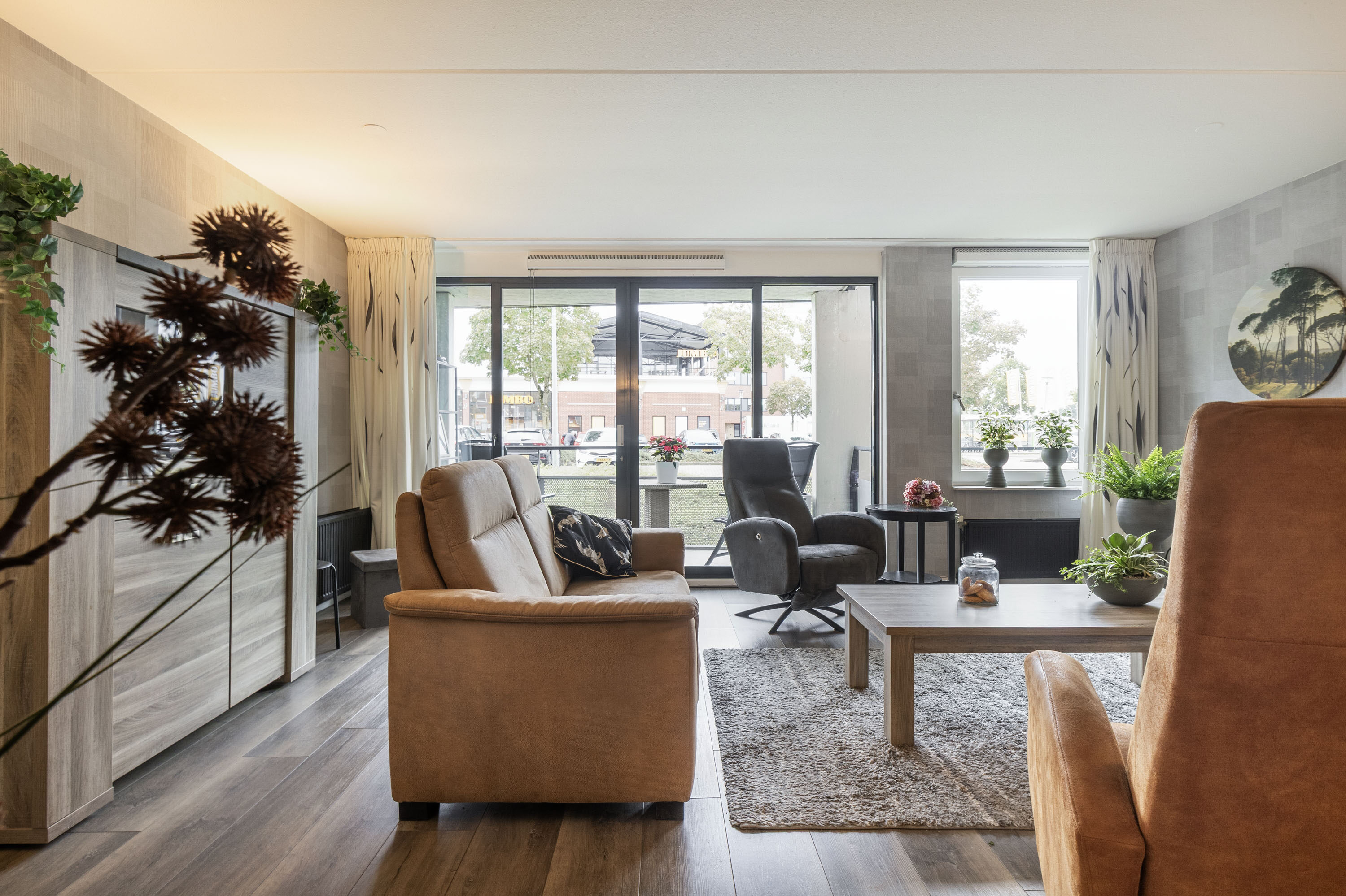 De woonkamer is ruim opgezet en circa 40 m² groot. Door de diverse raampartijen is er veel natuurlijk licht in het appartement aanwezig.