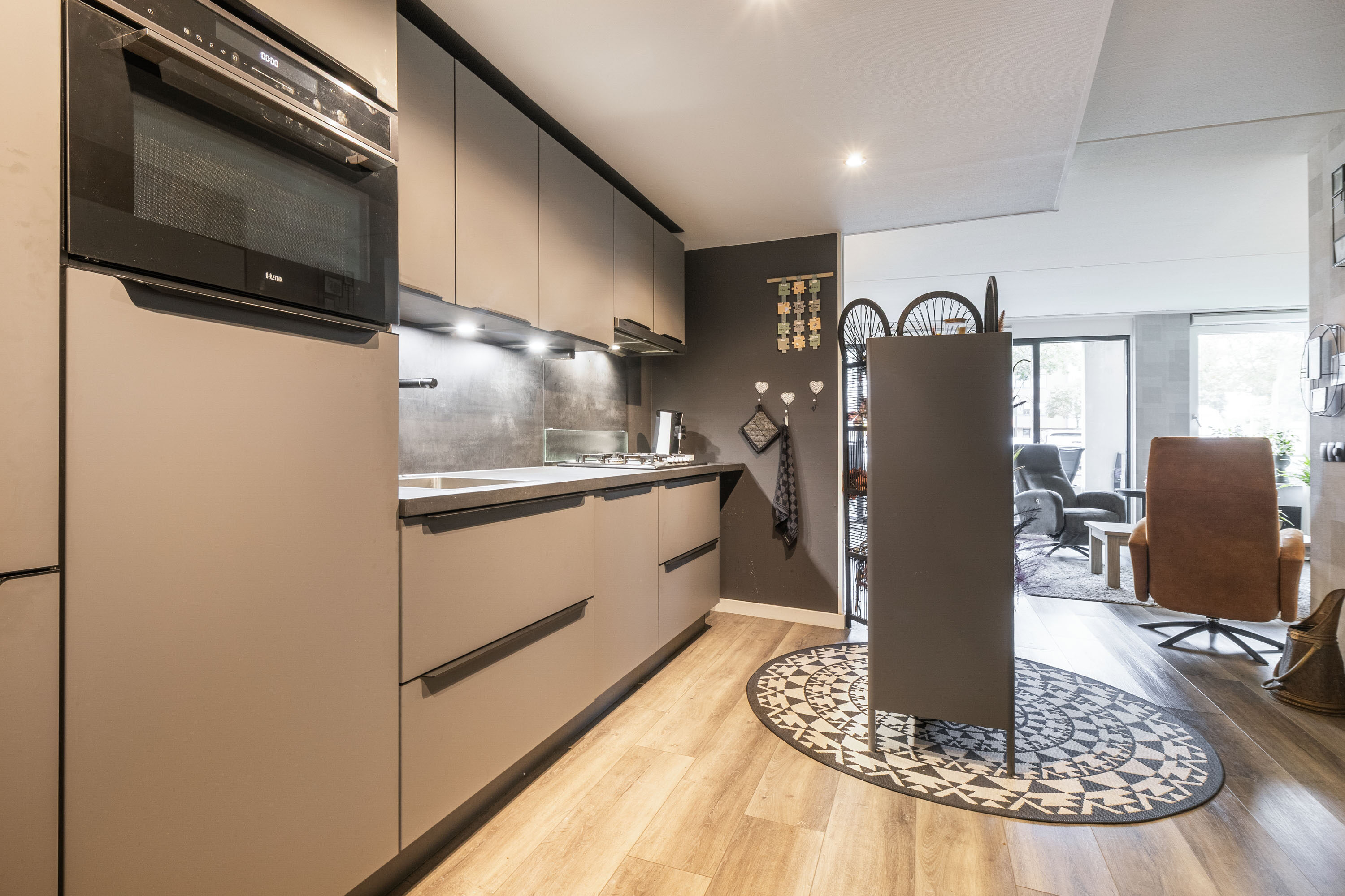 Bij binnenkomst kom je in de ruime halfopen keuken uitgerust in een warme grijze kleur, die is voorzien van moderne inbouwapparatuur waaronder een koelkast, vaatwasser, oven , afzuigkap en een en 5-pits-gasfornuis.
