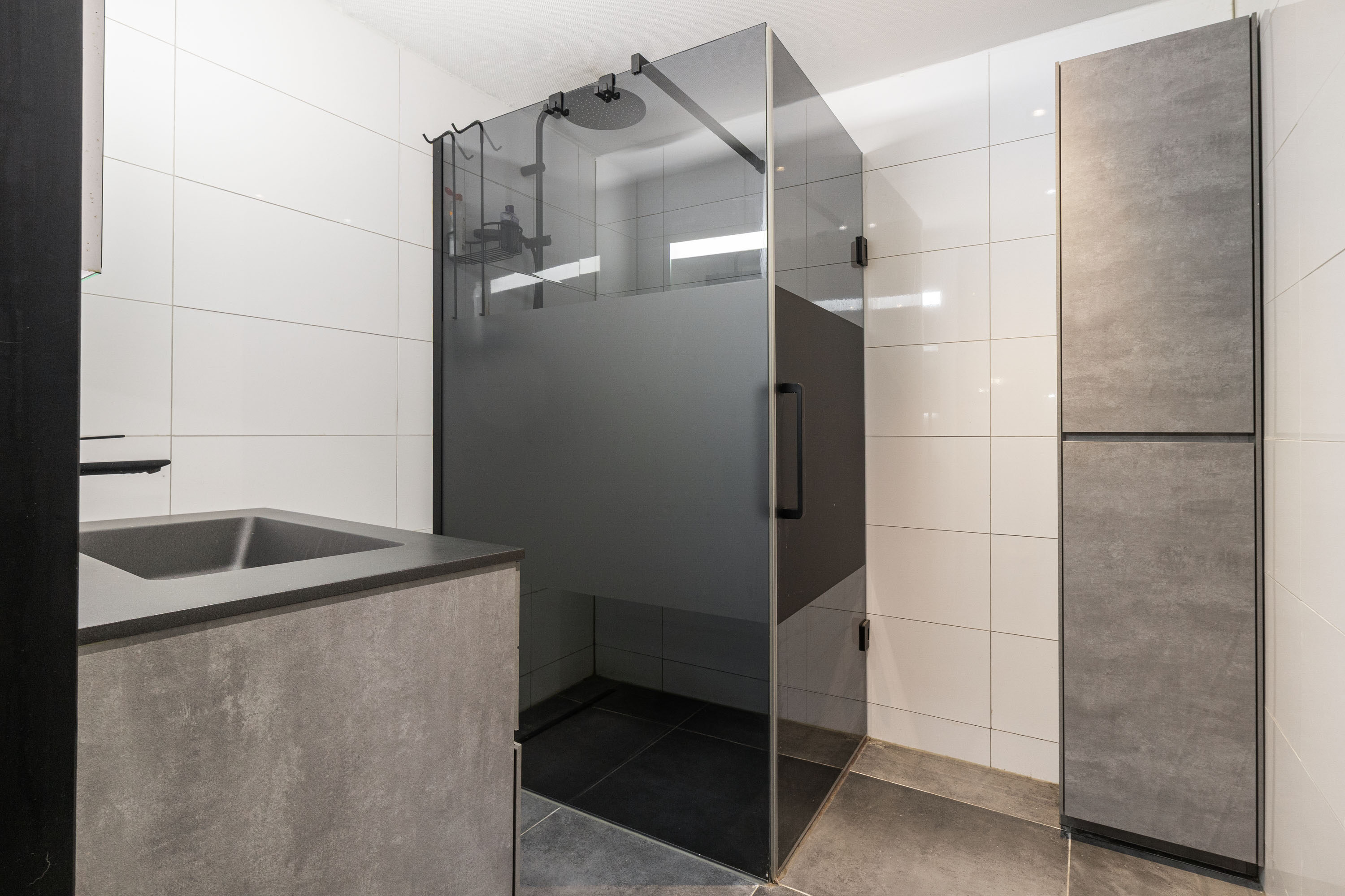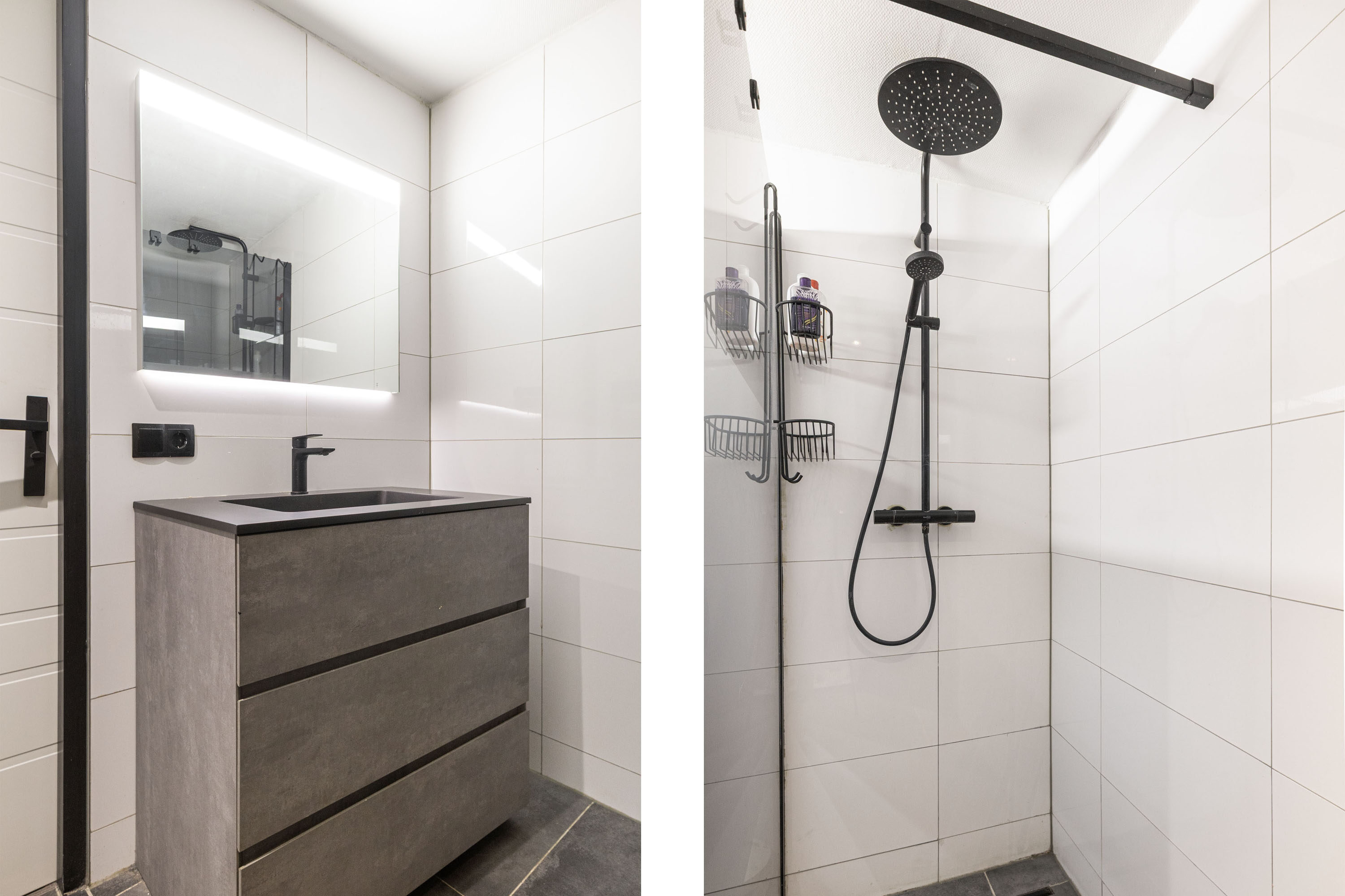 De badkamer is uitgevoerd in moderne stijl met een douche en wastafelmeubel, de badkamer is voorzien van zwarte accenten.