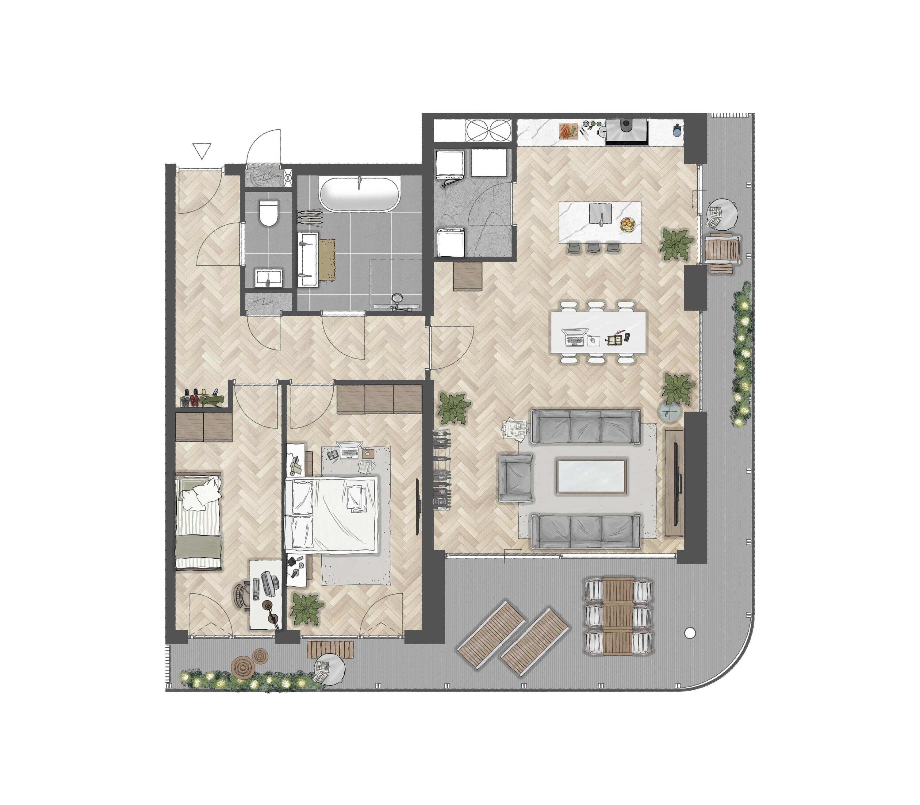 Dit type appartement is zowel aan de zuidoost- als zuidwestkant van het complex gelegen en is uitermate geschikt voor buitenmensen. Het terras buigt om het appartement, zodat u zowel op het zuiden als het oosten c.q. westen -afhankelijk van welk appartement uw voorkeur heeft- buiten kunt zitten. Het terras biedt door de royale afmetingen ruim voldoende ruimte om naast een loungeset en eettafel het terras aan te kleden met bloemen en planten. Deze appartementen hebben ook een zeer lichte woonkamer door het vele glas in de gevel.