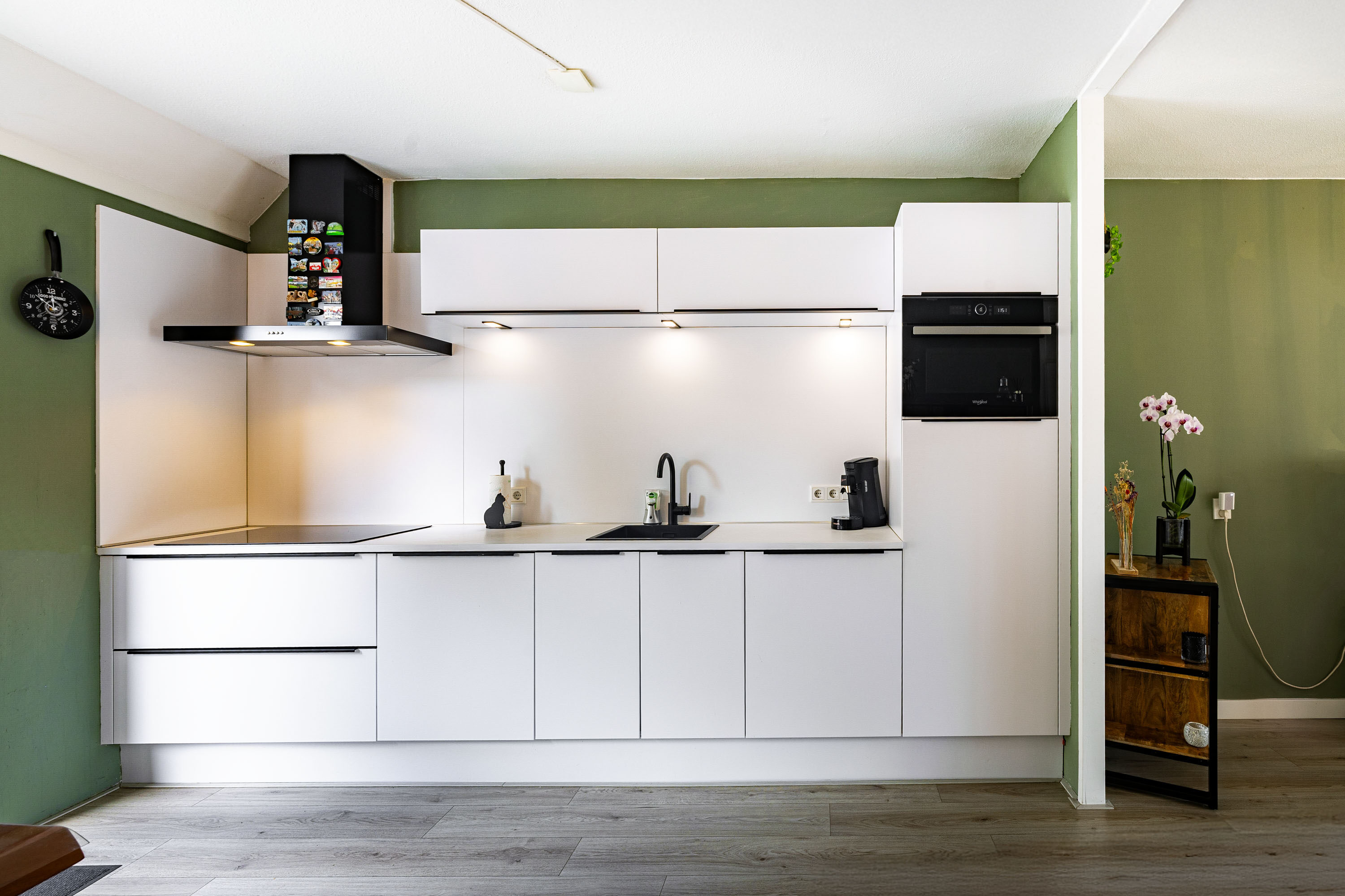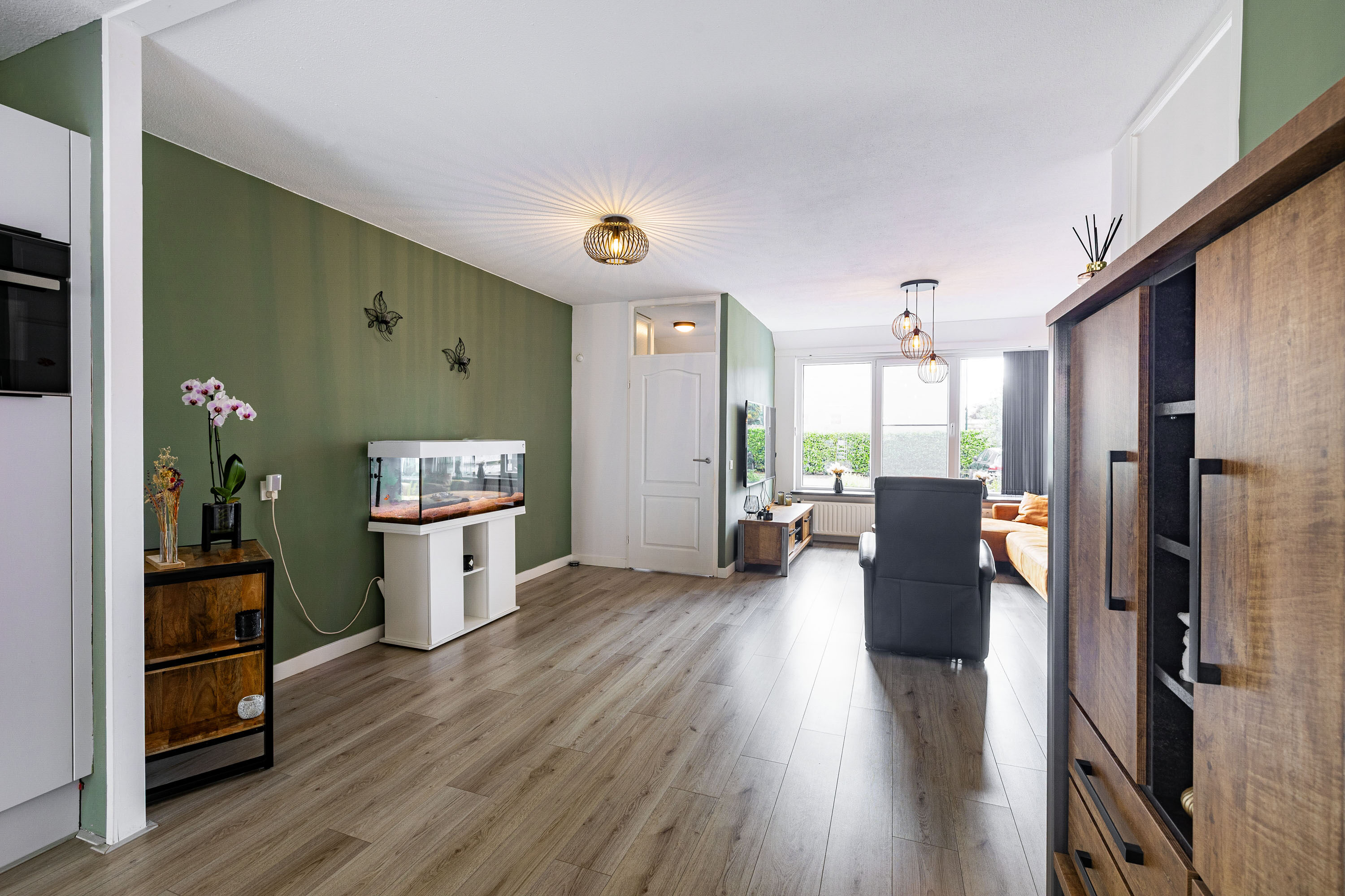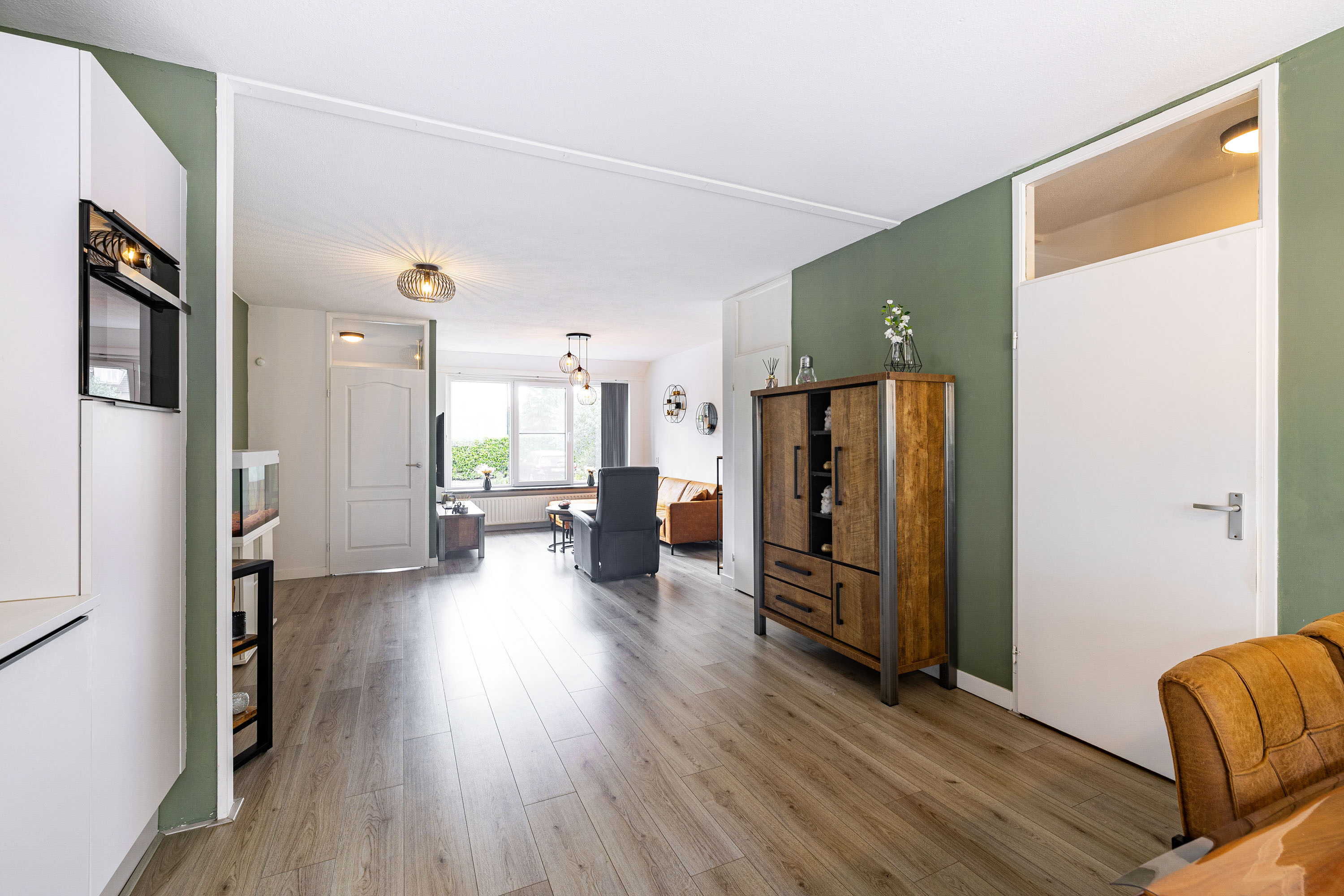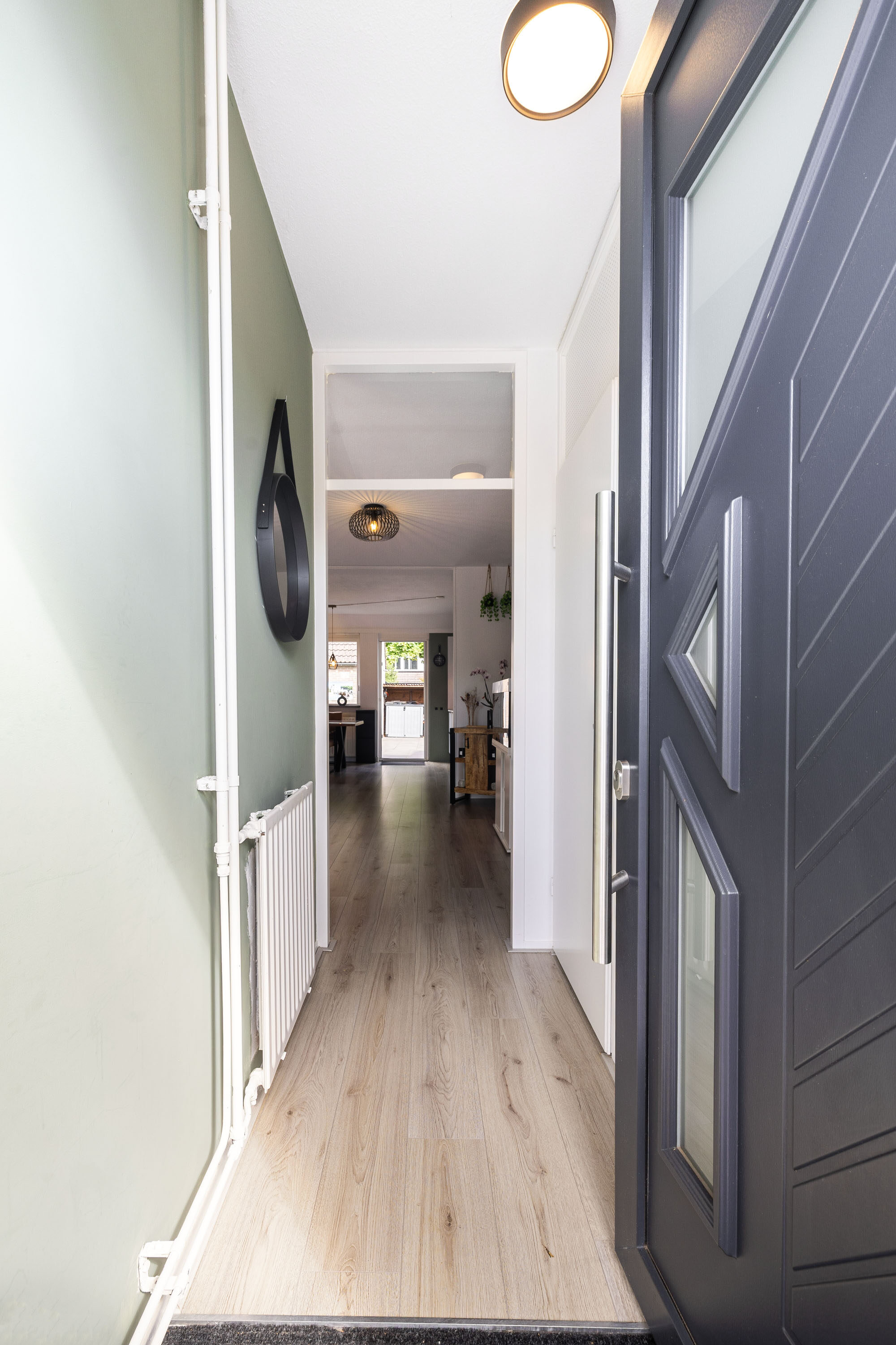 Hal/entree met meterkast en toegang tot de woonkamer. De woonkamer is licht en ruim dankzij de grote raampartijen en beschikt over een praktische trapkast. De moderne keuken (2022) is eigentijds ingericht en biedt alle ruimte en comfort. Via de keuken bereik je de tussenhal met trapopgang en het toilet met fonteintje. De keuken is uitgerust met onder andere een koelkast met vriesvak, combi oven, vaatwasser, inductie kookplaat en afzuigkap.