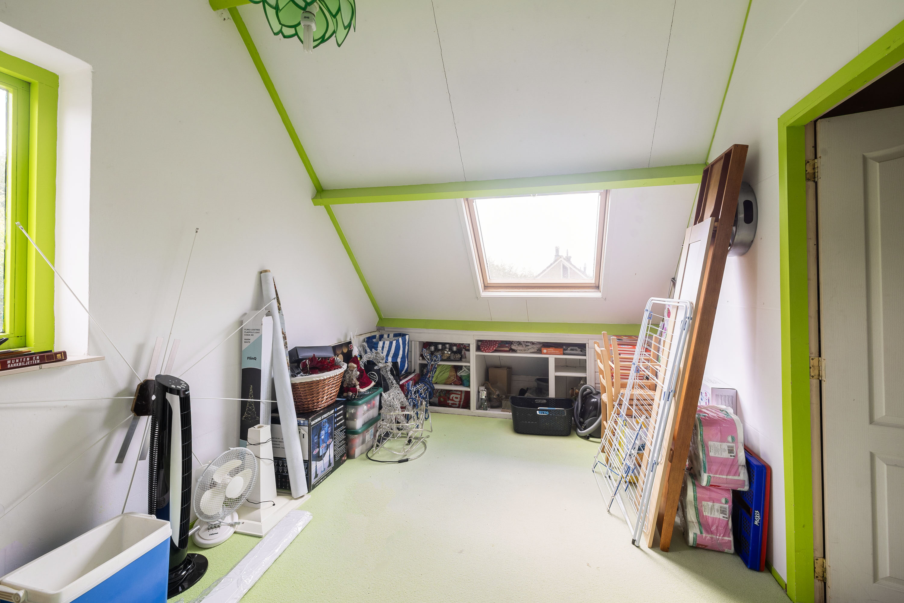 Via een vaste trap bereik je de voorzolder met cv-installatie en zonneboiler. Hier bevindt zich tevens de vierde slaapkamer, die veel daglicht krijgt door een raam in de zijgevel en een Velux dakraam.