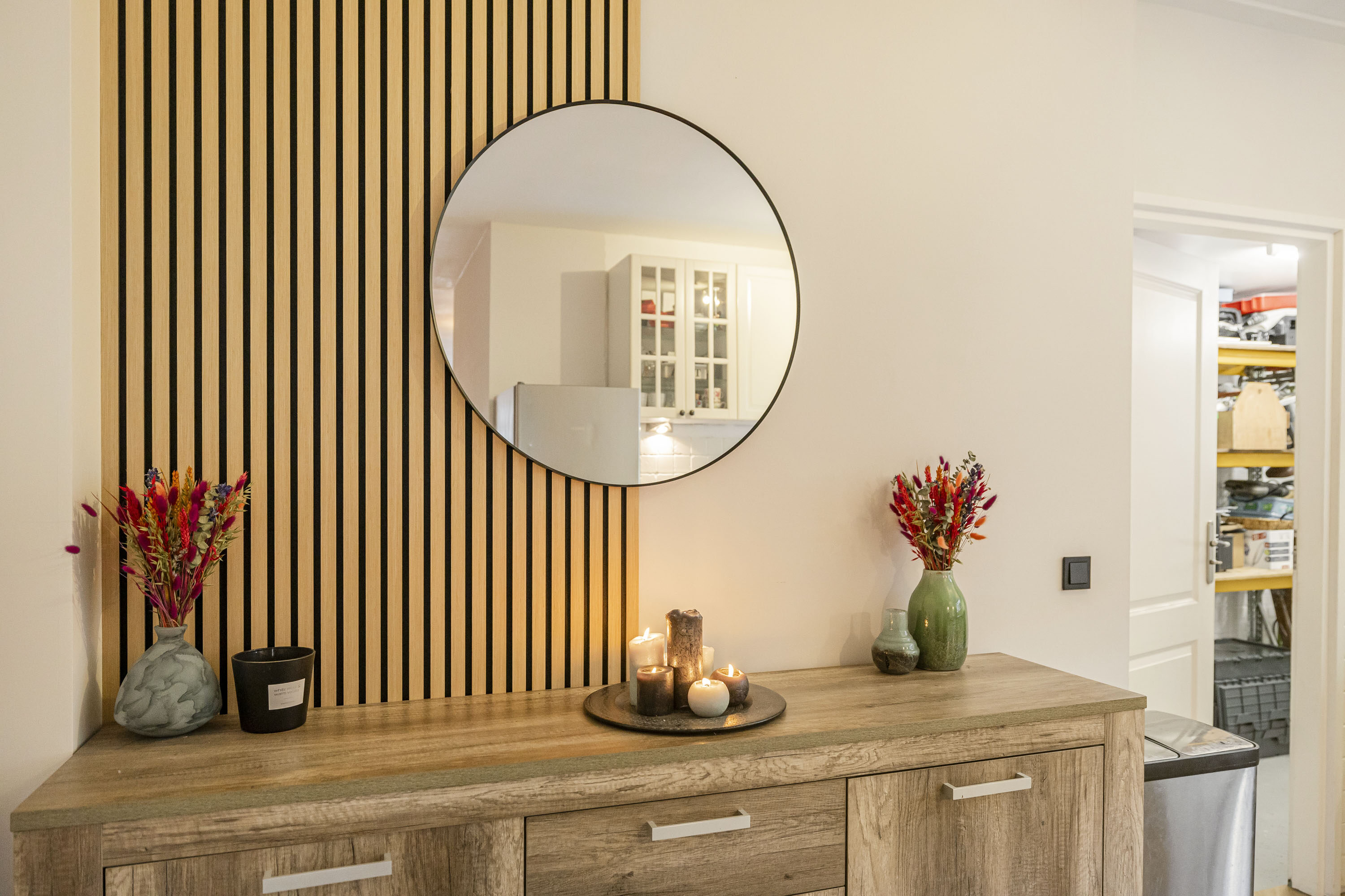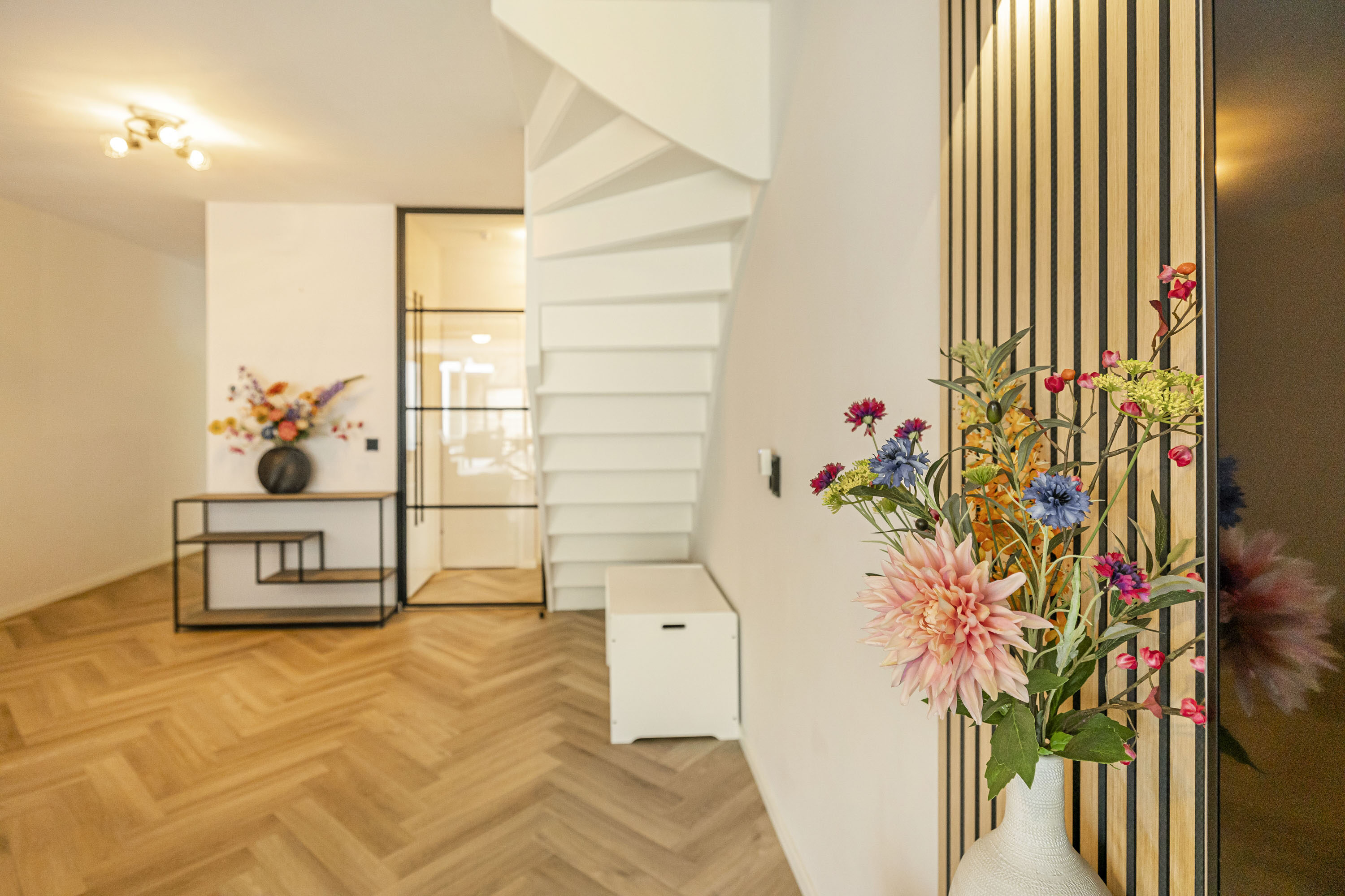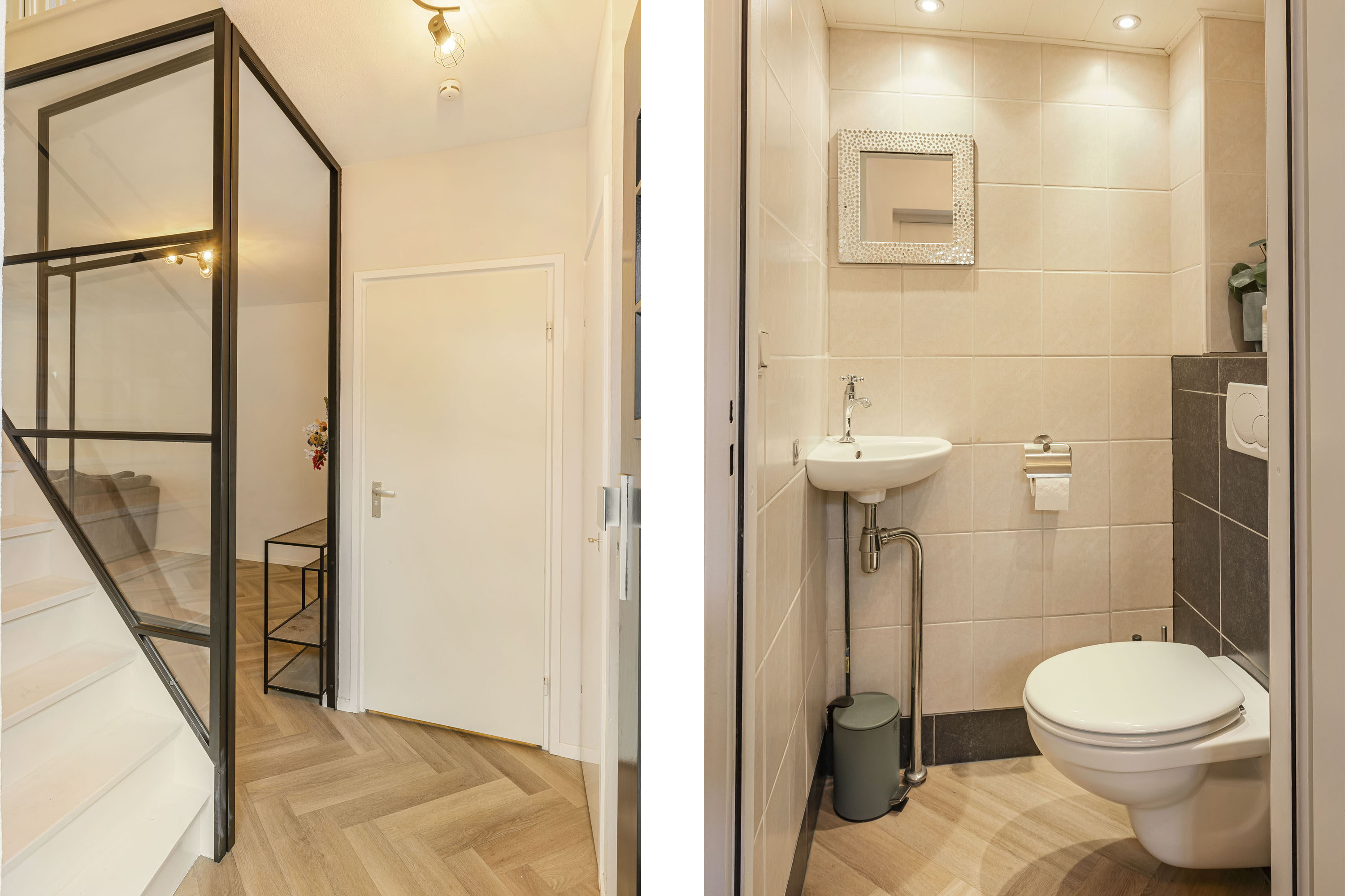 Via de carport en de beschutte binnenplaats bereik je de entree van de woning. In de hal is ruimte voor een garderobe, tref je de vernieuwde meterkast (2023), een moderne toiletruimte met hangend toilet en de trapopgang naar de eerste verdieping.