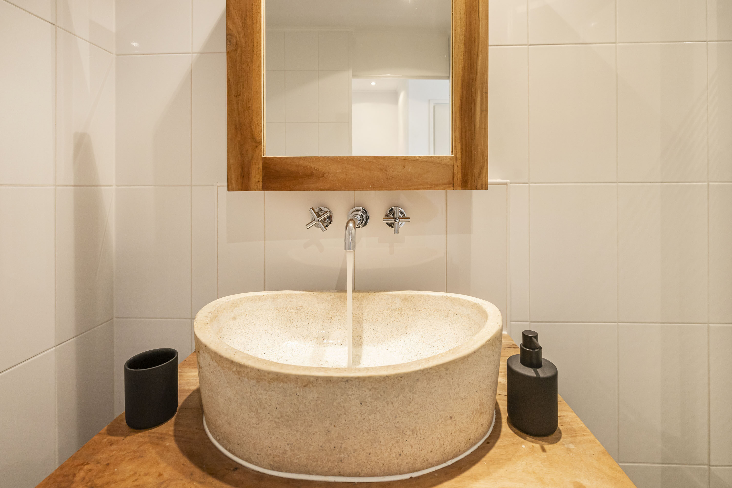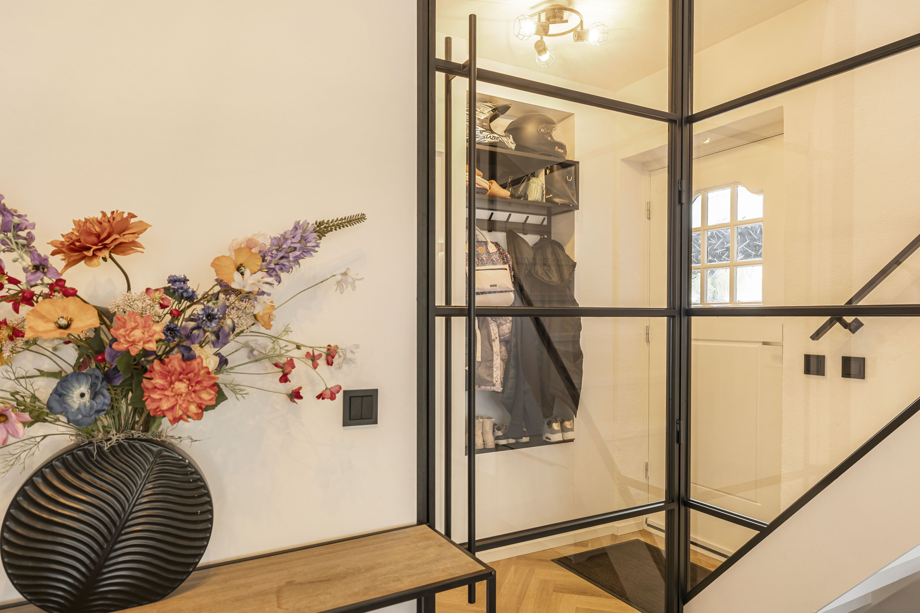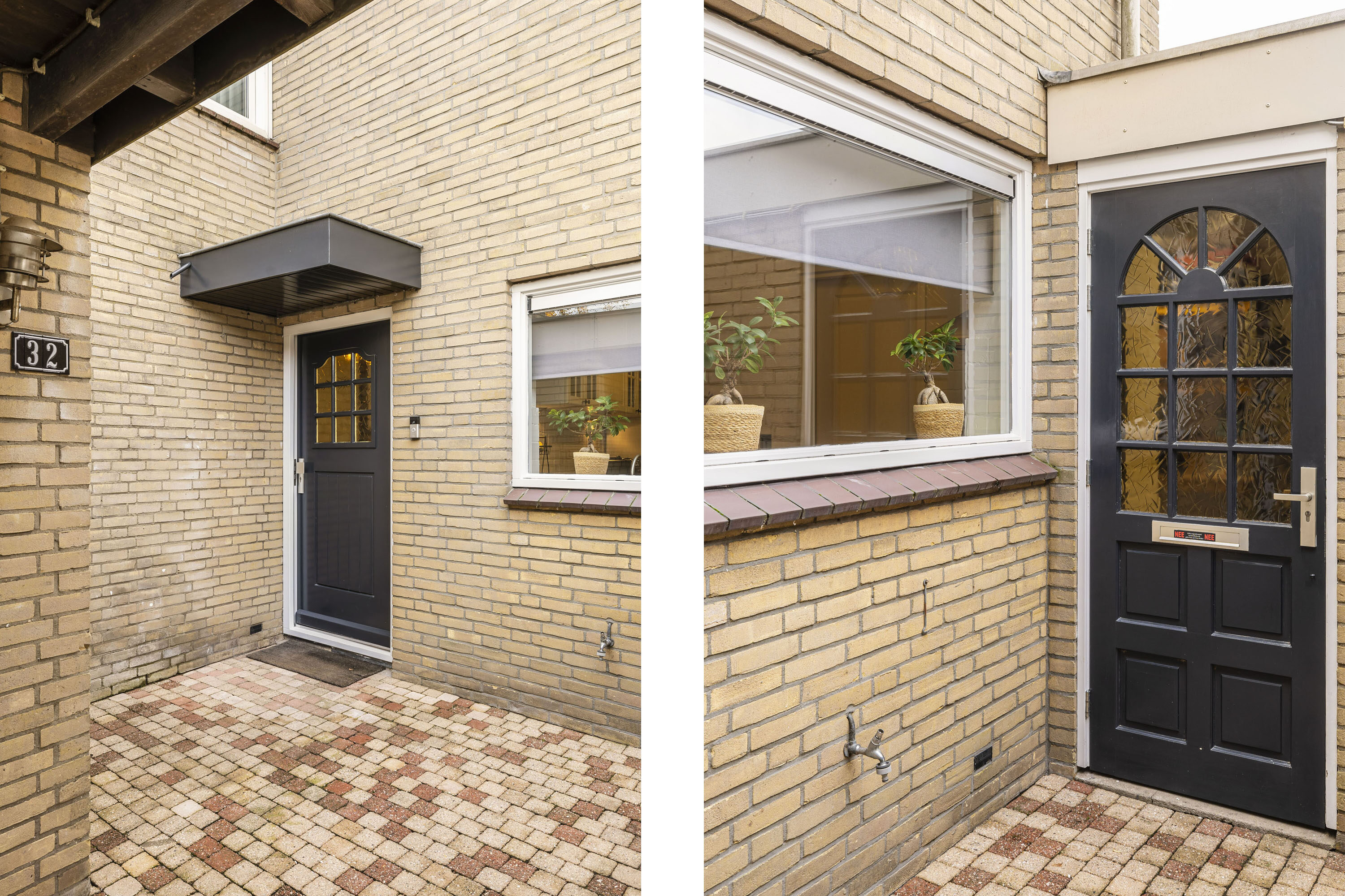 Via de carport en de beschutte binnenplaats bereik je de entree van de woning. In de hal is ruimte voor een garderobe, tref je de vernieuwde meterkast (2023), een moderne toiletruimte met hangend toilet en de trapopgang naar de eerste verdieping.