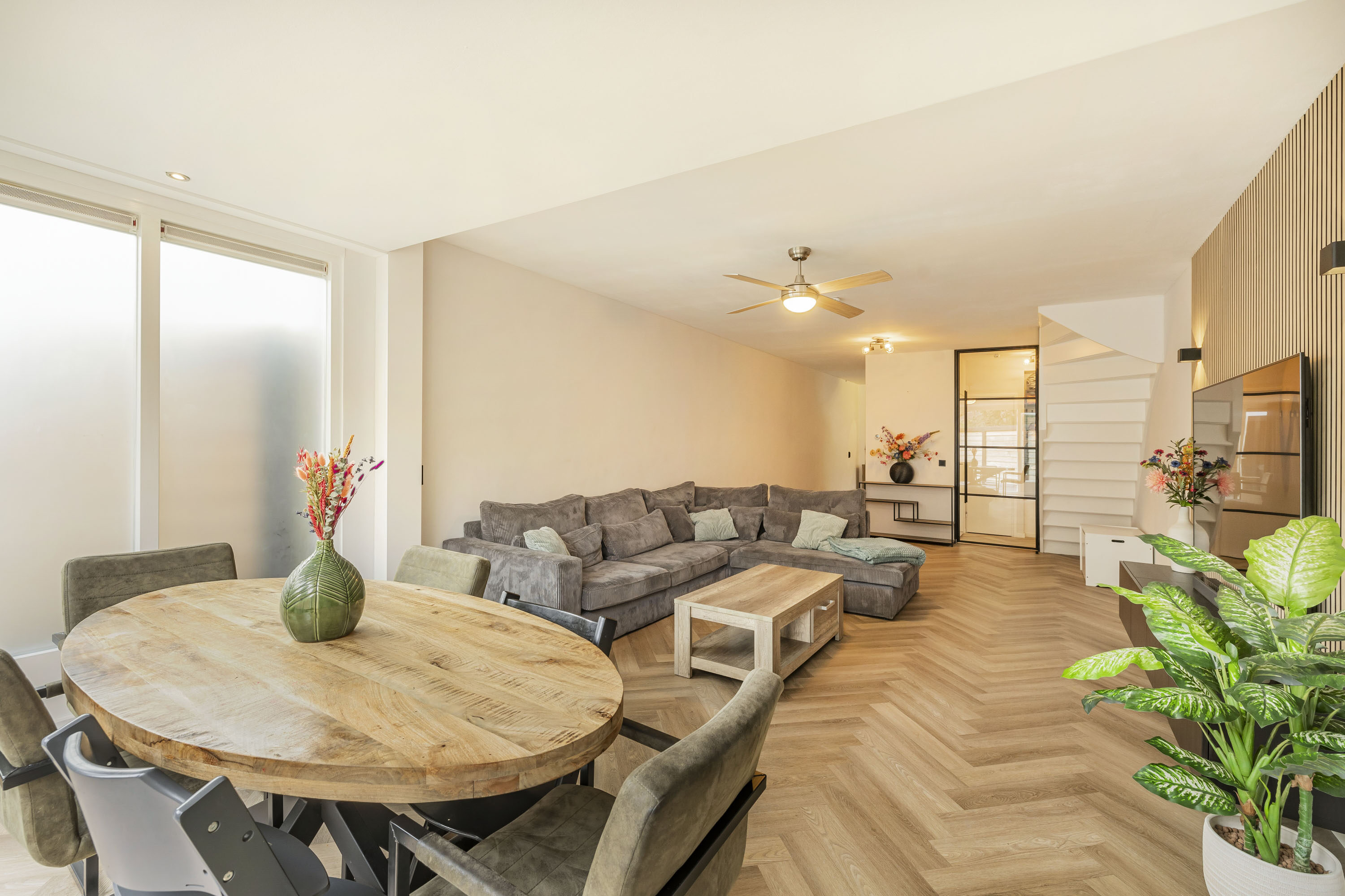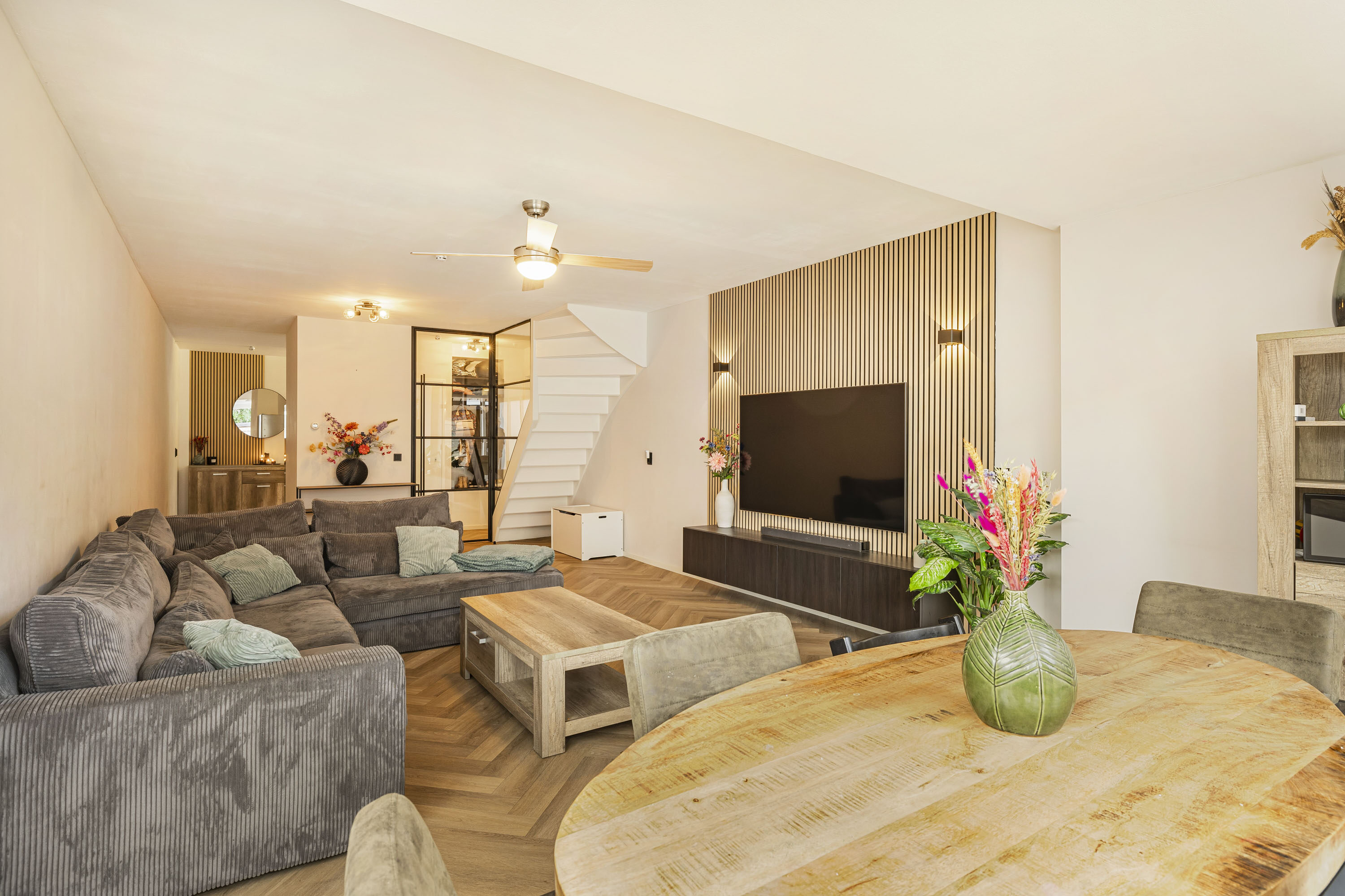 De royale en lichte woonkamer is toegankelijk via een stijlvolle stalen taatsdeur. De ruimte is afgewerkt met een PVC-vloer met vloerverwarming en strak gestucte wanden. In de uitbouw aan de achterzijde zorgen sfeervolle inbouwspots en openslaande deuren naar de tuin voor een prettige ambiance.