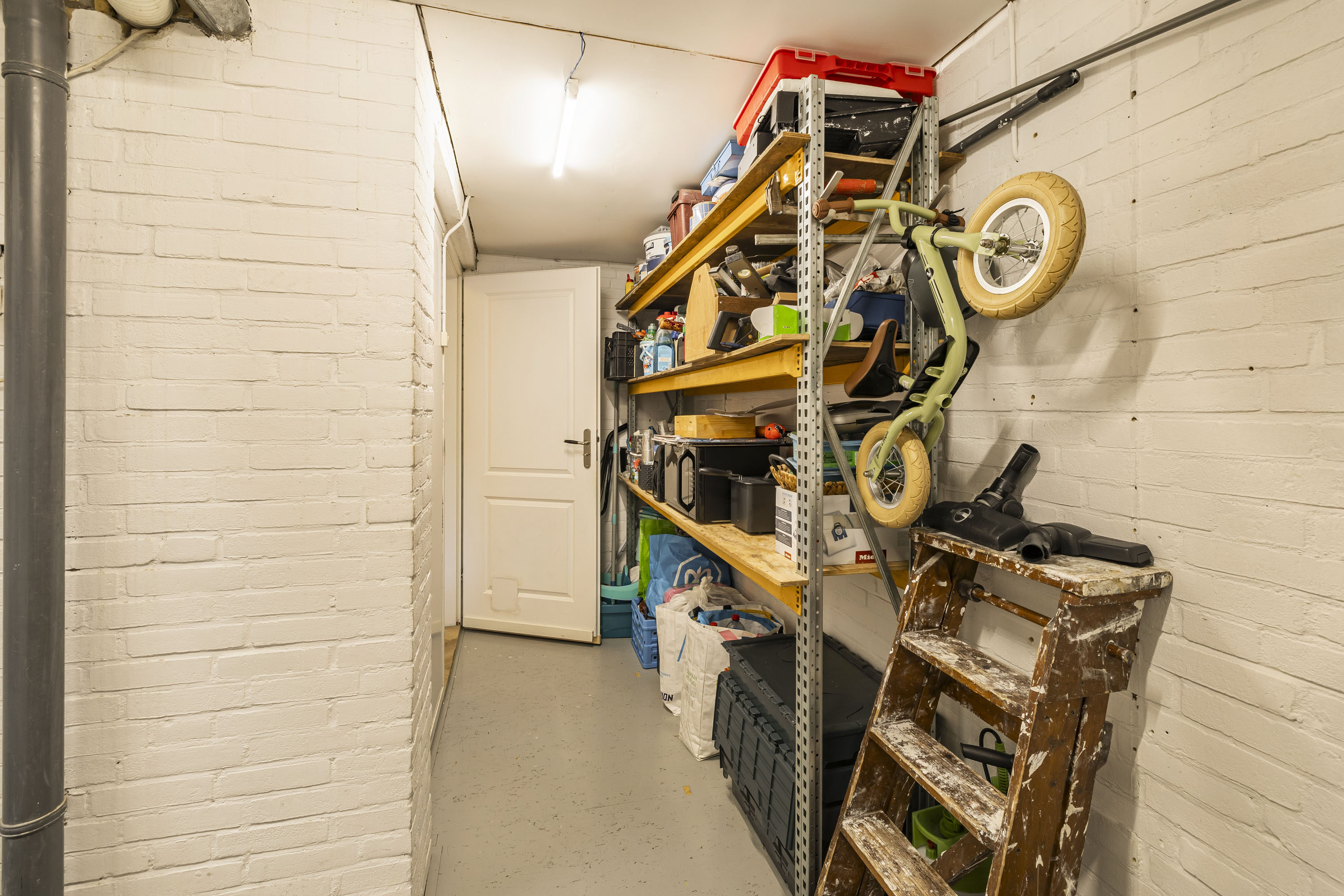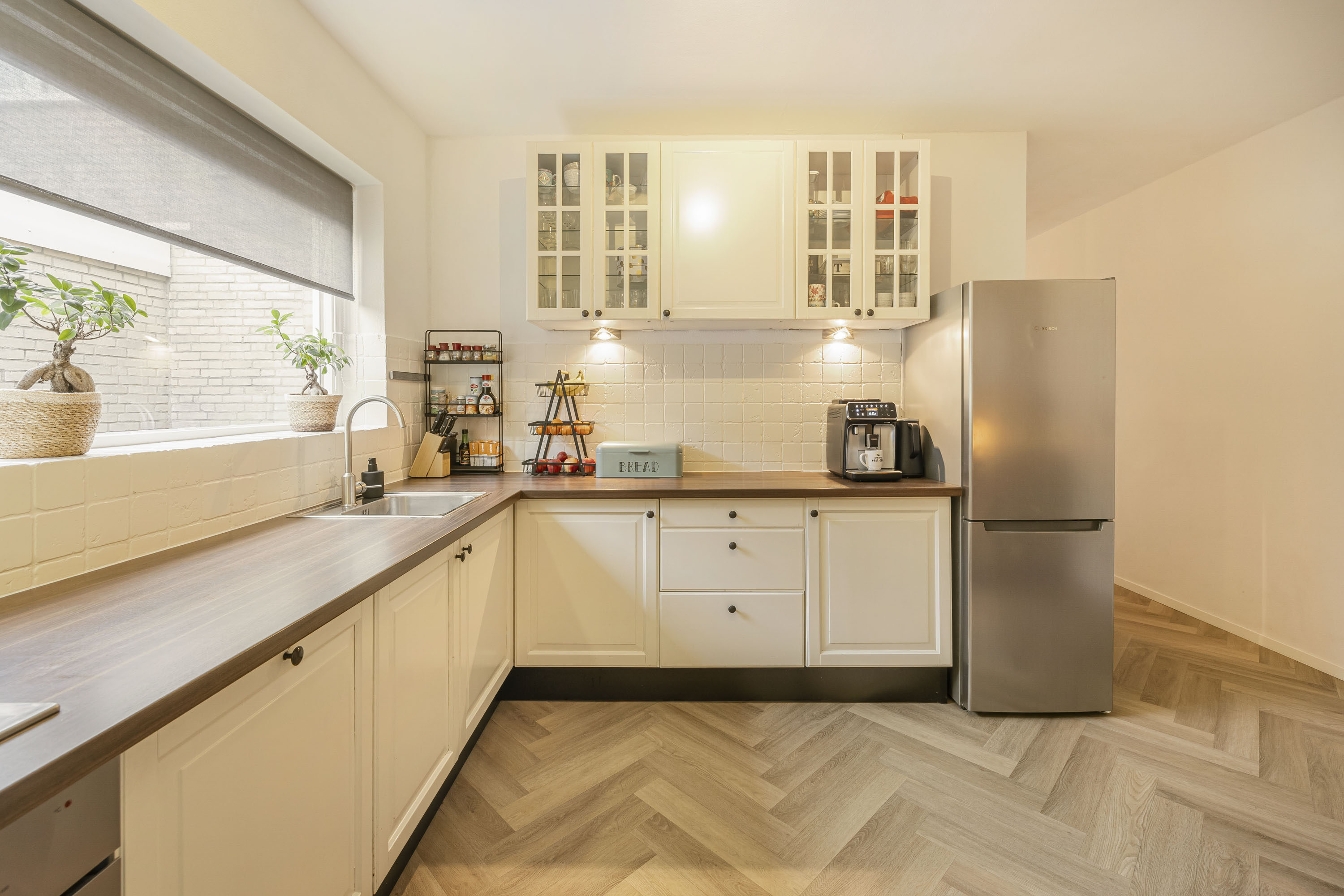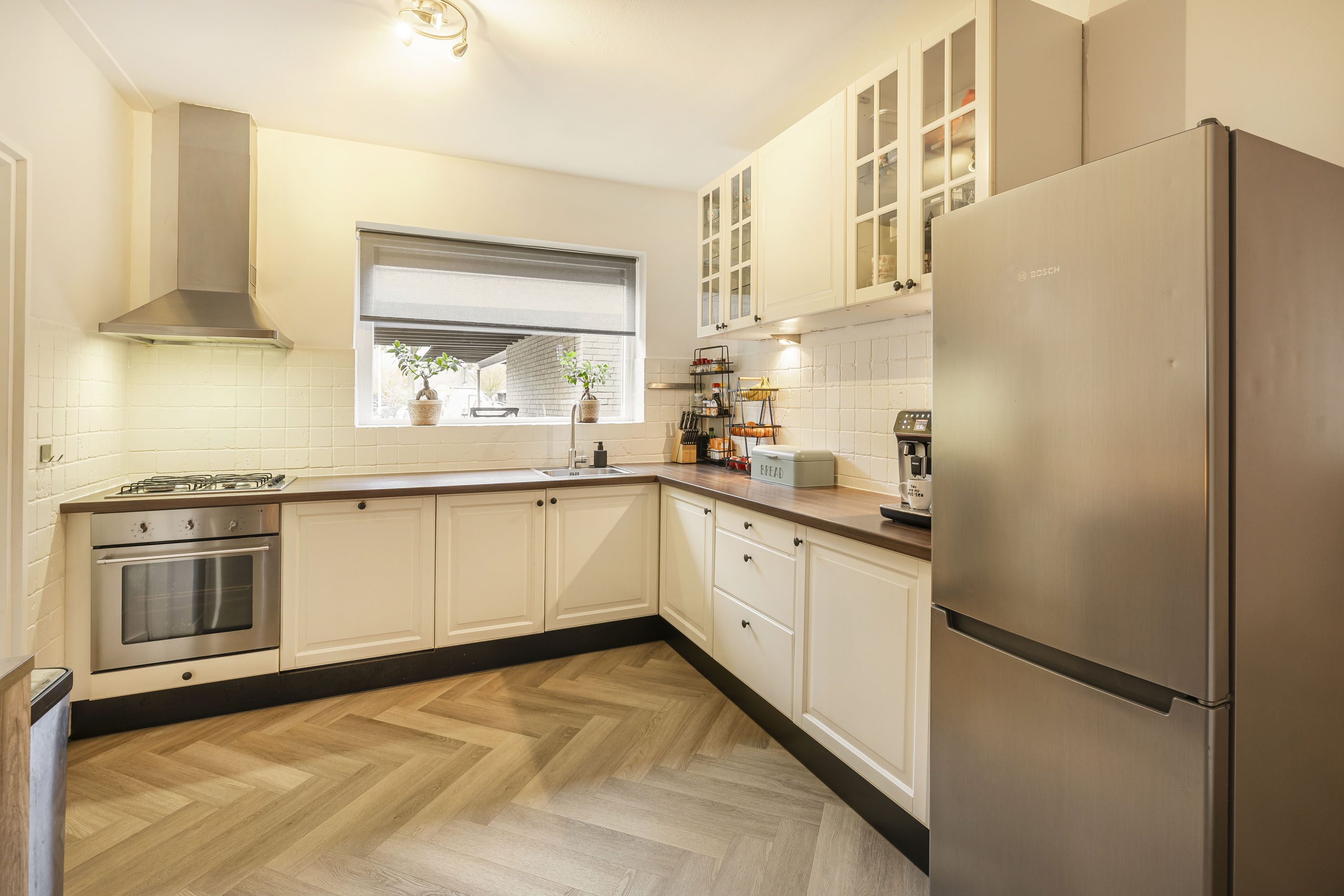 De halfopen keuken is uitgevoerd in een lichte kleurstelling met een donker werkblad en voorzien van diverse inbouwapparatuur, waaronder een 4-pits kookplaat, afzuigkap, oven en vaatwasser. Vanuit de keuken is er directe toegang tot de inpandige berging, ideaal voor extra opslagruimte.