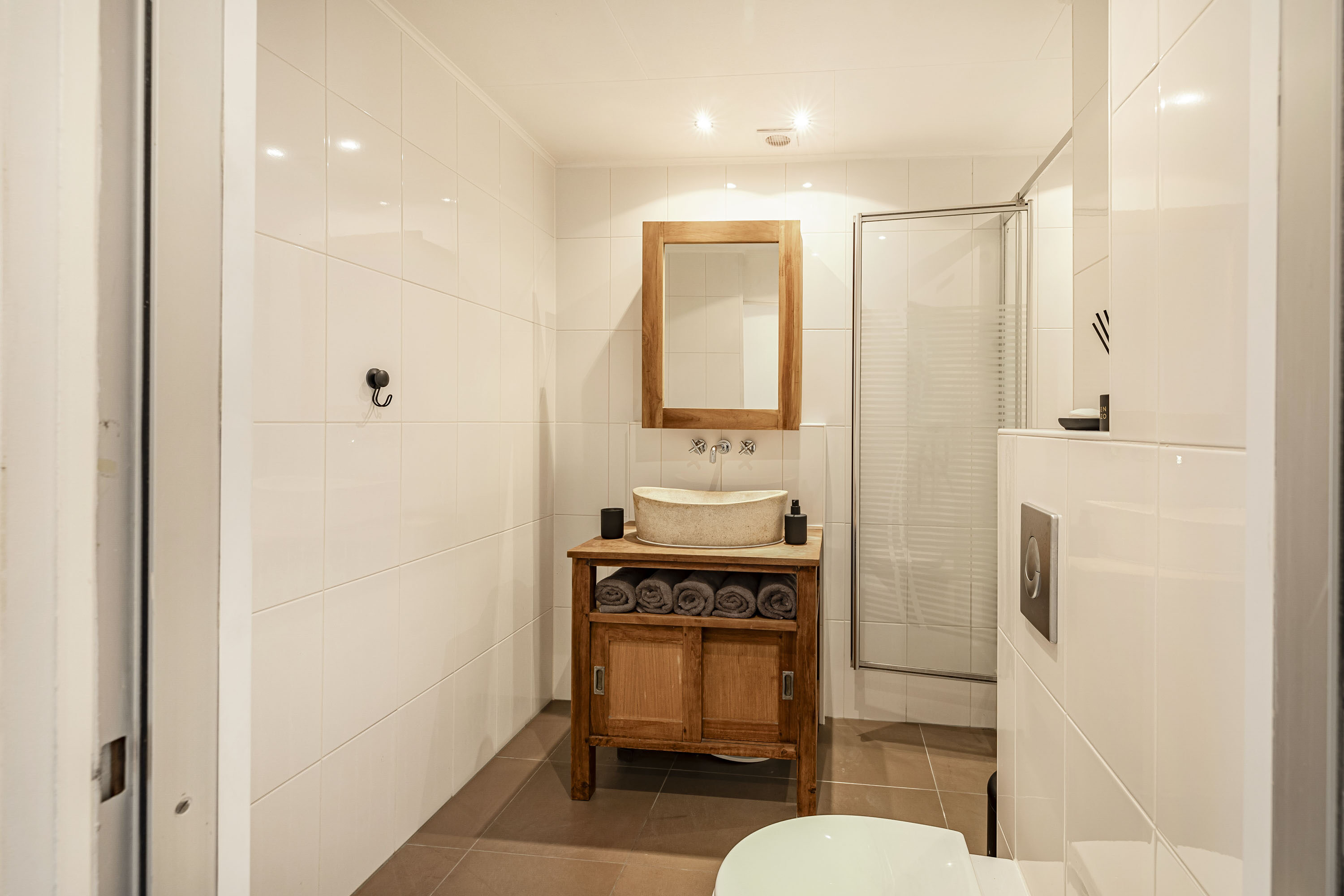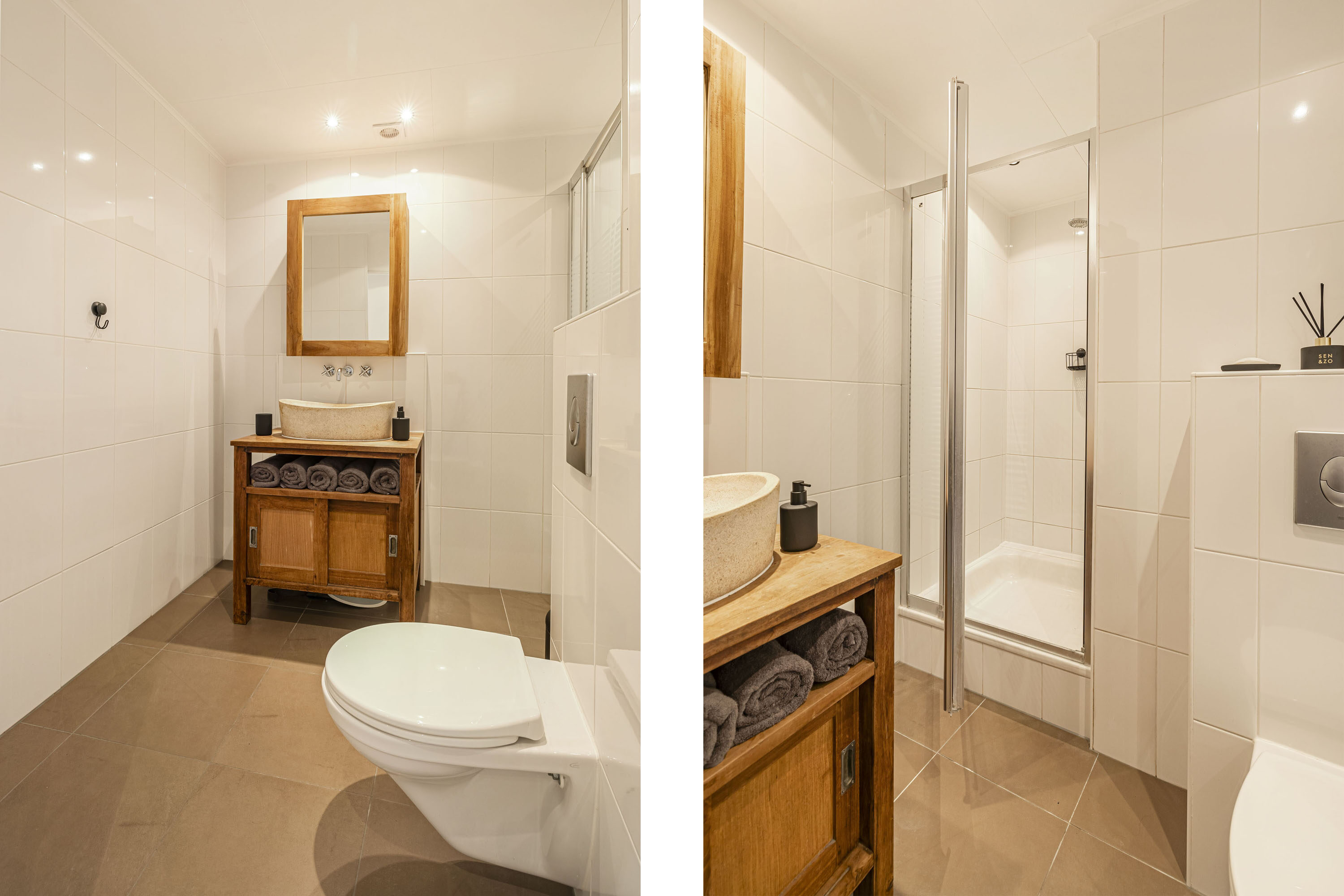 De volledig betegelde badkamer is uitgerust met een douchecabine, een vaste wastafel en een hangend toilet.