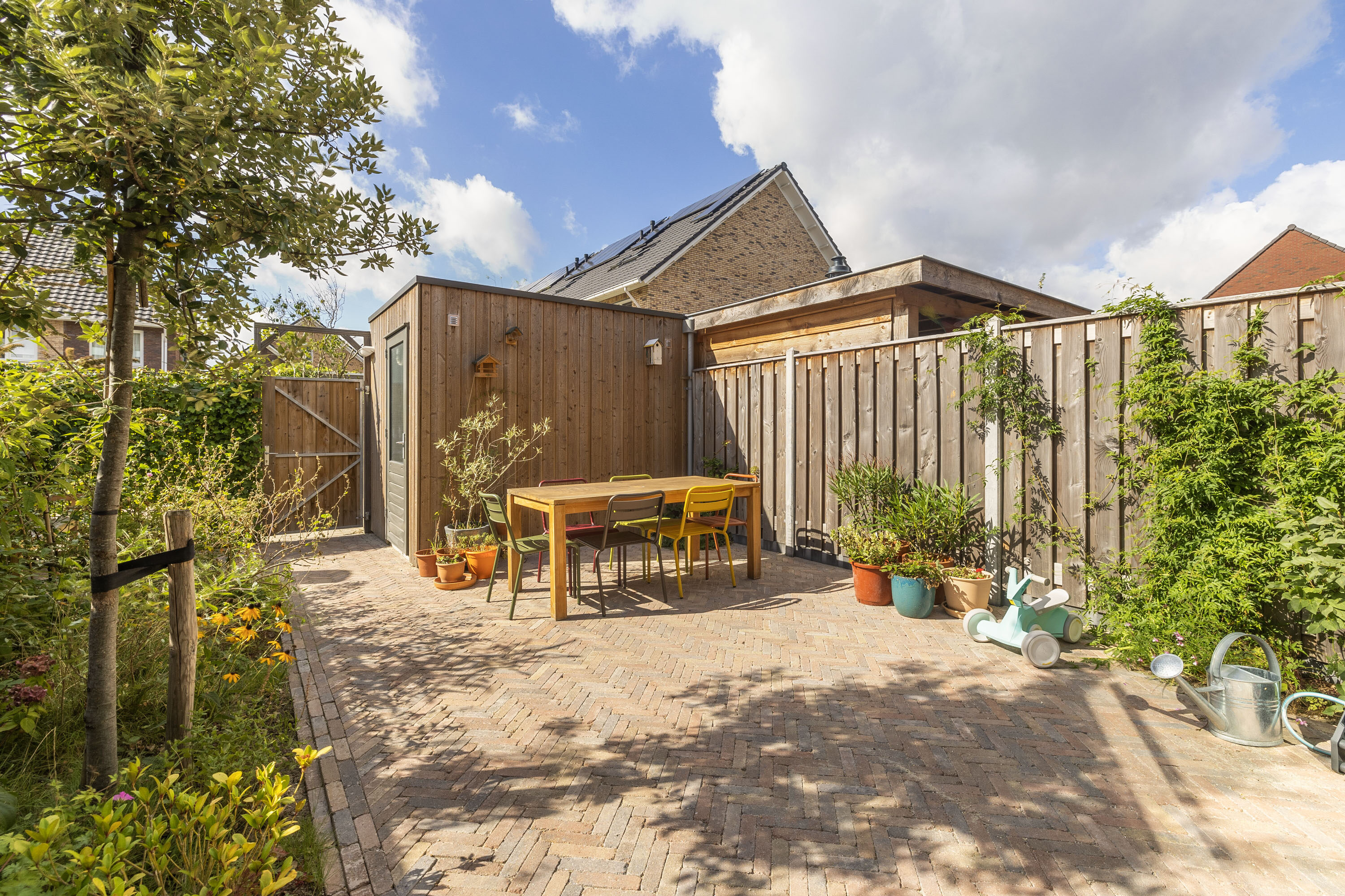 Onderhoudsvriendelijke achtertuin op het zuiden met bordes en vrijstaande houten berging met elektra. Er is een achterom aanwezig.