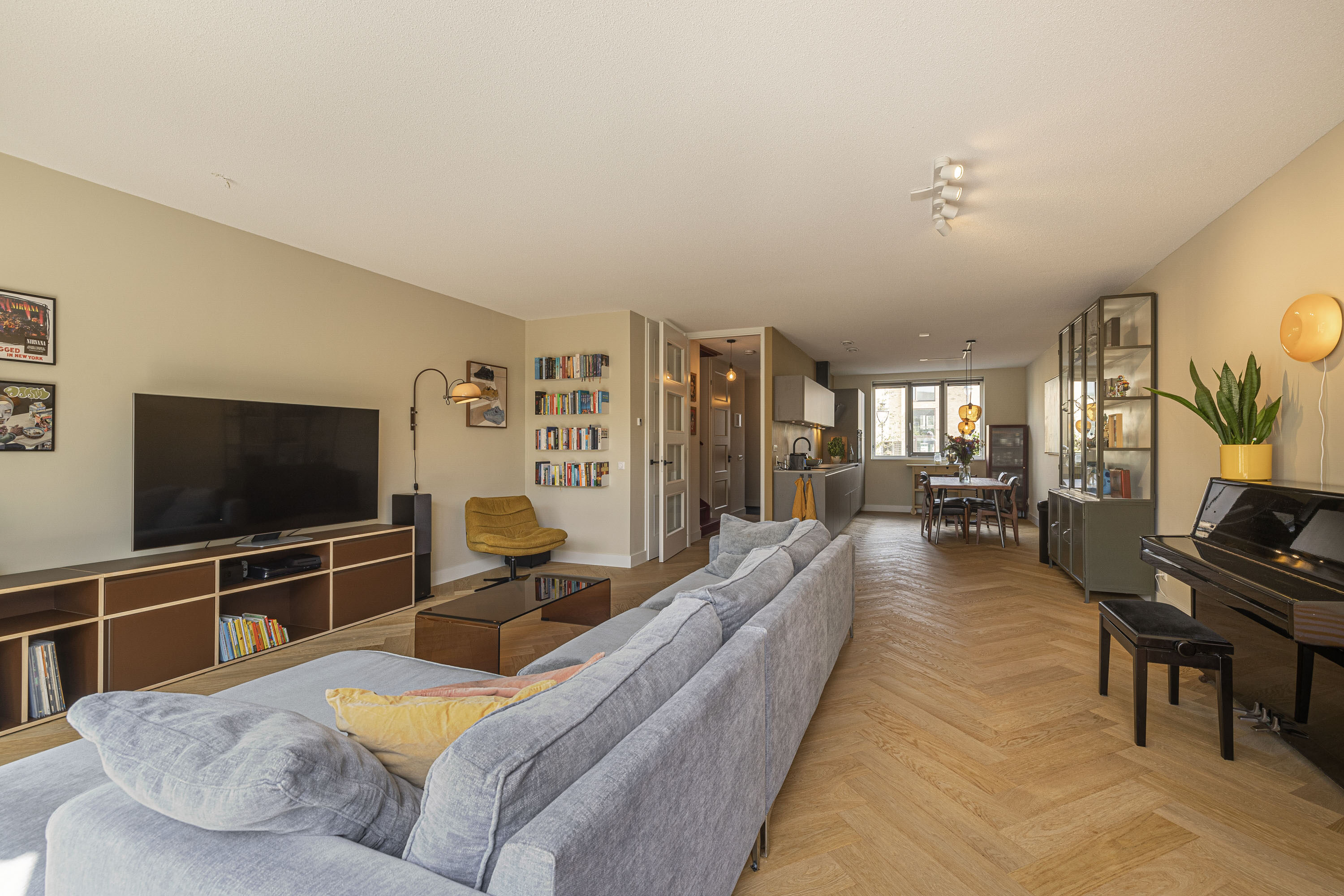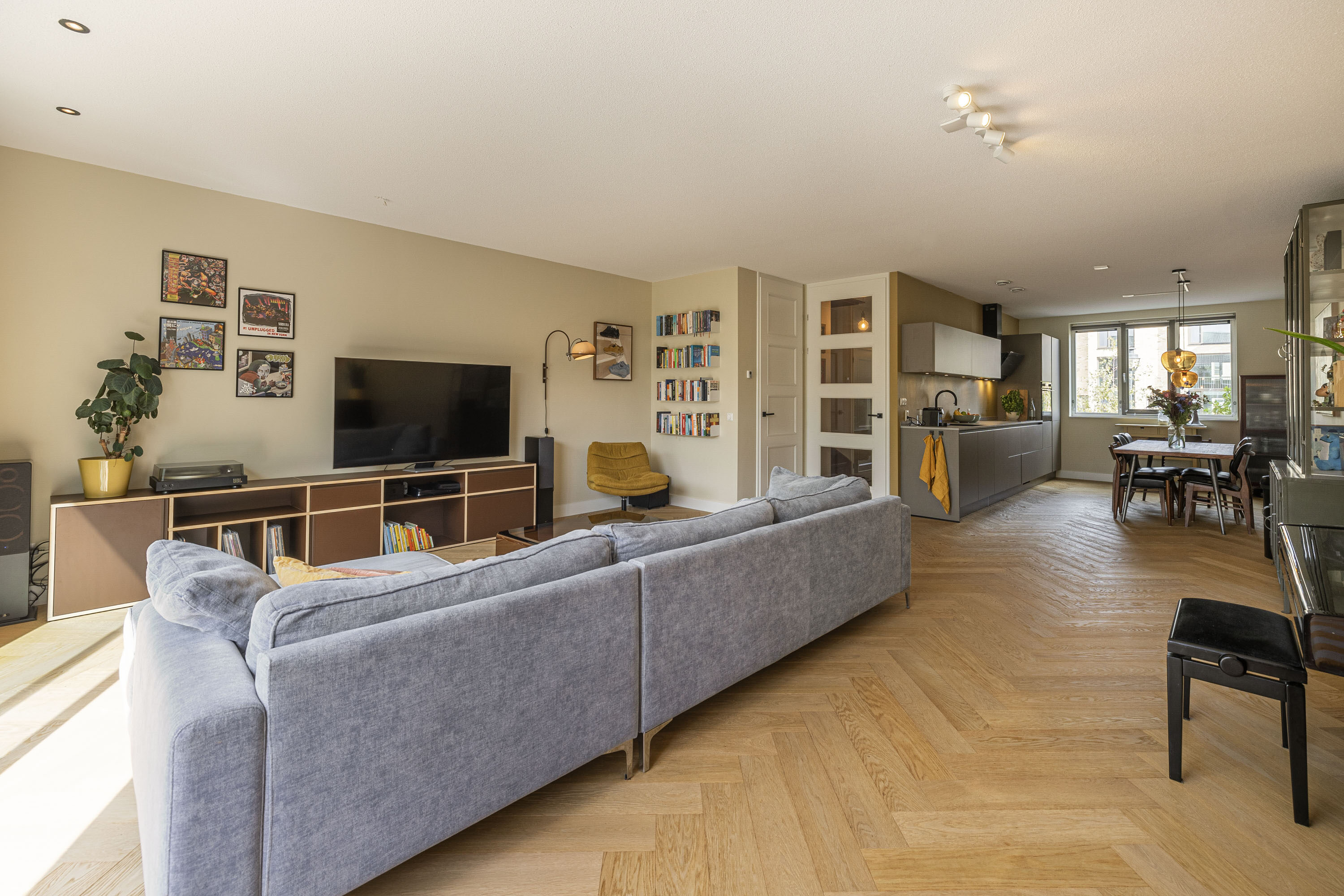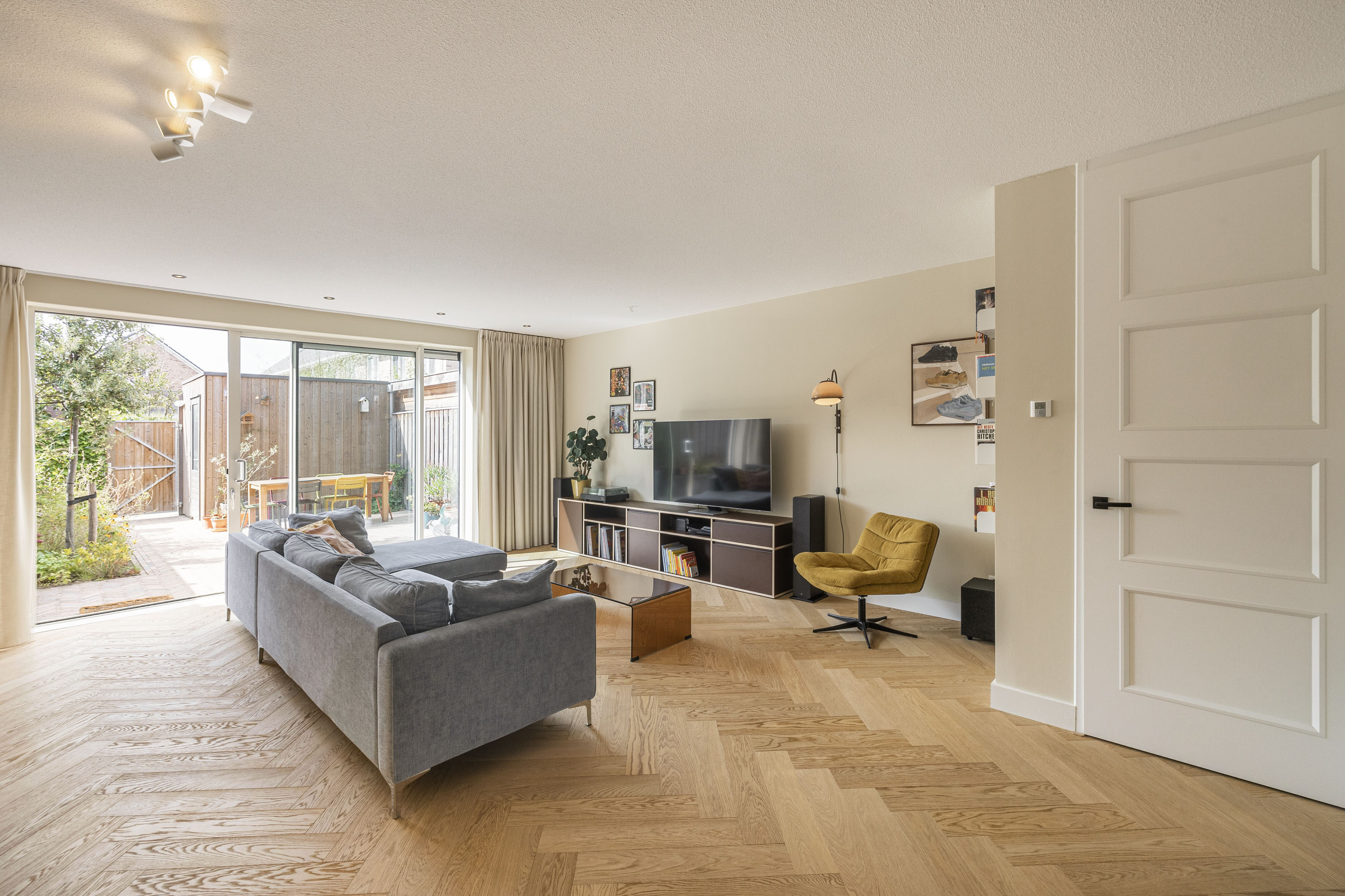 - Volledig uitgebouwde woonkamer met visgraat houten vloer