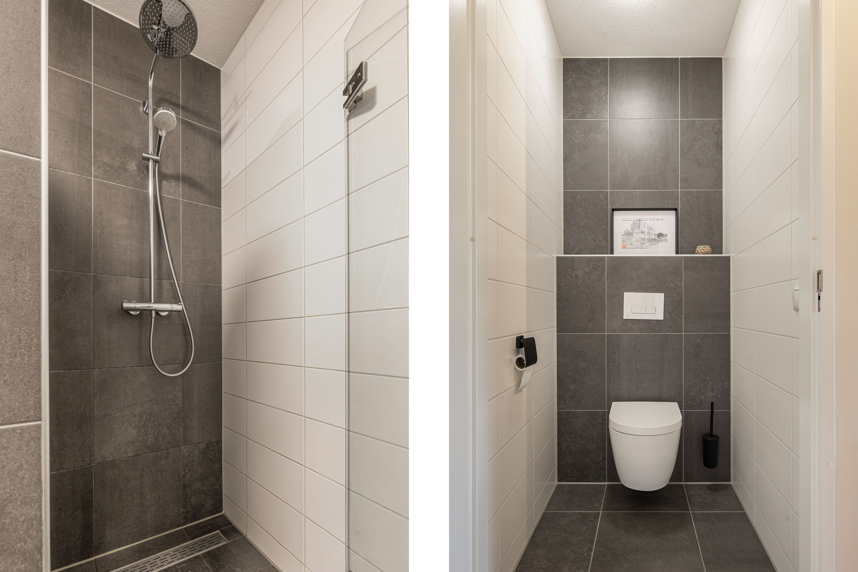 Luxe badkamer met inloopdouche, ligbad, dubbel wastafelmeubel en designradiator. Separaat toilet in dezelfde stijl als de badkamer. De verdieping is voorzien van laminaatvloer en vloerverwarming.