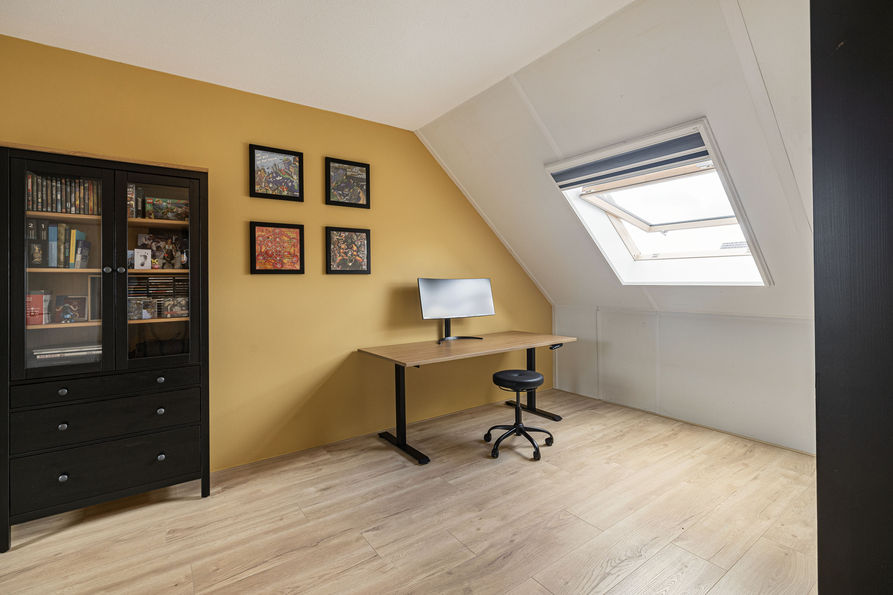 Via vaste trap bereikbare zolder met ruime kamer en aparte wasruimte. Dakramen zorgen voor daglicht, en knieschotten bieden extra bergruimte. Aansluitingen voor wasmachine, droger en mechanische ventilatie zijn aanwezig. Mogelijkheid tot het creëren van extra slaapkamers.