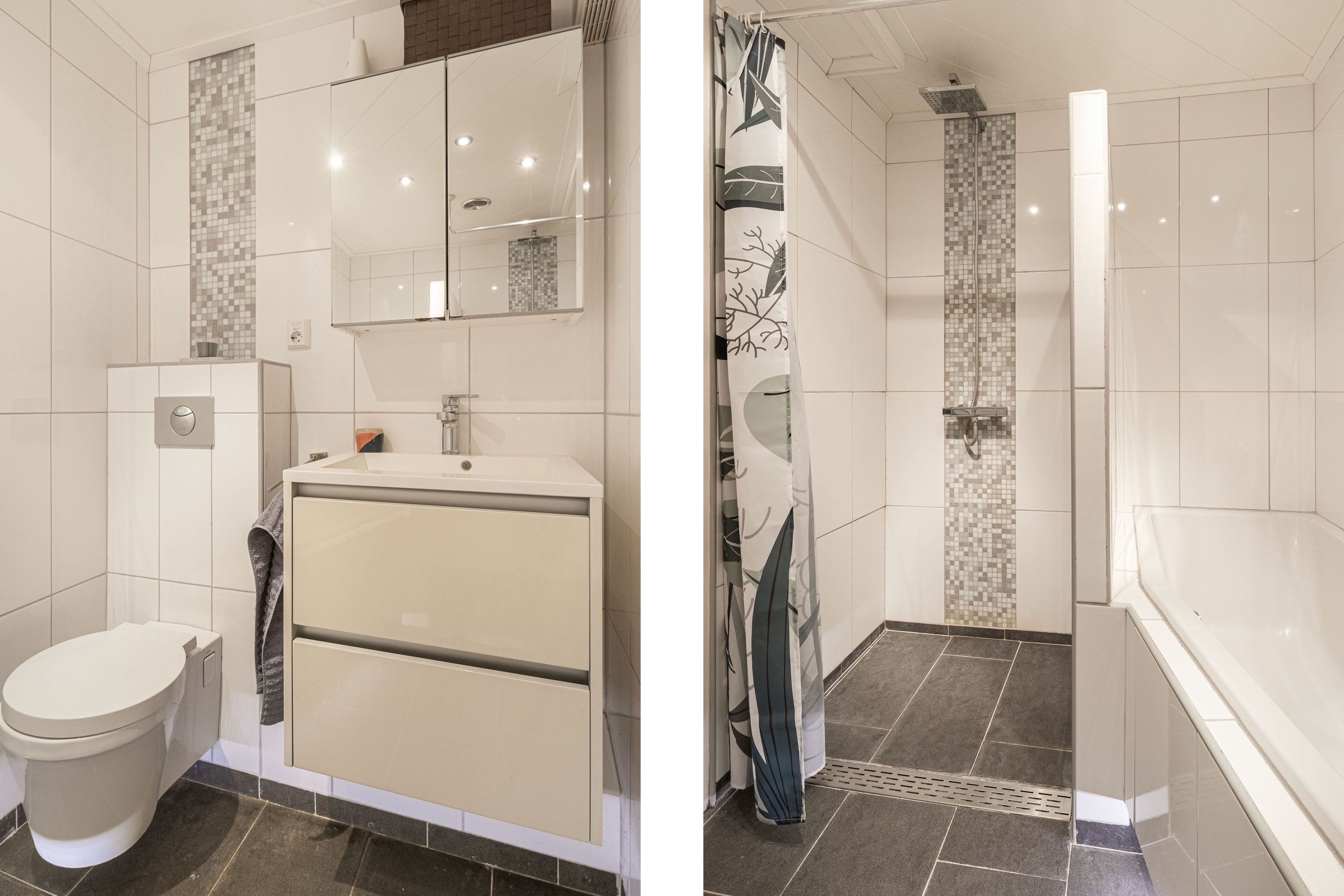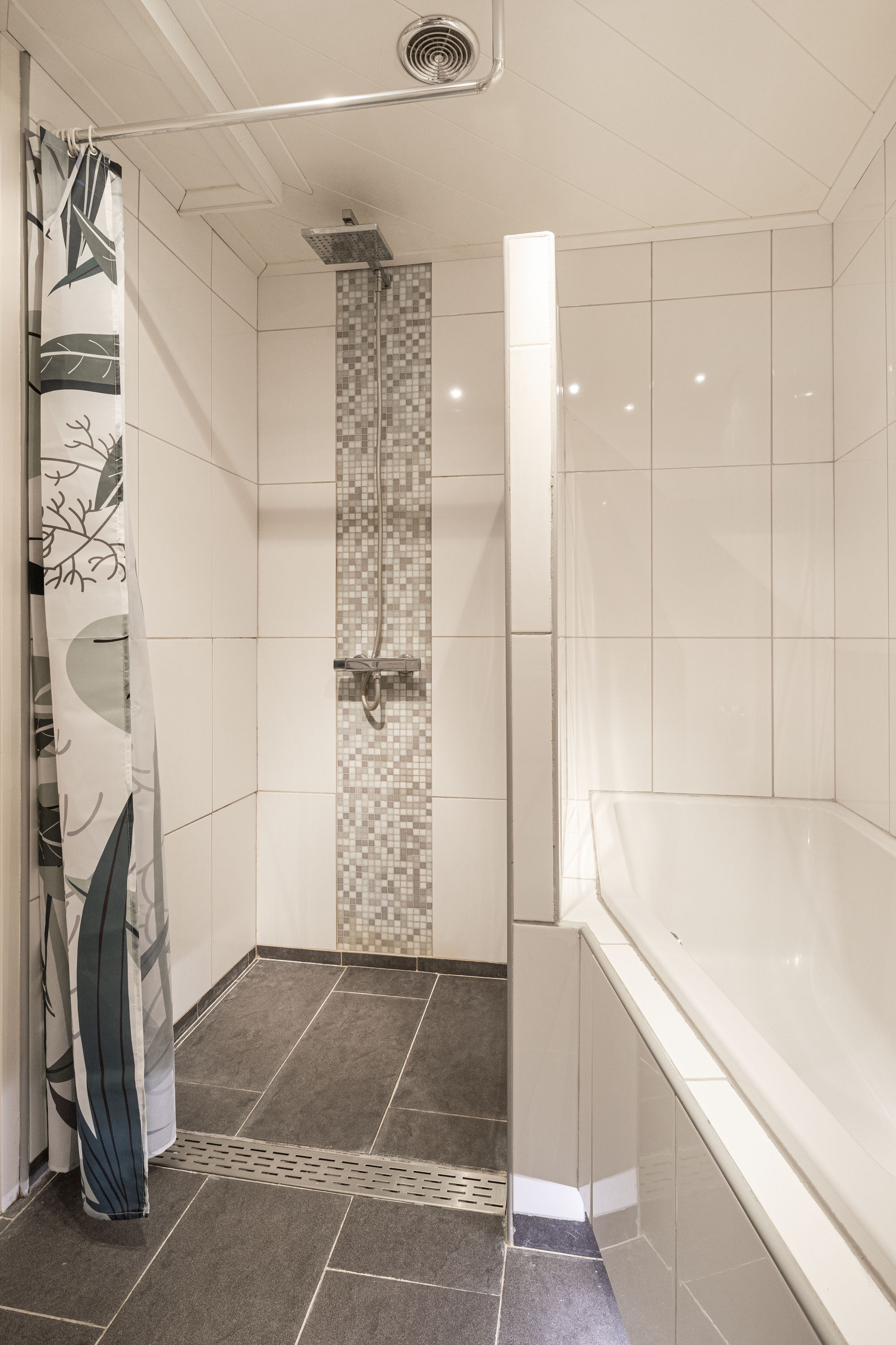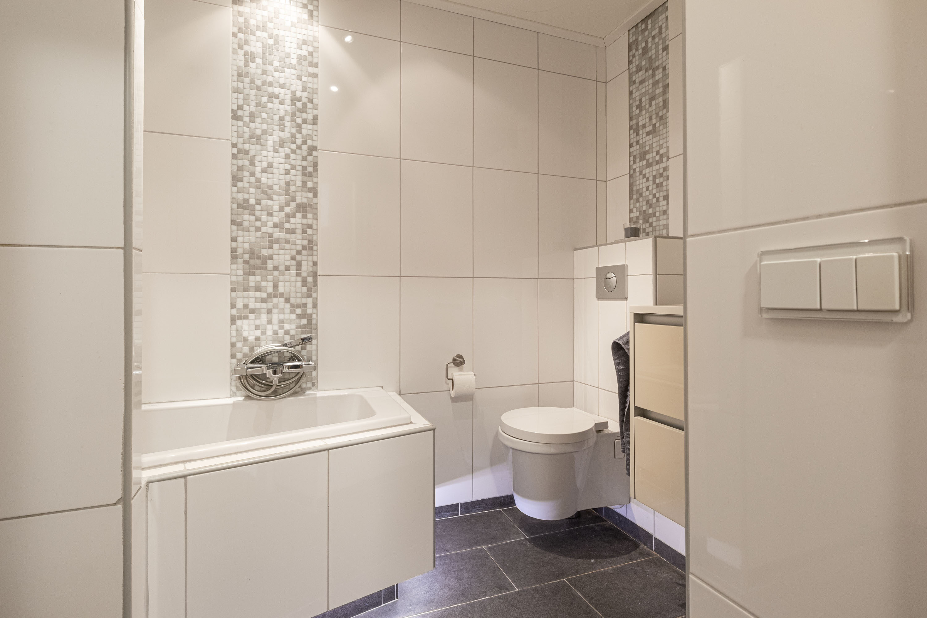 De badkamer op deze verdieping is uitgevoerd in een lichte kleurstelling. De badkamer is voorzien van een moderne douche, een comfortabel ligbad voor ontspannen momenten, een wastafel met opbergruimte en een toilet. Deze goed uitgeruste badkamer biedt alles wat je nodig hebt voor je dagelijkse routine en momenten van ontspanning.