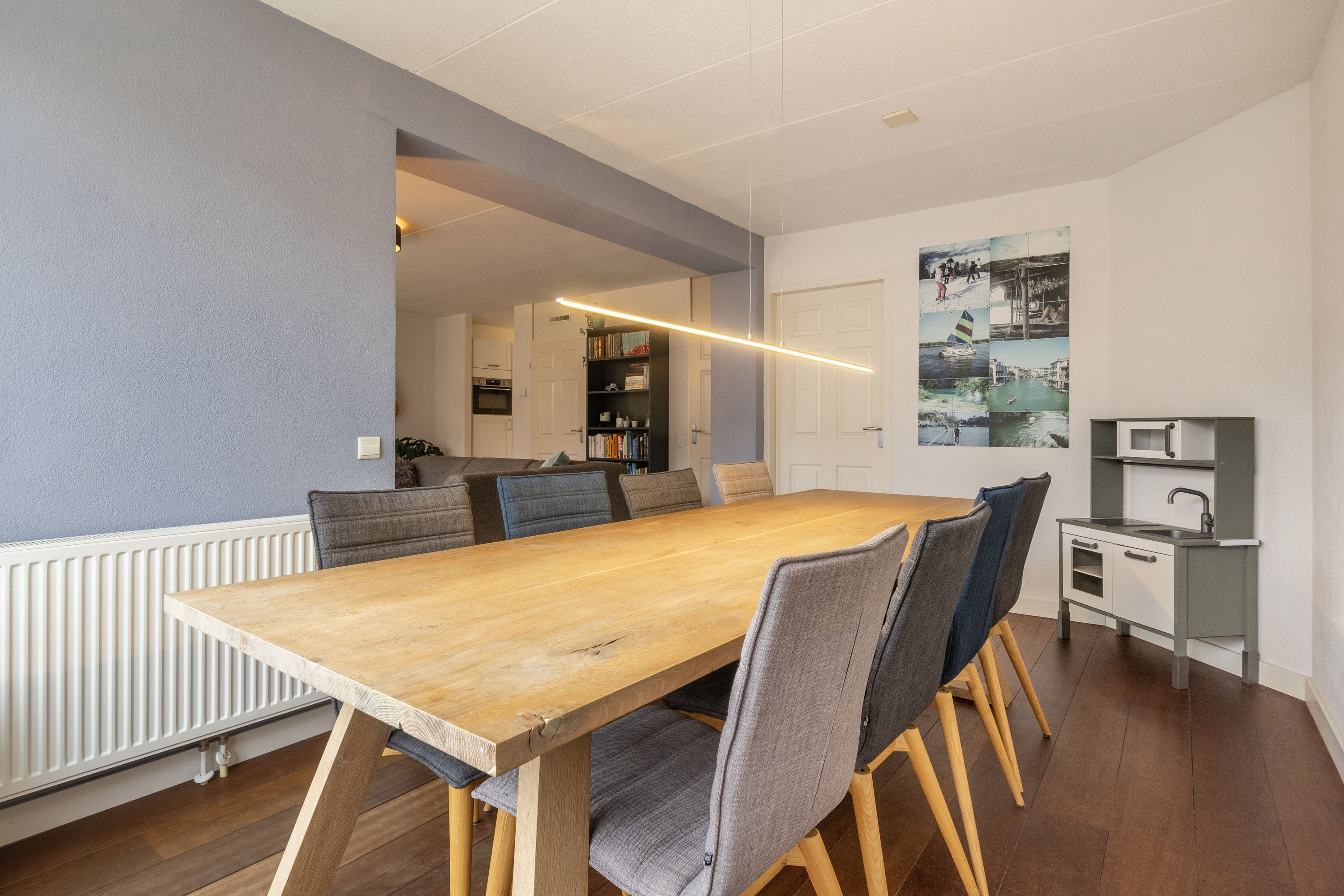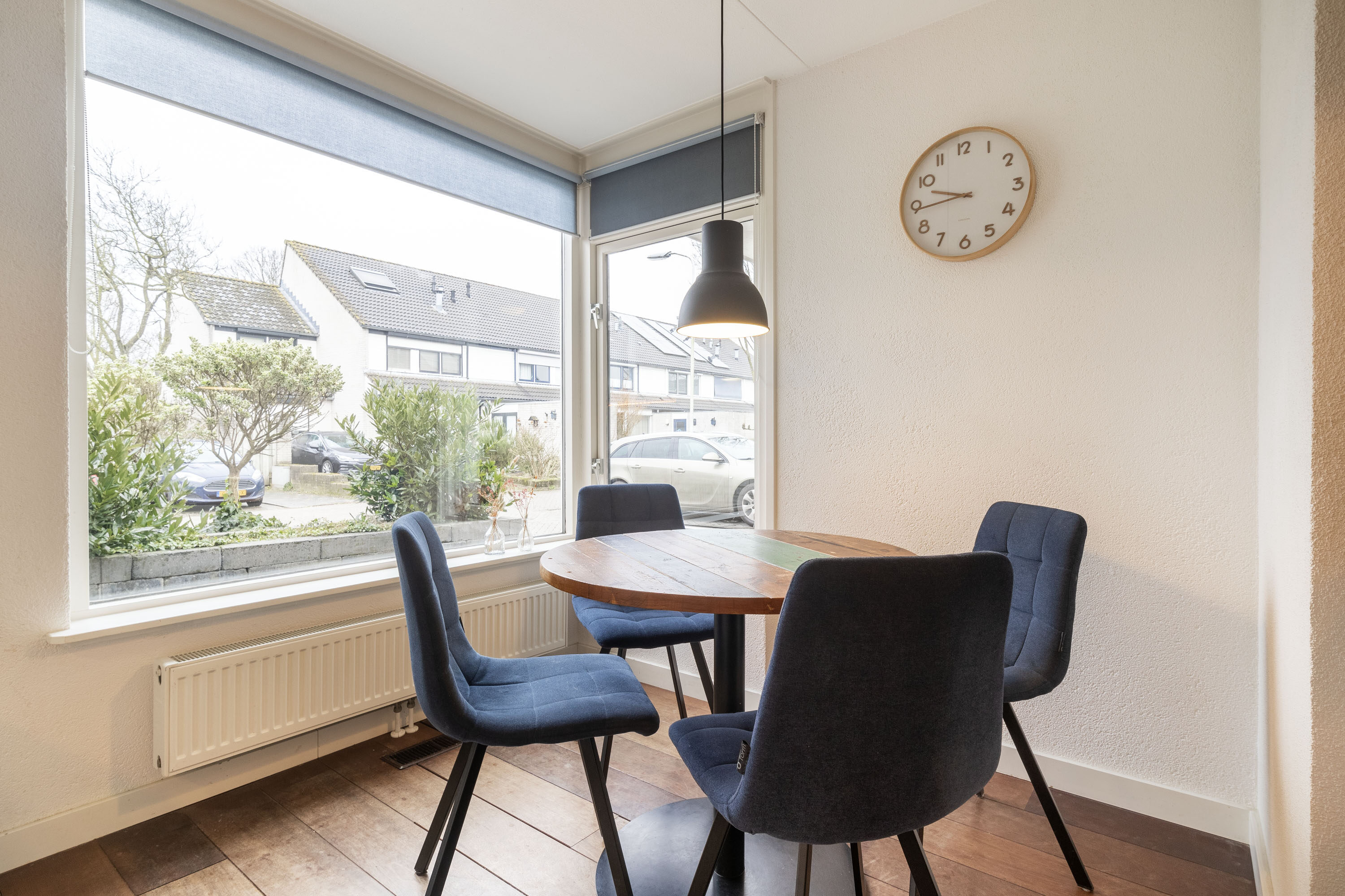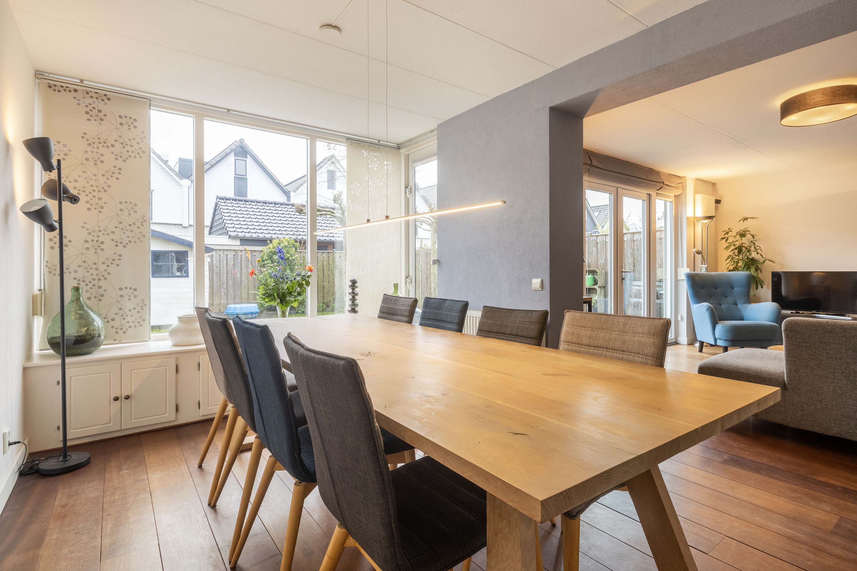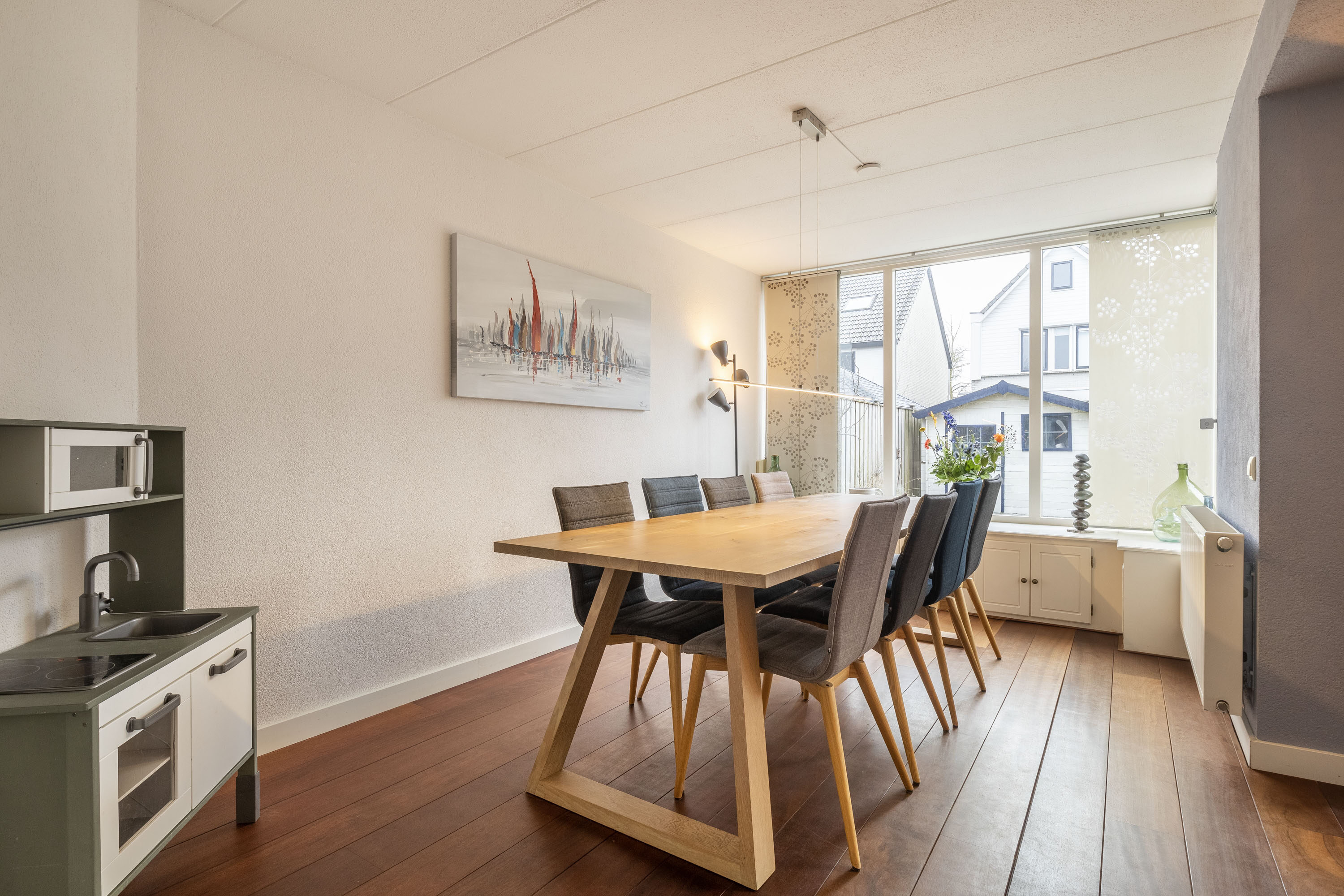 Aansluitend aan de woonkamer bevindt zich de eetkamer. Hier kun je tijdens het dineren genieten van het uitzicht op de achtertuin. Vanuit de eetkamer is er ook toegang tot het kantoor, dat aan de voorzijde van de woning gelegen is.