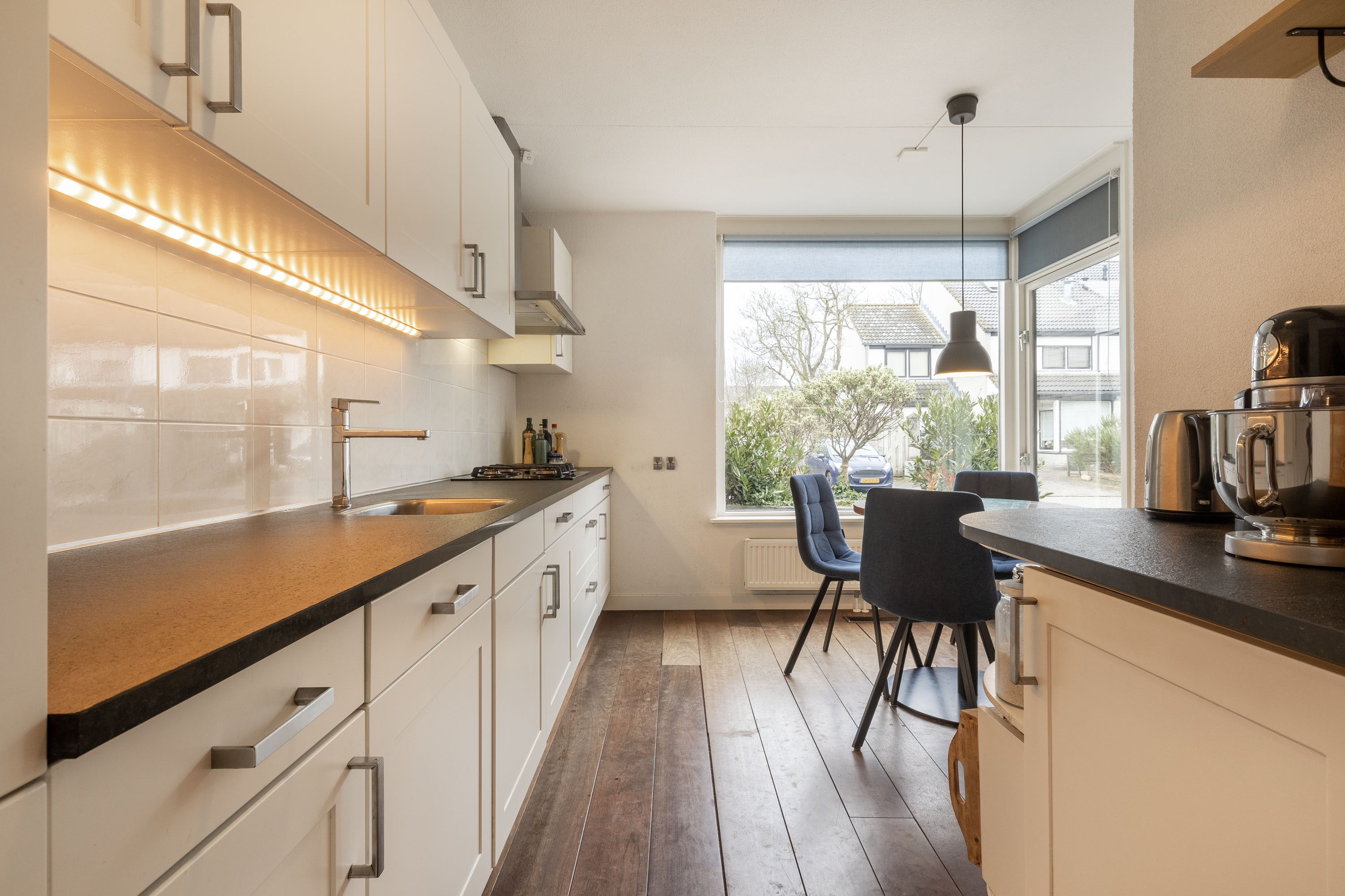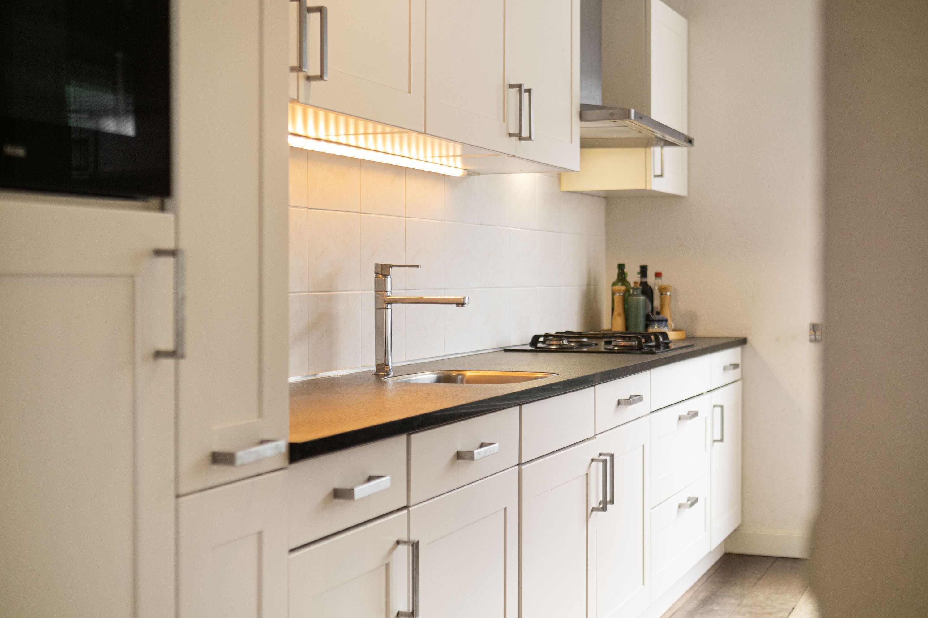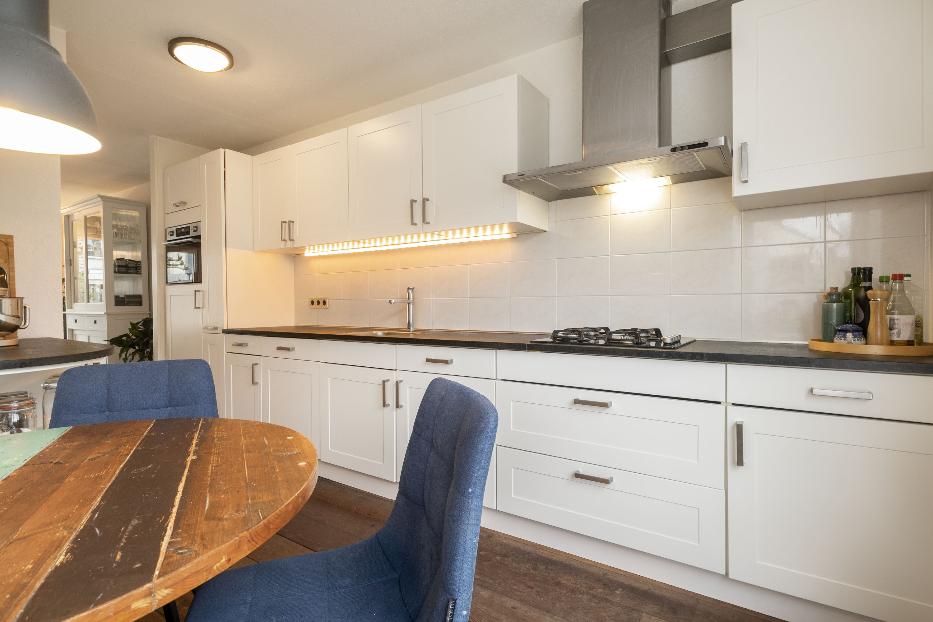 De keuken, die je vanuit de woonkamer bereikt, is uitgevoerd in een lichte kleurstelling met een stijlvol donker werkblad. Deze is uitgerust met moderne gemakken, waaronder een vierpits gasfornuis, afzuigkap, koelkast, diepvries (2021) combioven (2023) en vaatwasser. Daarnaast is er voldoende ruimte voor een eettafel, waar je kunt genieten van het uitzicht op de straatzijde.