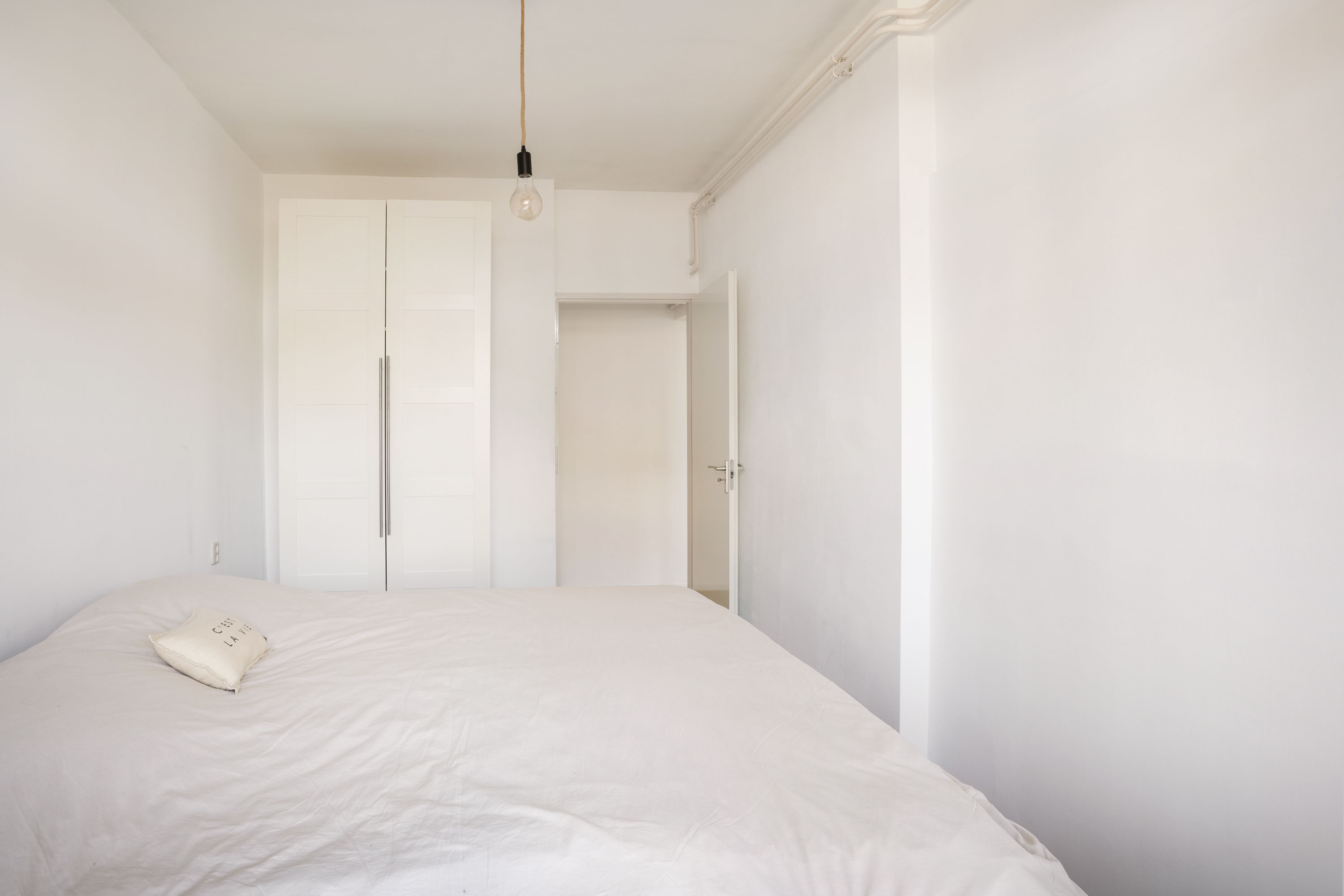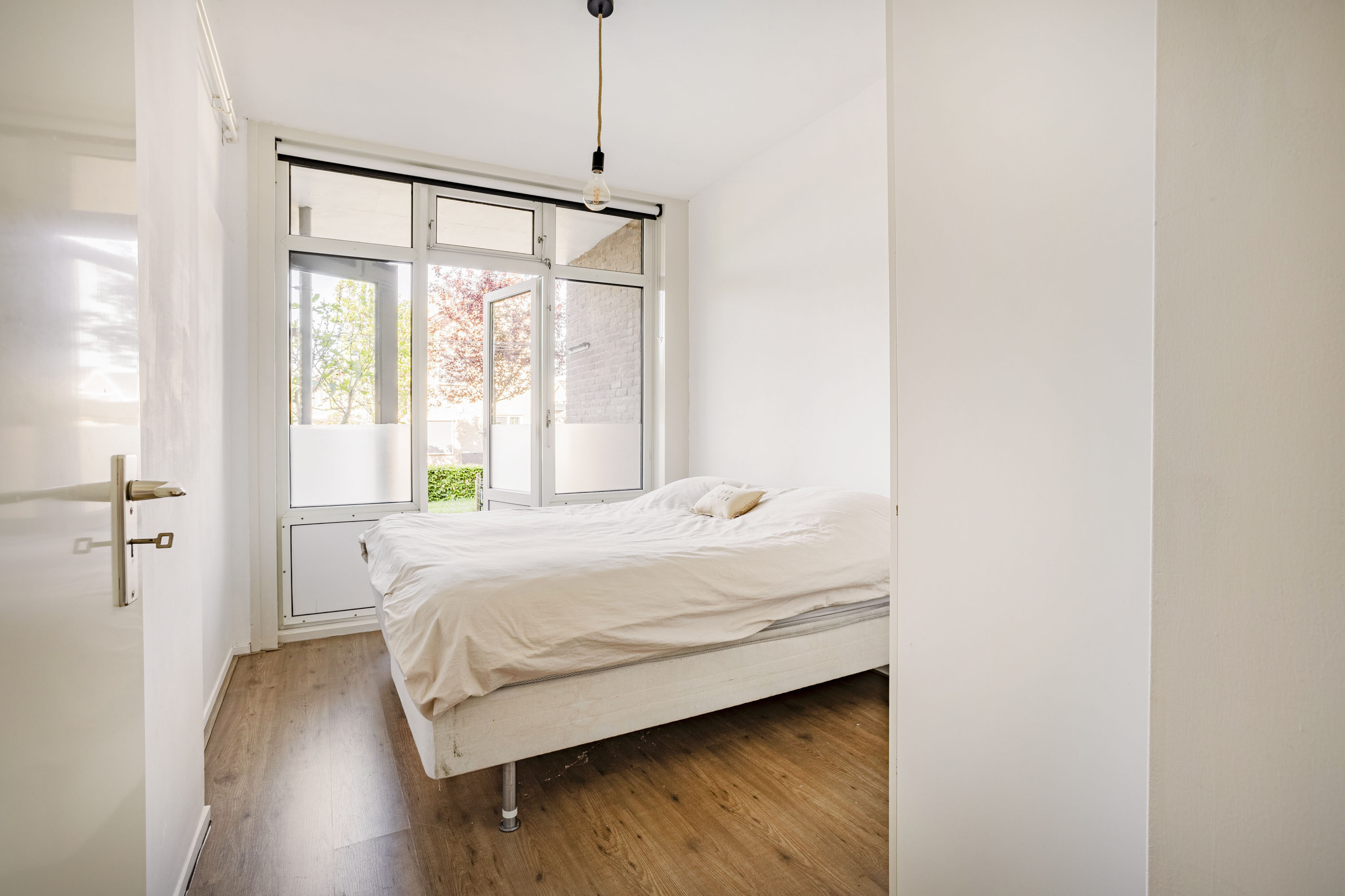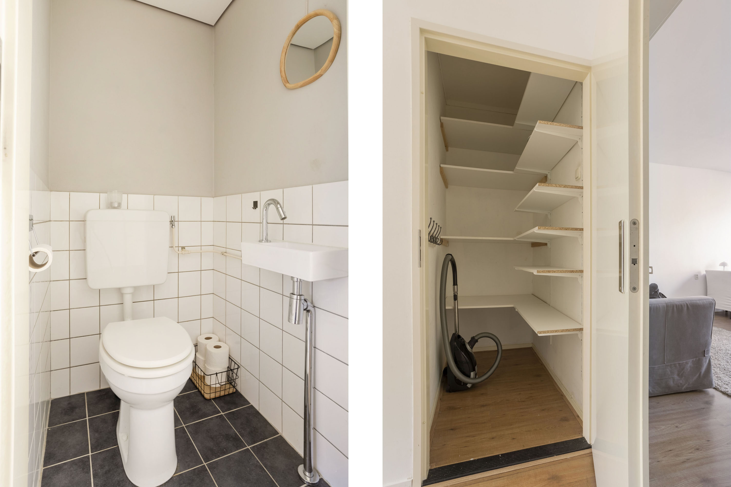 Aan de achterzijde van het appartement tref je de slaapkamer van circa 10m² en aan de voorzijde bevindt zich een tweede slaap-/werkkamer van circa 11m², met een vaste kast voor extra bergruimte. De badkamer is eenvoudig en beschikt over een douche, wastafel en witgoedaansluiting. Het separate toiletruimte biedt extra comfort en gemak, ook ideaal wanneer je visite over de vloer hebt.