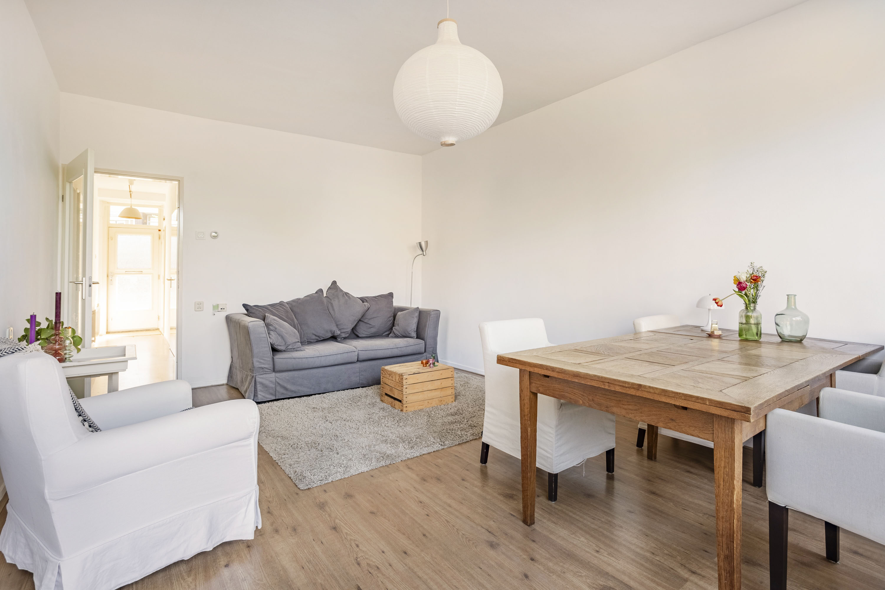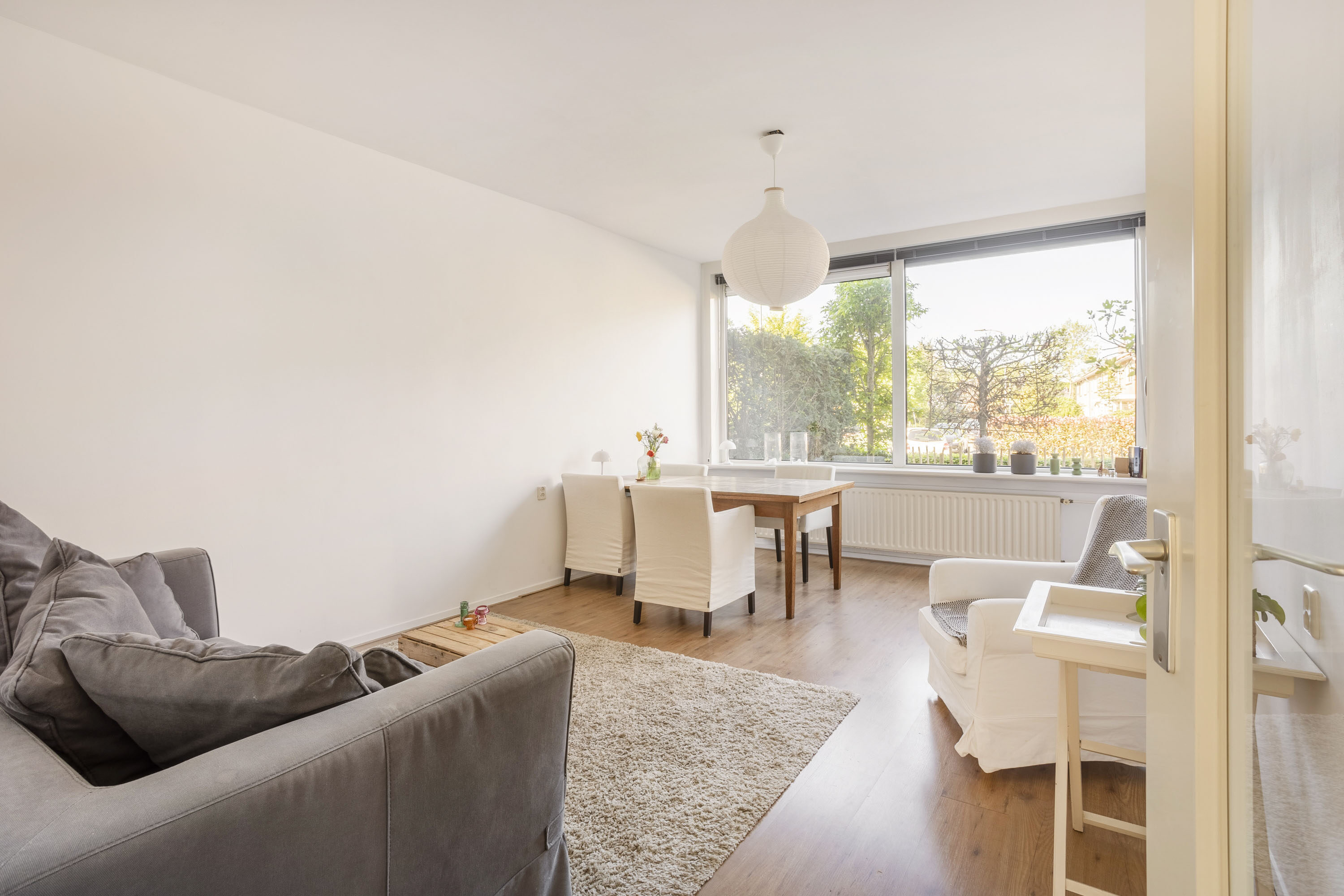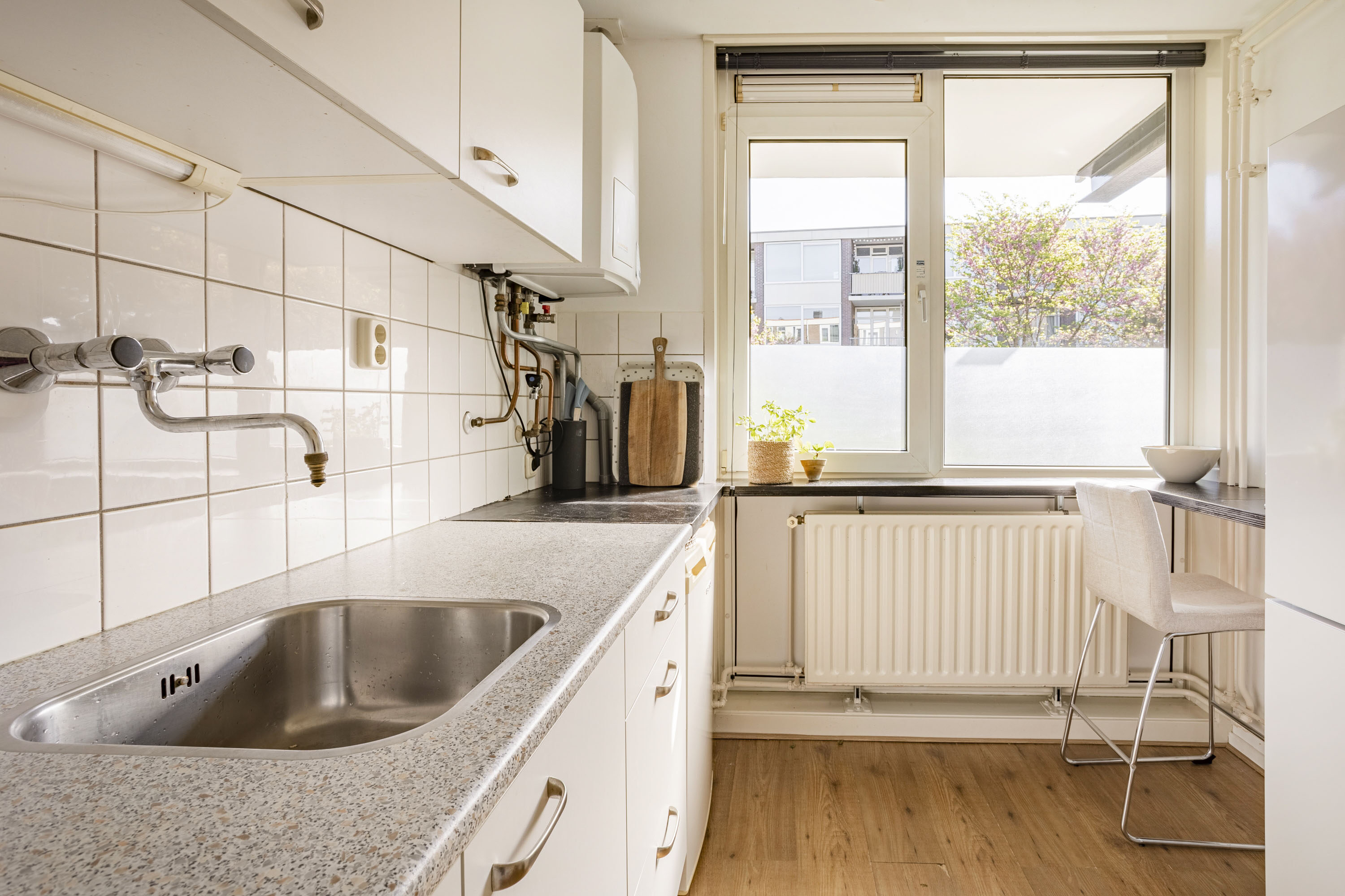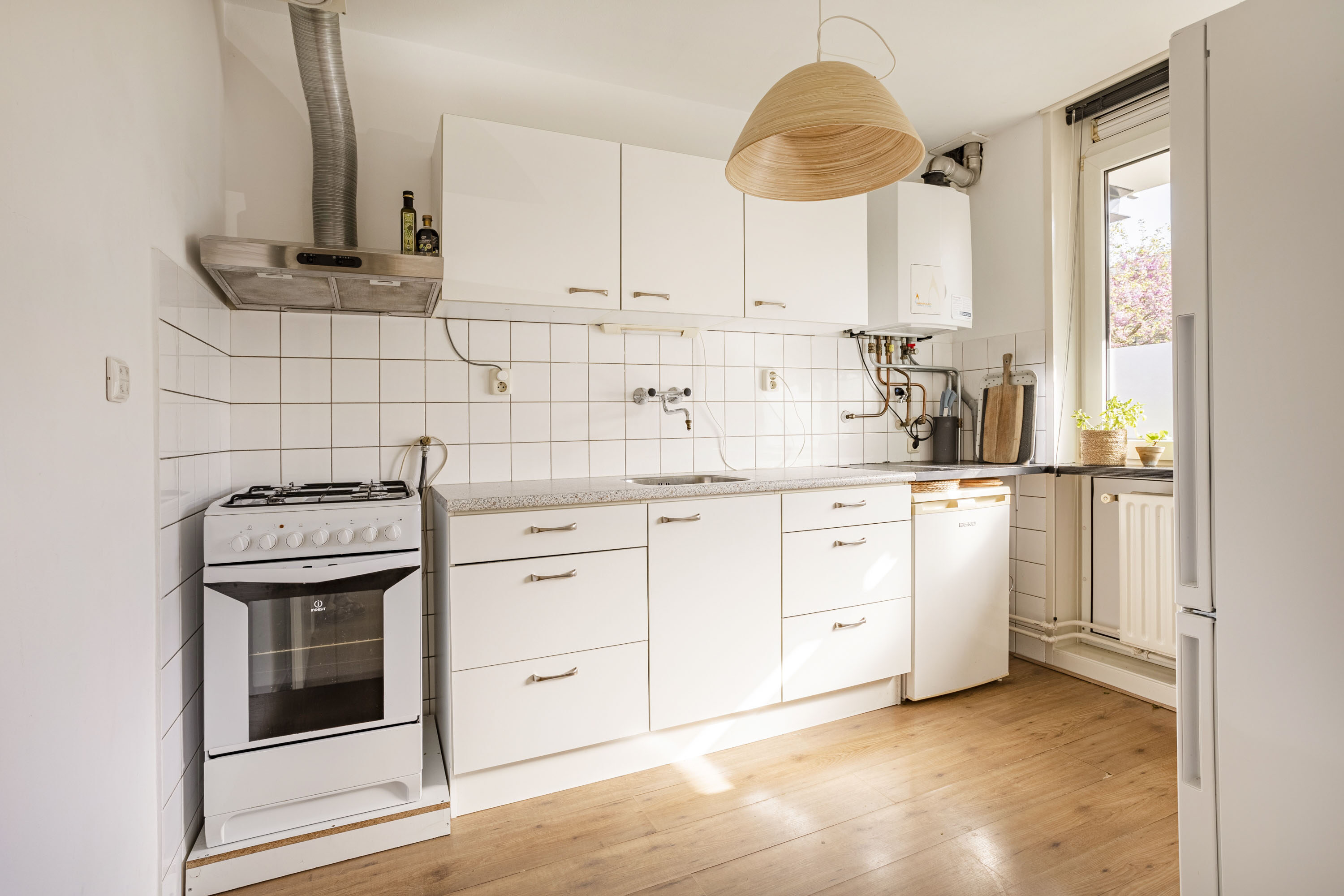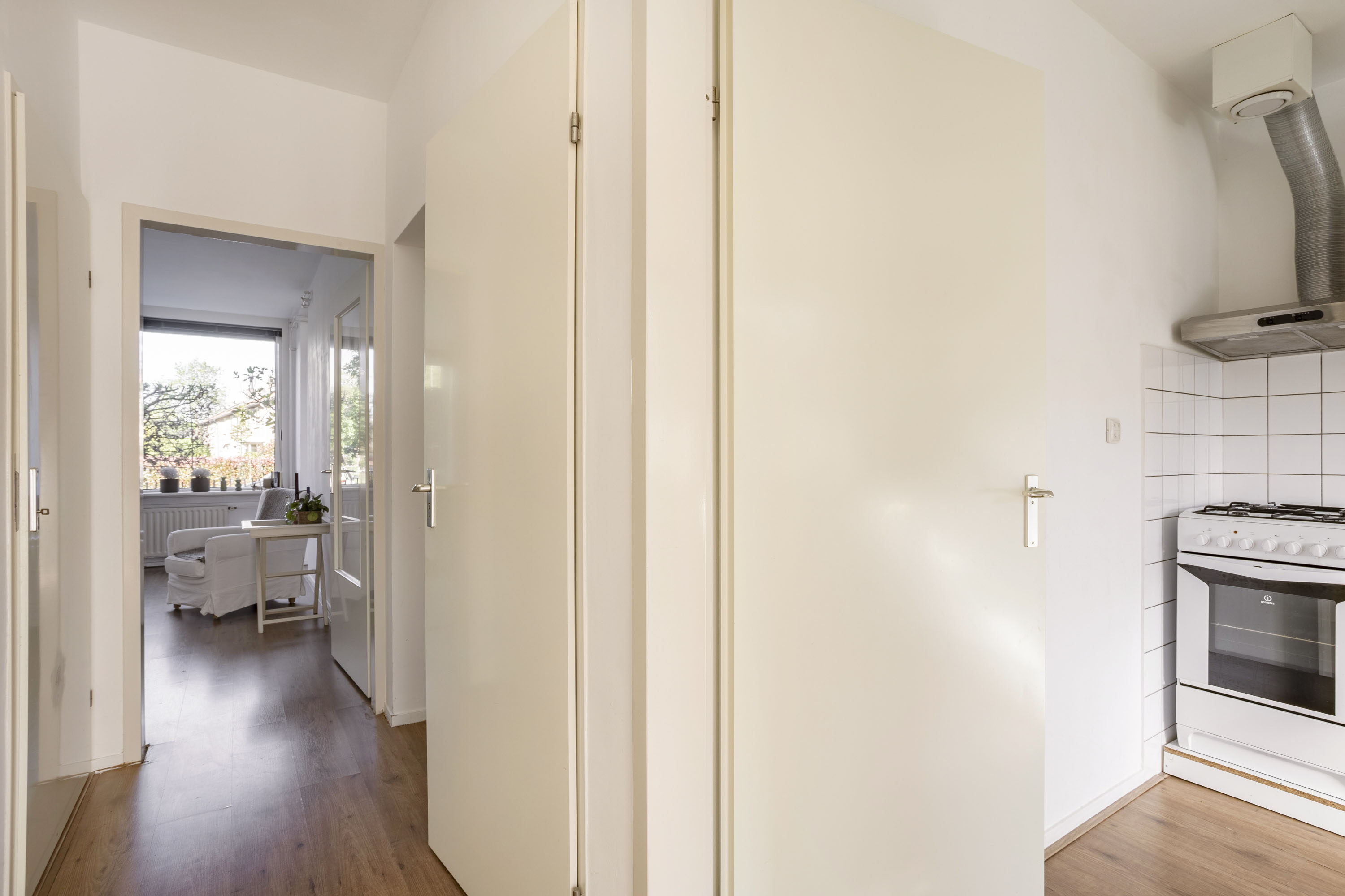 Bij binnenkomst geeft de hal toegang naar alle vertrekken. De woonkamer is gelegen aan de achterzijde van het appartement en heeft door de grote raampartij veel natuurlijk lichtinval. Vanuit de woonkamer is de achtertuin te bereiken. De keuken, gelegen aan de voorzijde van het appartement, is voorzien van een eenvoudig keukenblok in rechte opstelling.