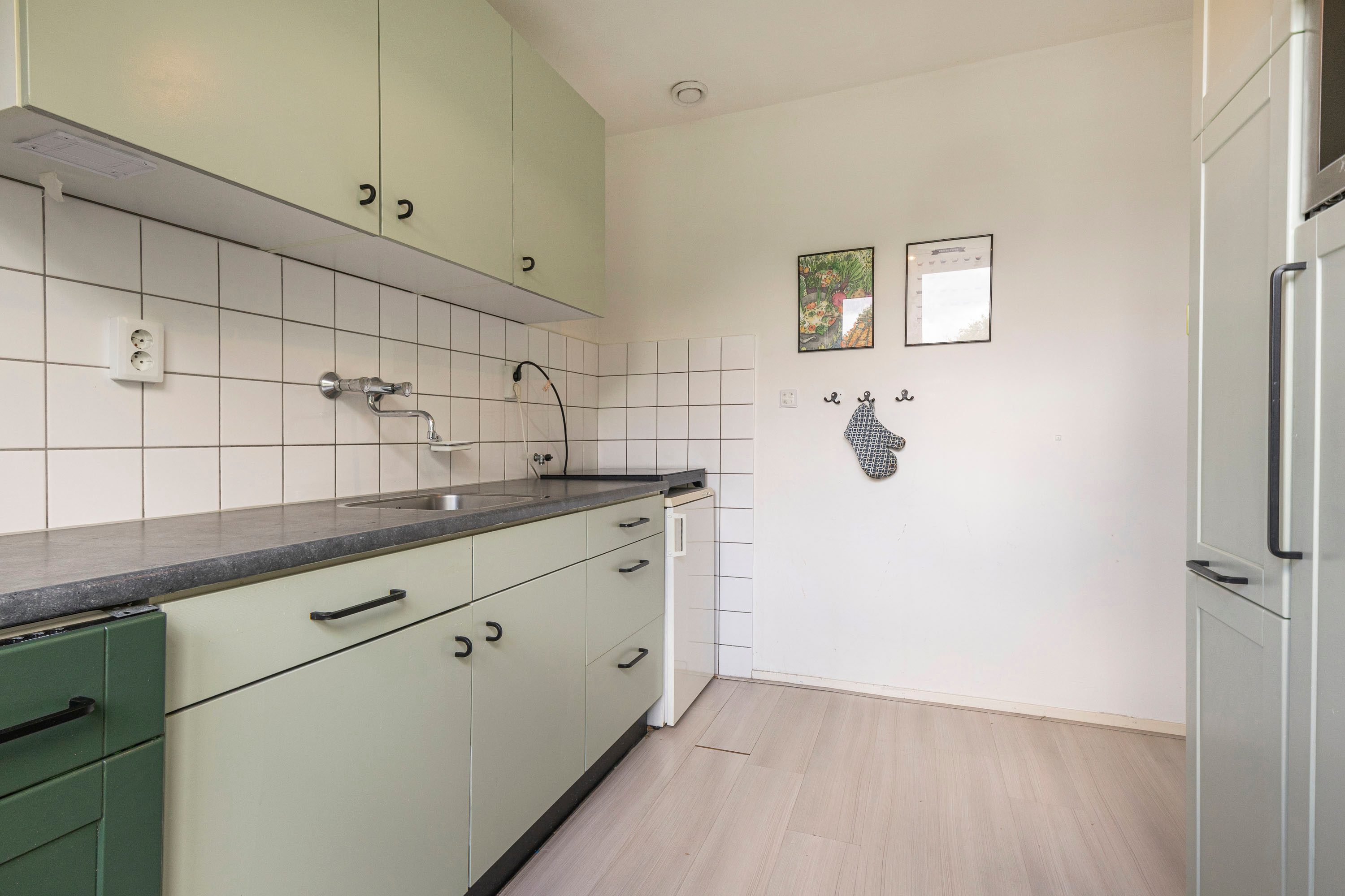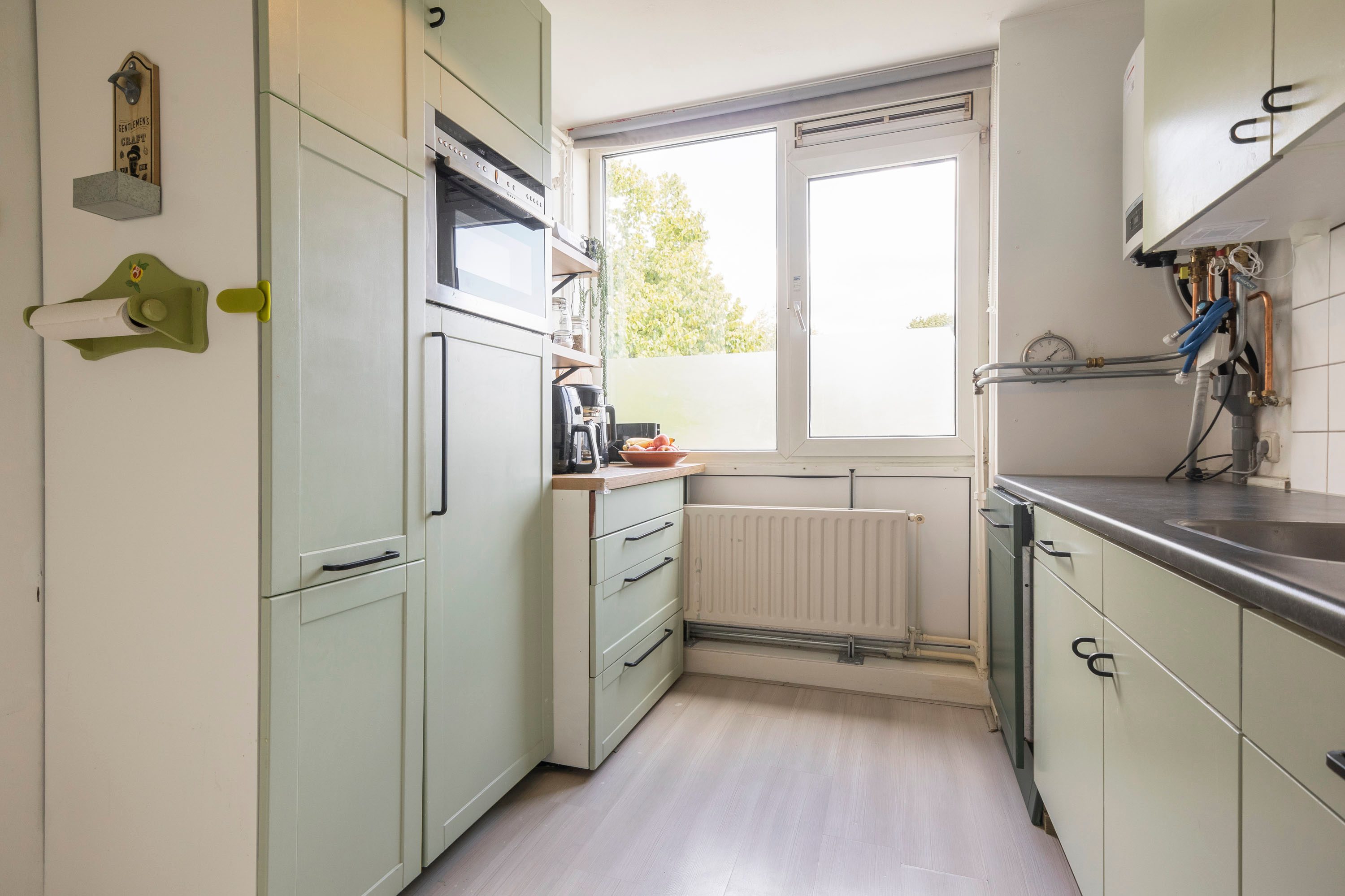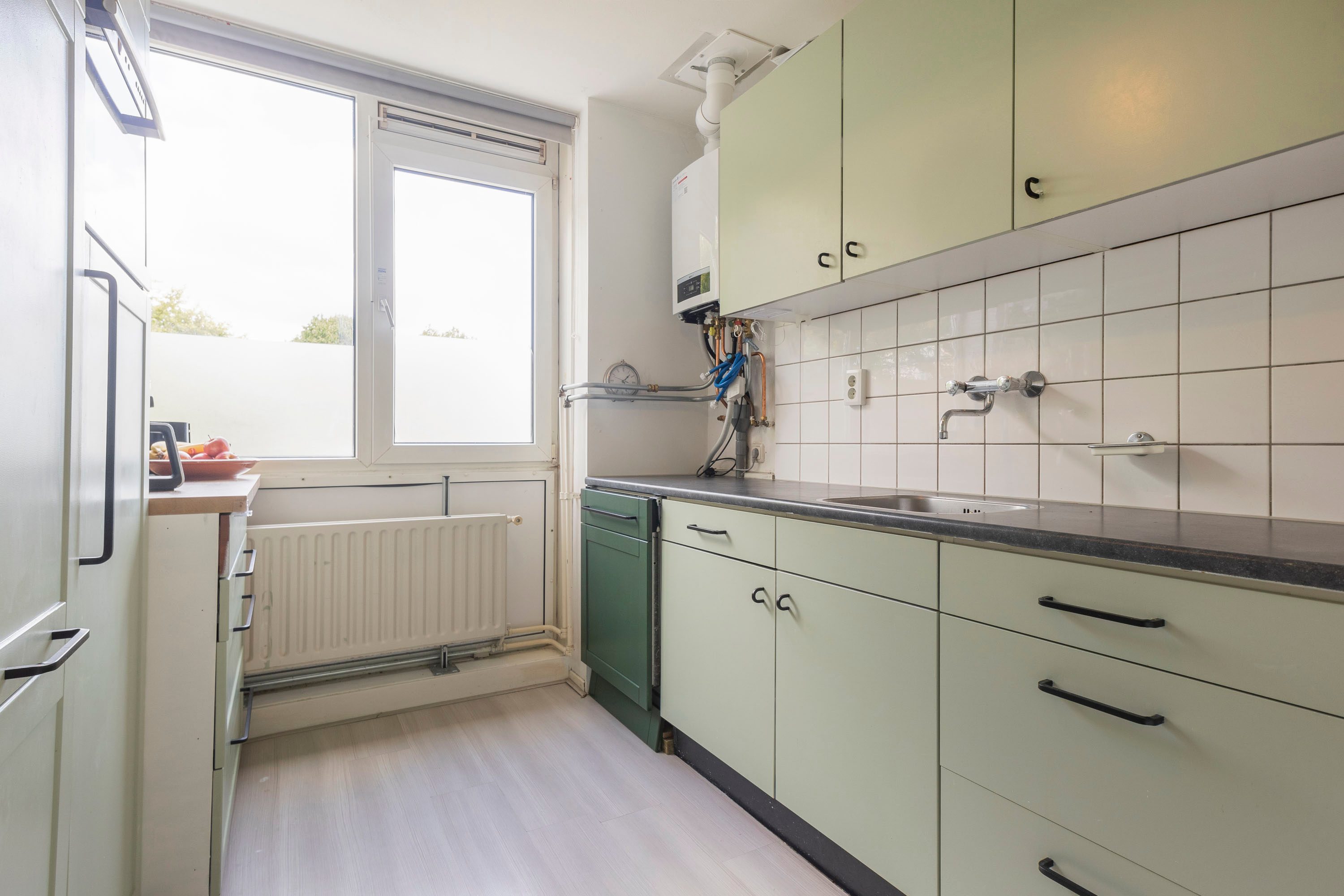 Via de hal heb je toegang tot alle vertrekken. De woonkamer is licht en ruim dankzij de grote raampartij en biedt genoeg plek voor een comfortabele zithoek, eethoek én een thuiswerkplek. Vanuit hier stap je zo het balkon op het westen op – ideaal voor een zonnig plekje aan het einde van de dag. De keuken ligt aan de voorzijde, is deels vernieuwd in 2023 en biedt voldoende opbergruimte. Hier bevindt zich ook de cv-ketel.