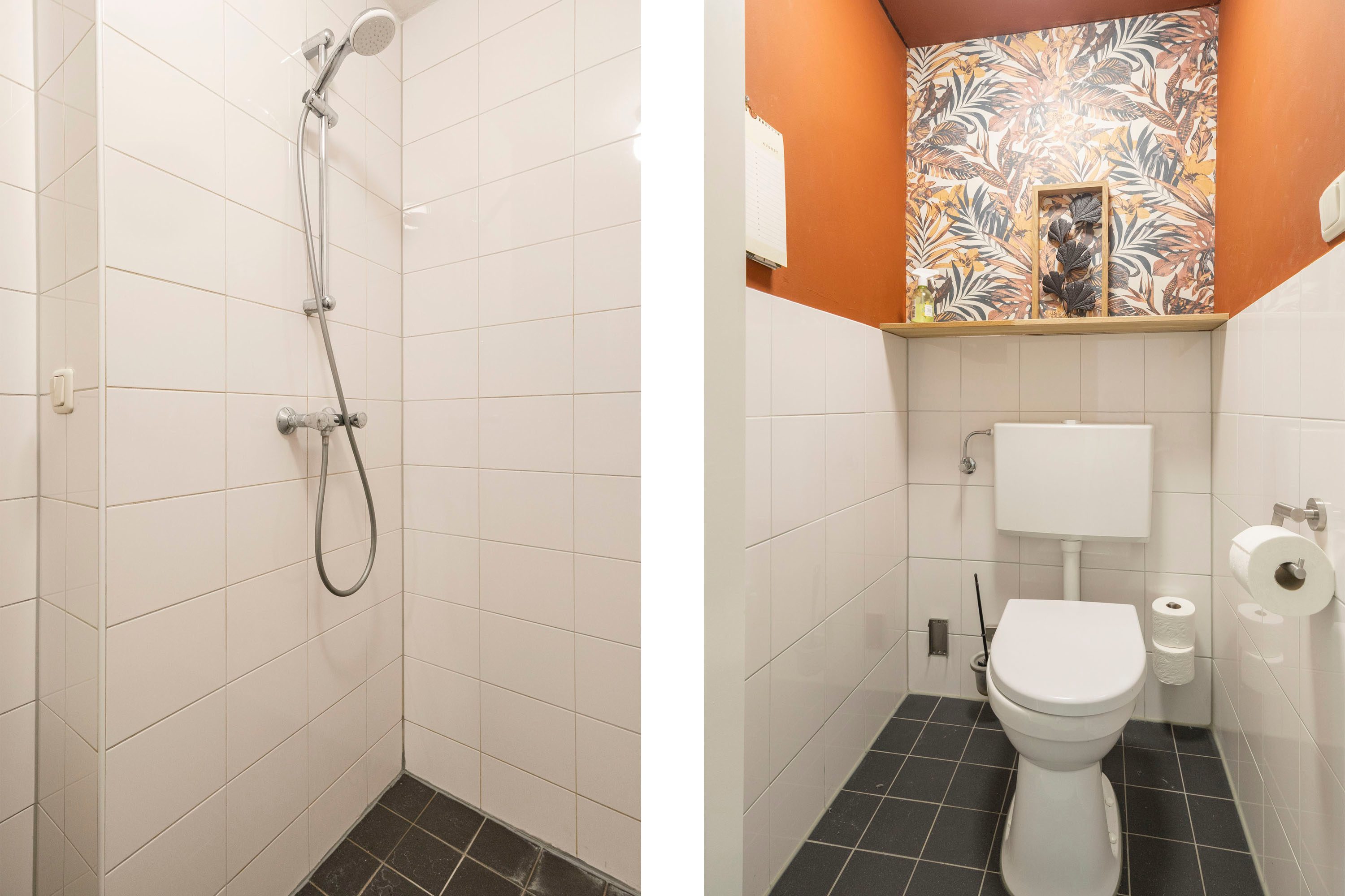 De badkamer is praktisch ingericht met een douche, wastafel en wasmachineaansluiting. Het toilet bevindt zich apart van de badkamer.