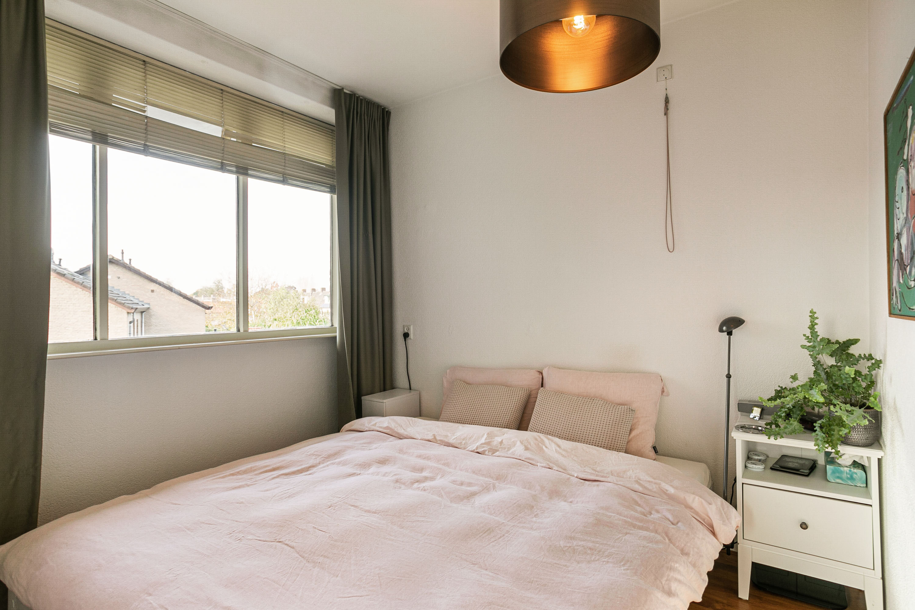 De ruime hoofdslaapkamer ligt aan de rustige achterzijde van het complex en biedt daardoor veel privacy en is daardoor een fijne kamer. De badkamer is compleet met een douche, toilet en een badkamermeubel. Boven het toilet bevindt zich een extra kast, die zorgt voor praktische extra opbergruimte.