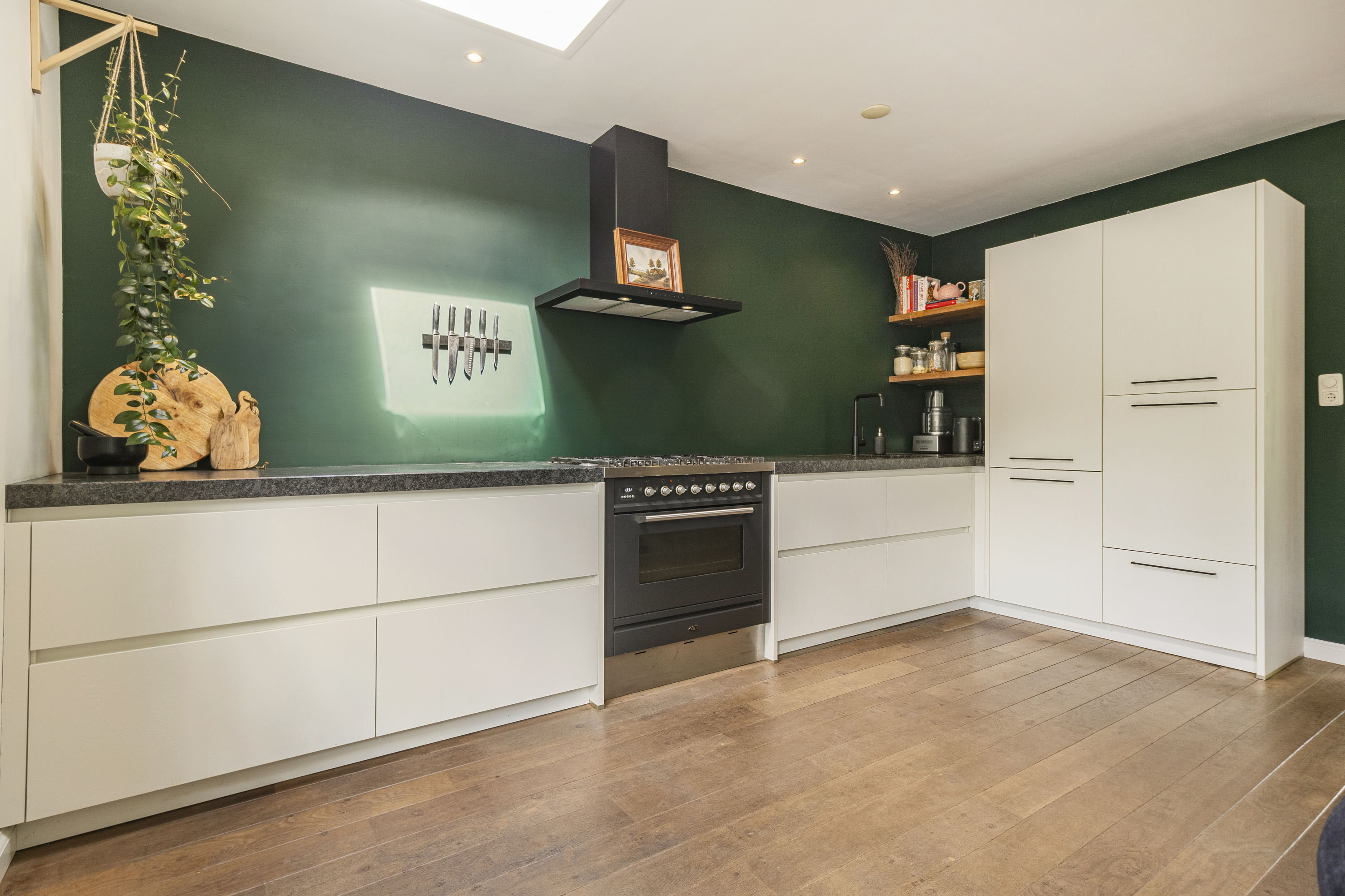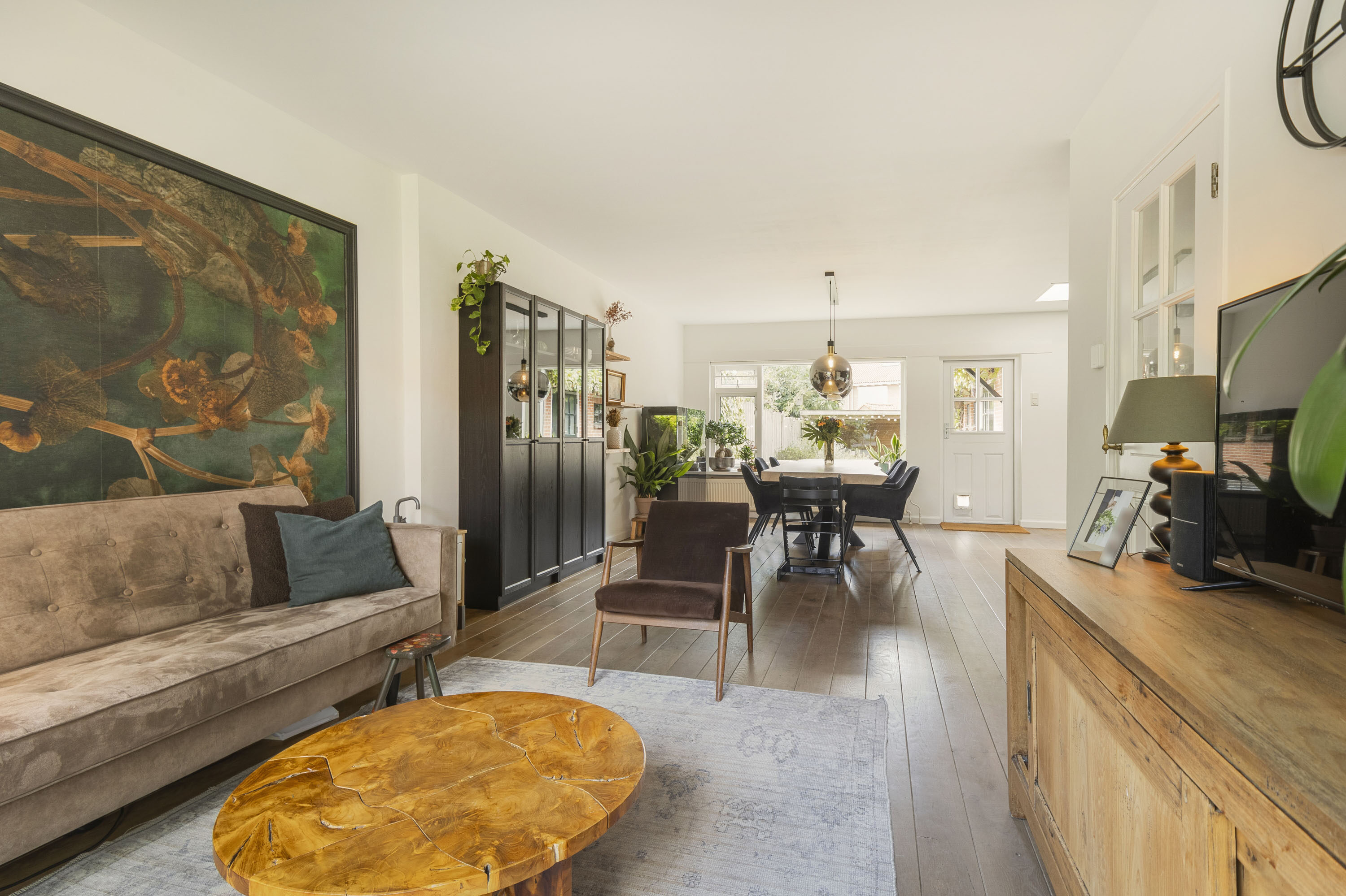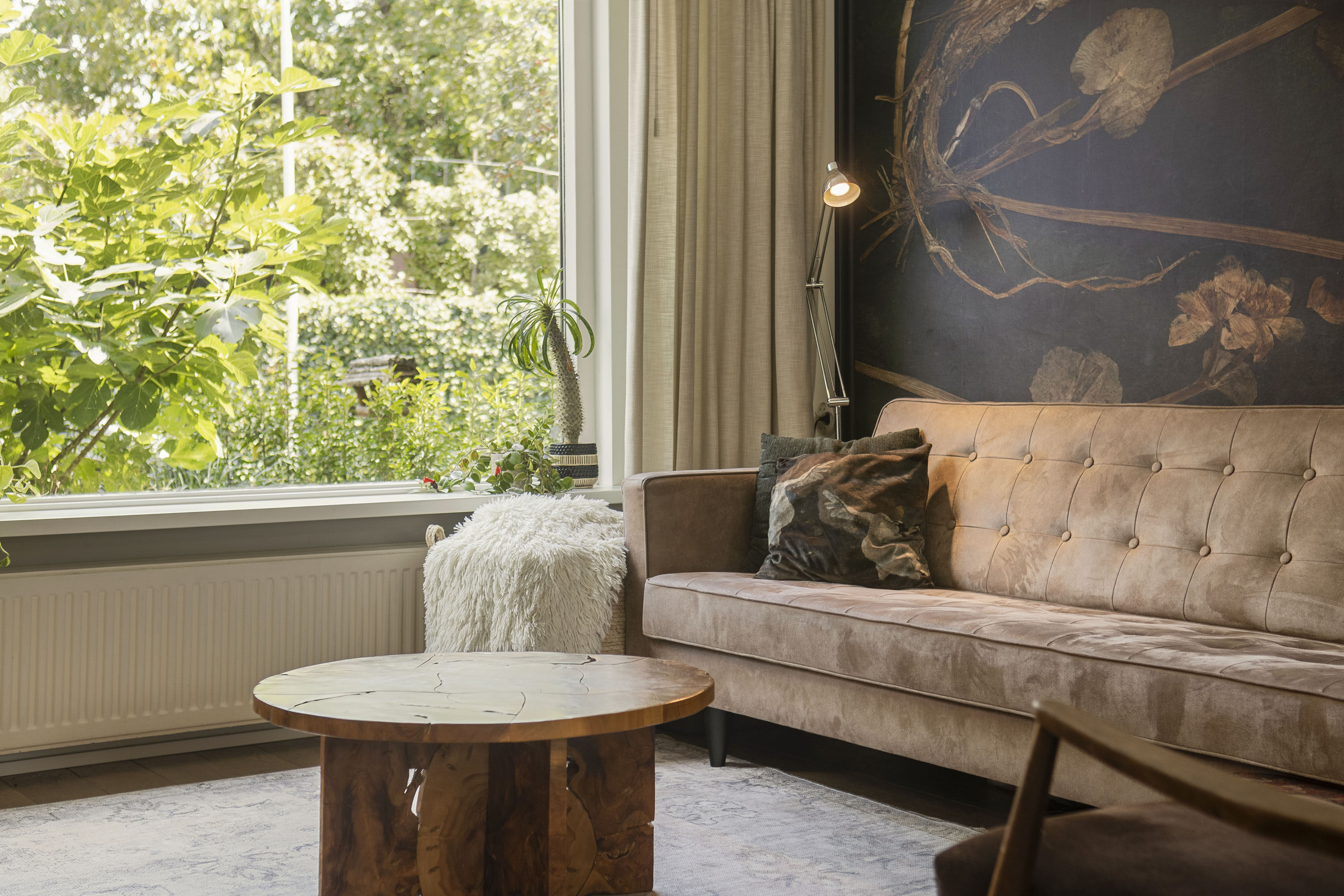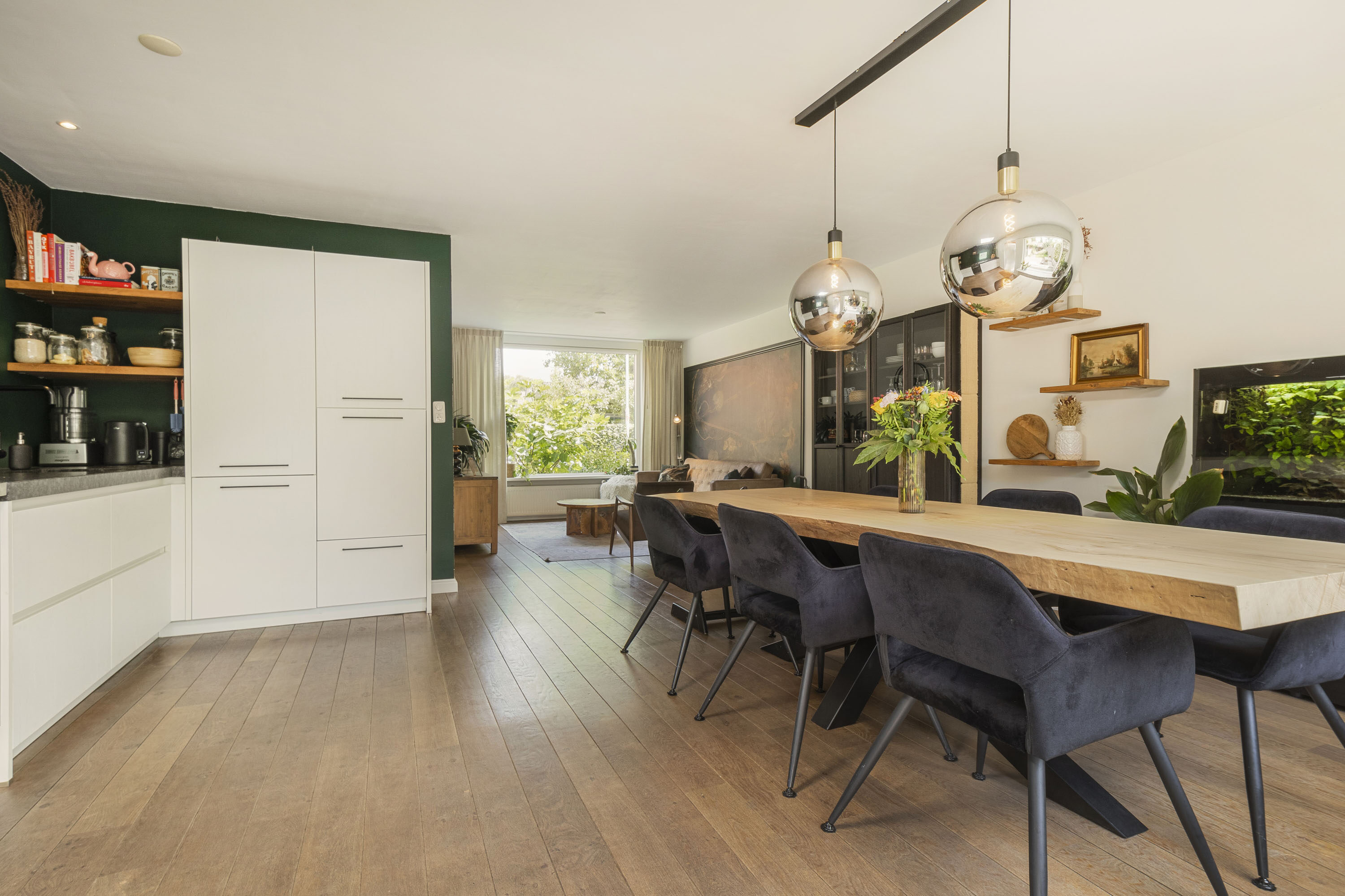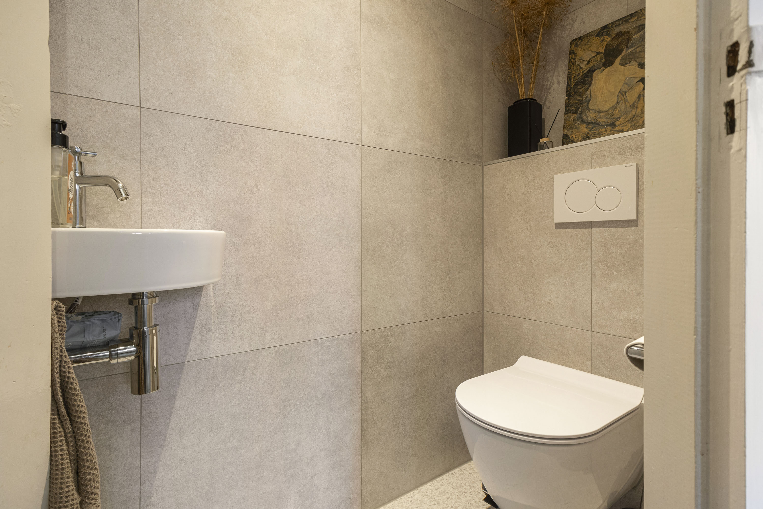De entree is voorzien van een authentieke terrazzovloer en geeft toegang tot de meterkast, het toilet en een vaste inbouwkast. Vervolgens stap je de lichte woonkamer binnen. Grote raampartijen zorgen voor veel natuurlijk daglicht en dankzij de open indeling is er altijd contact tussen de zit- en eethoek en de keuken. De keuken is in 2020 vernieuwd en voorzien van o.a. een Boretti gasfornuis met oven, een afzuigkap, een koelkast en een vaatwasser. Een lichtkoepel zorgt hier voor extra daglicht.
