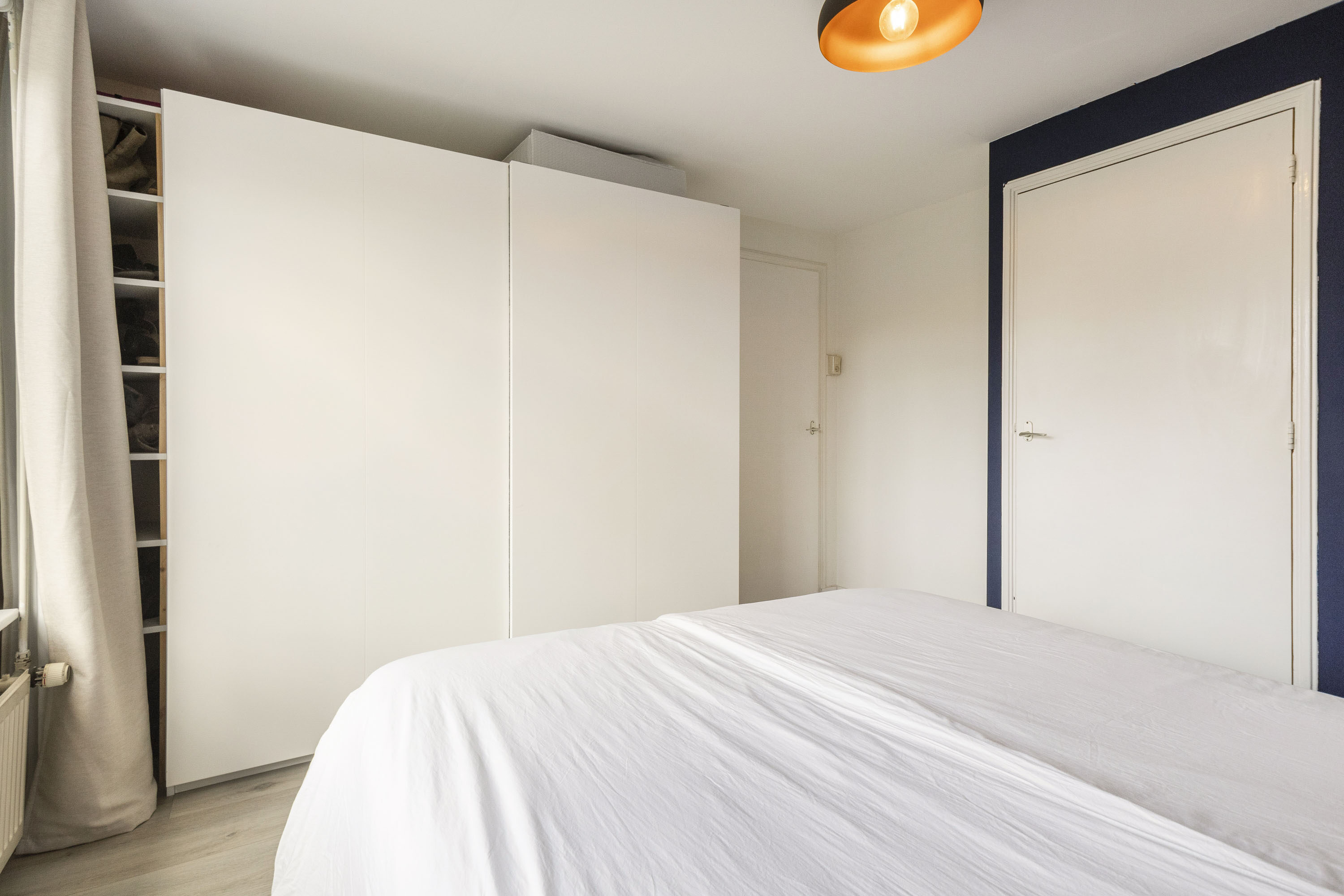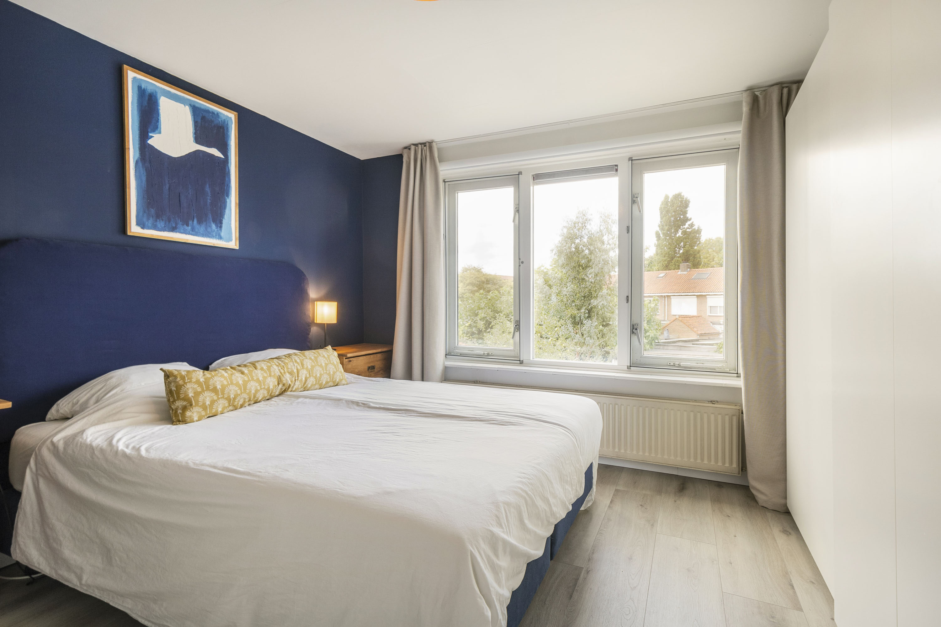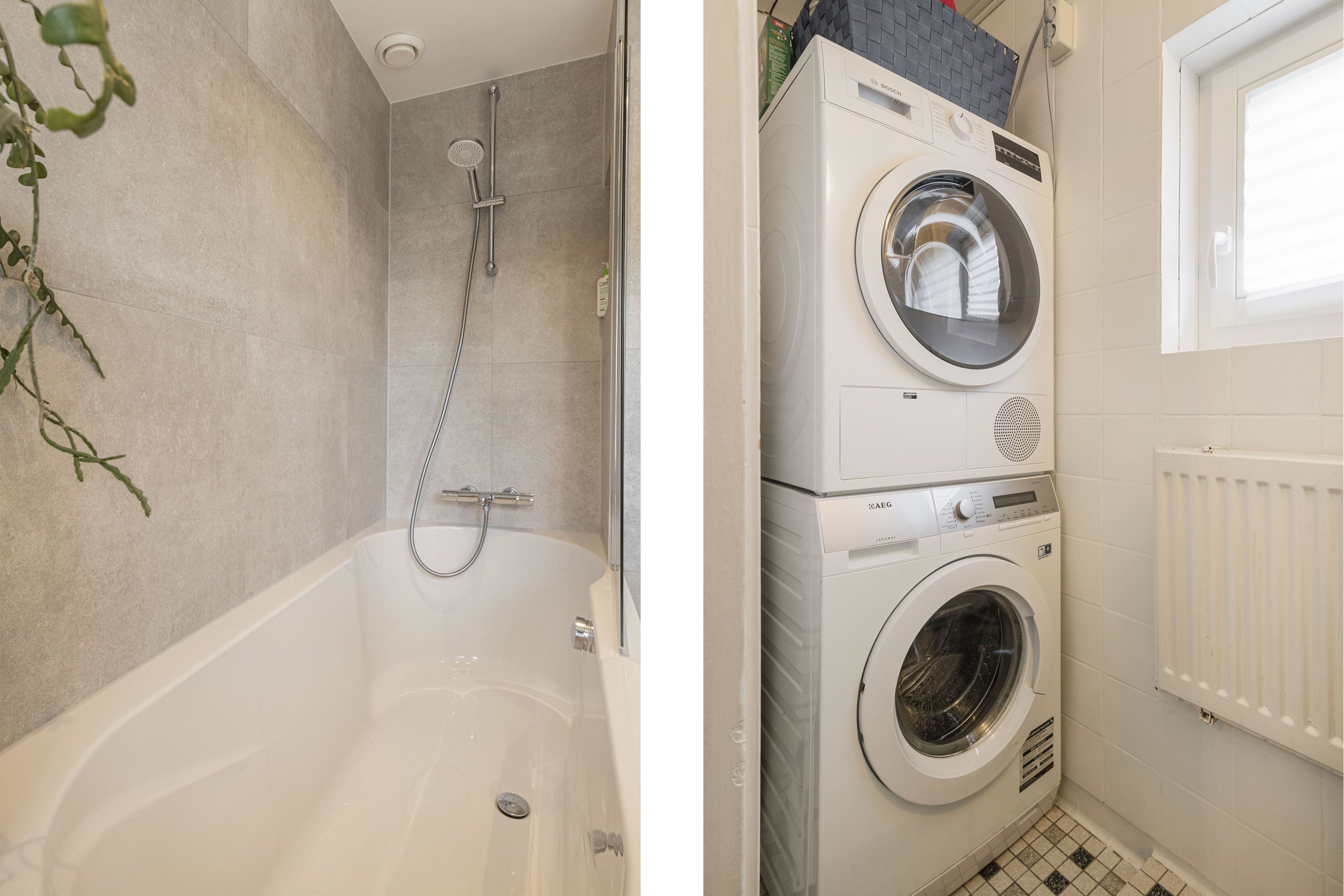 Hier bevinden zich twee slaapkamers van circa 9 m² en 12 m², beide met een vaste inbouwkast. Daarnaast is er een aparte wasruimte en een vernieuwde badkamer (2024) met ligbad-douchecombinatie, toilet, dubbele wastafel met meubel en designradiator.