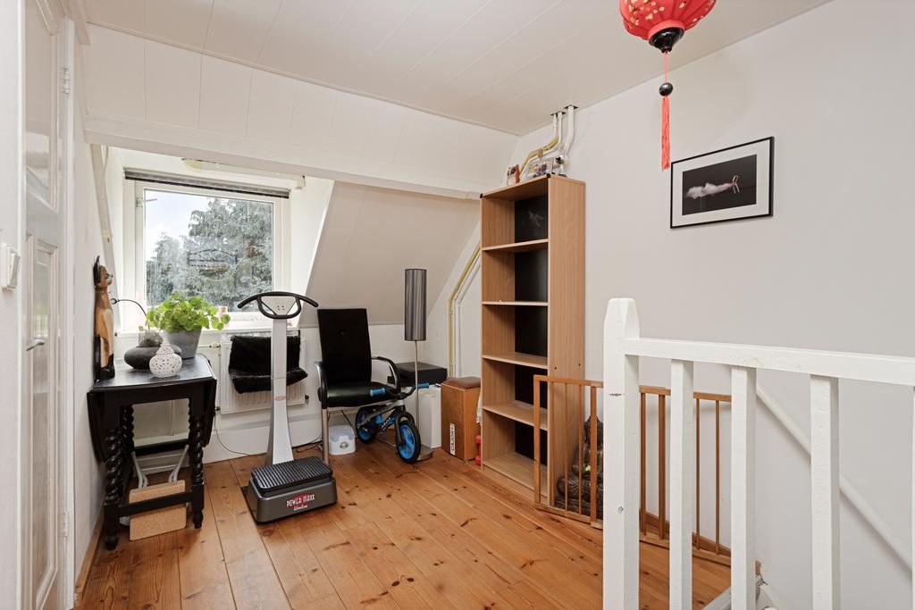 Eerste verdieping: De ruime overloop biedt ruimte voor een werkplek en geeft toegang naar twee slaapkamers. De grote slaapkamer is gelegen aan de voorzijde en is voorzien van een dakkapel, wastafel en kledingruimte. De tweede slaapkamer gelegen aan de achterzijde is voorzien van een Velux dakraam.