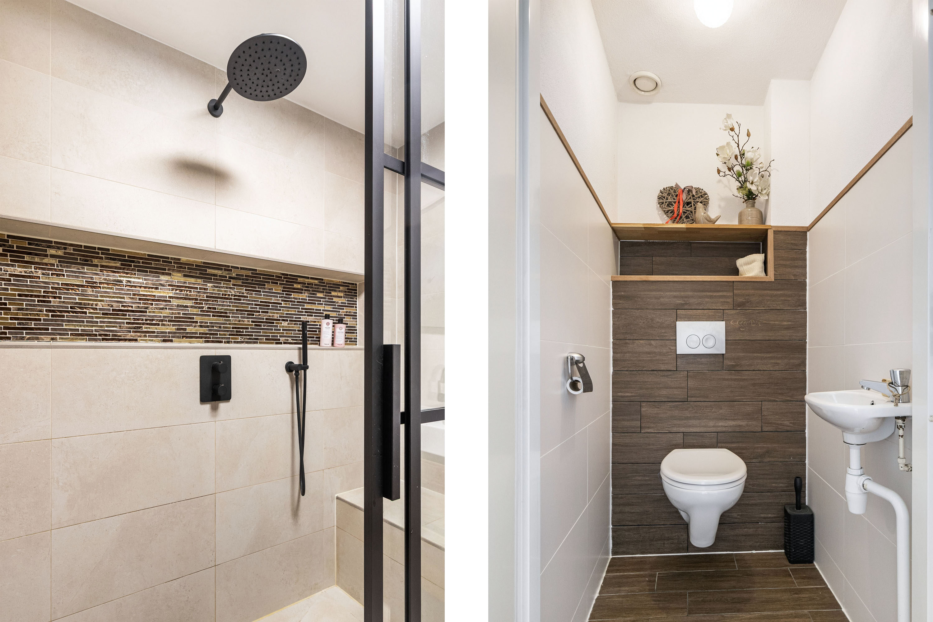 De moderne badkamer, volledig vernieuwd in 2023, is afgewerkt met lichte tegels en subtiele zwarte accenten. Hier geniet je van een ruime inloopdouche, compleet met een verzorgde inbouwnis voor al je douche-accessoires. De badkamer is verder uitgerust met een designradiator en een dubbele wastafel met bijbehorend meubel, waarbij functionaliteit en stijl hand in hand gaan.