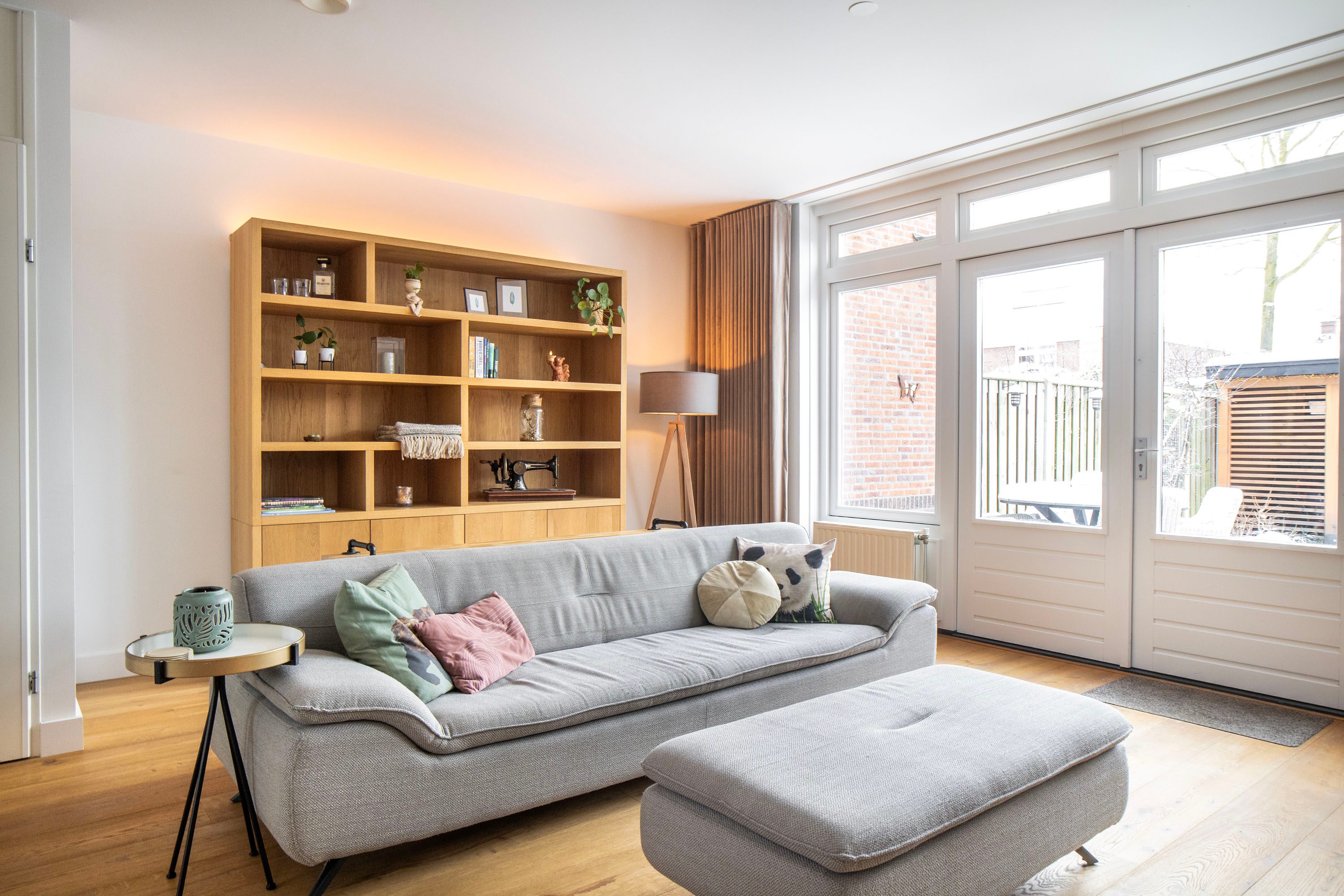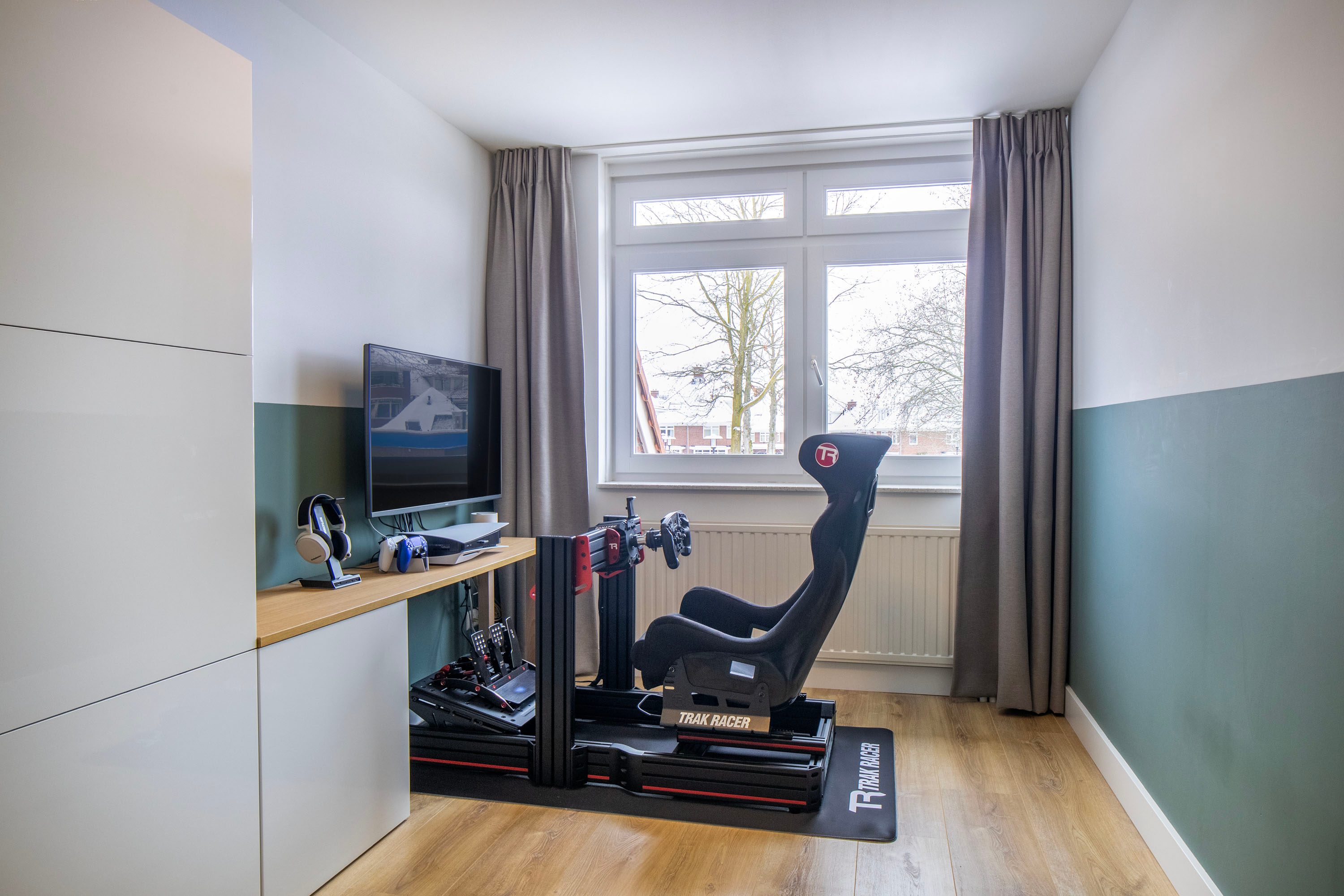 De openslaande tuindeuren geven toegang tot de royale achtertuin op het zuidwesten. De tuin biedt volop ruimte voor een comfortabele loungehoek onder de overkapping/veranda van 7,5 m², evenals een speelhoek voor kinderen. Daarnaast is er een praktische berging van 7,6 m², ideaal voor fietsen en tuingereedschap. De tuin beschikt bovendien over een handige achterom, bijvoorbeeld voor de containers.