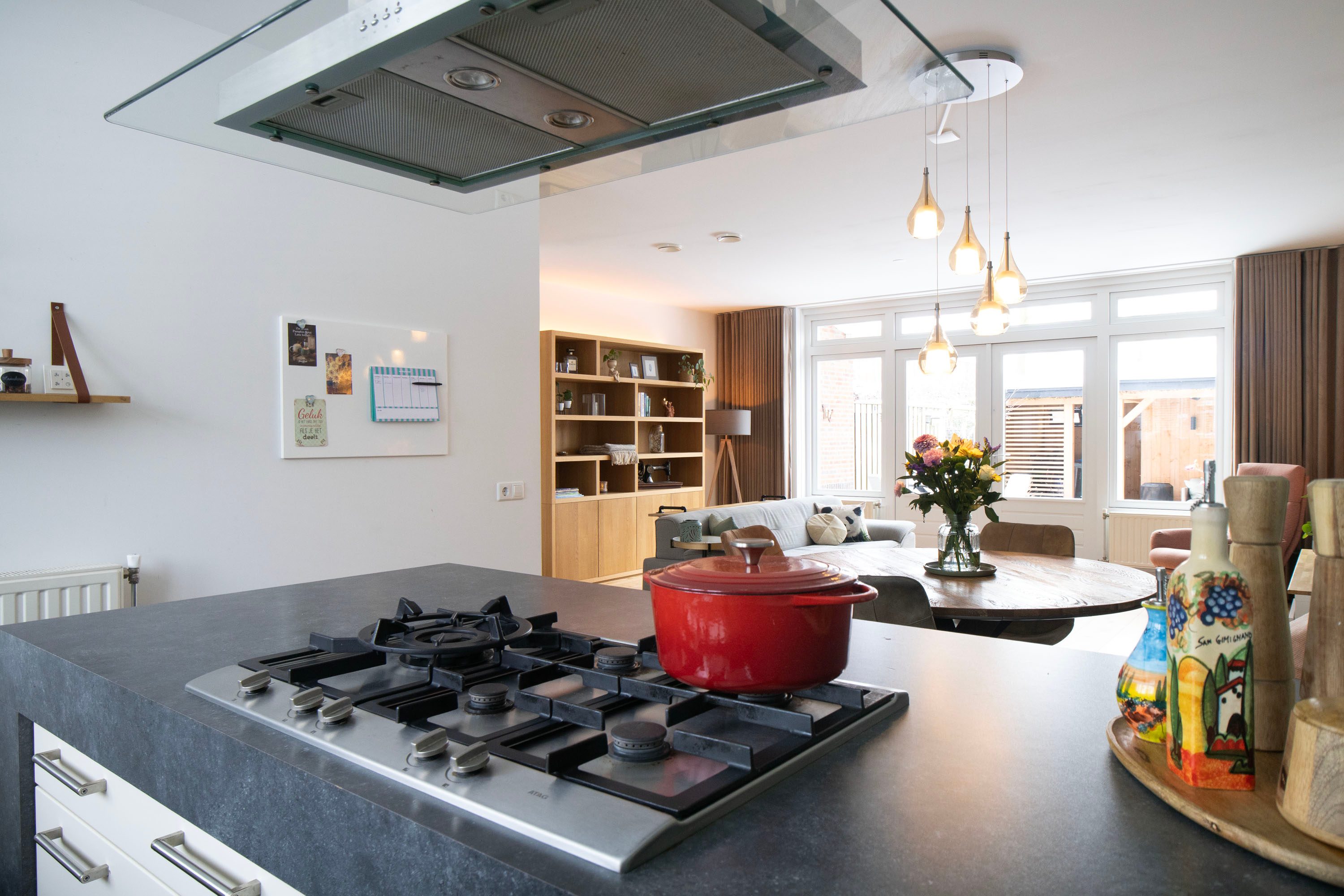 Via de entree, waar zich de meterkast, het toilet en de trapopgang bevinden, betreed je de ruime en lichte woonkamer van 27,8 m². De sfeervolle woonkamer beschikt over een houten vloer. Dankzij de grote tuindeuren geniet deze ruimte van veel natuurlijke lichtinval. Er is voldoende ruimte voor een grote bank én een gezellige extra zithoek. Centraal in de woonkamer bevindt zich het eetgedeelte, dat in open verbinding staat met de keuken. De open keuken van 12,3 m² is voorzien van een modern kookeiland en diverse inbouwapparatuur, waaronder een gasfornuis, afzuigkap, combi-oven, koelkast, vriezer en vaatwasser. Het te openen raam zorgt voor prettige ventilatie en extra daglicht.