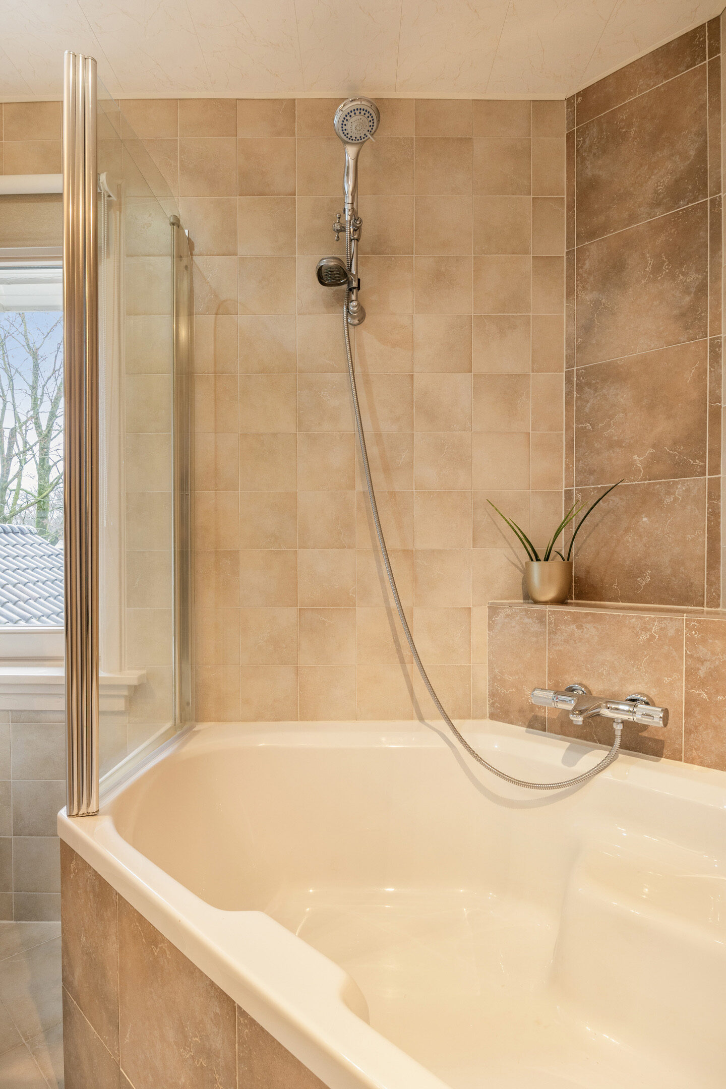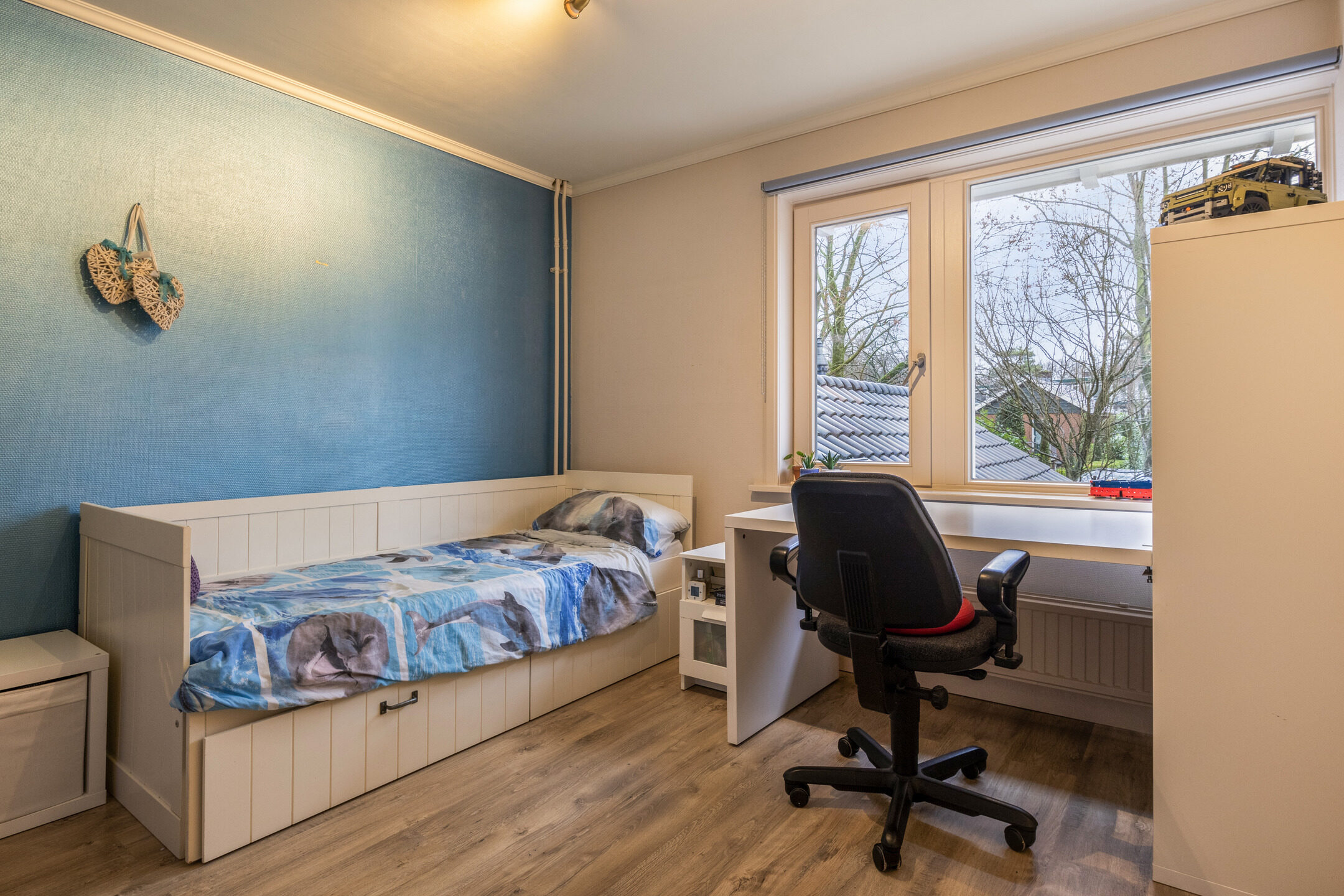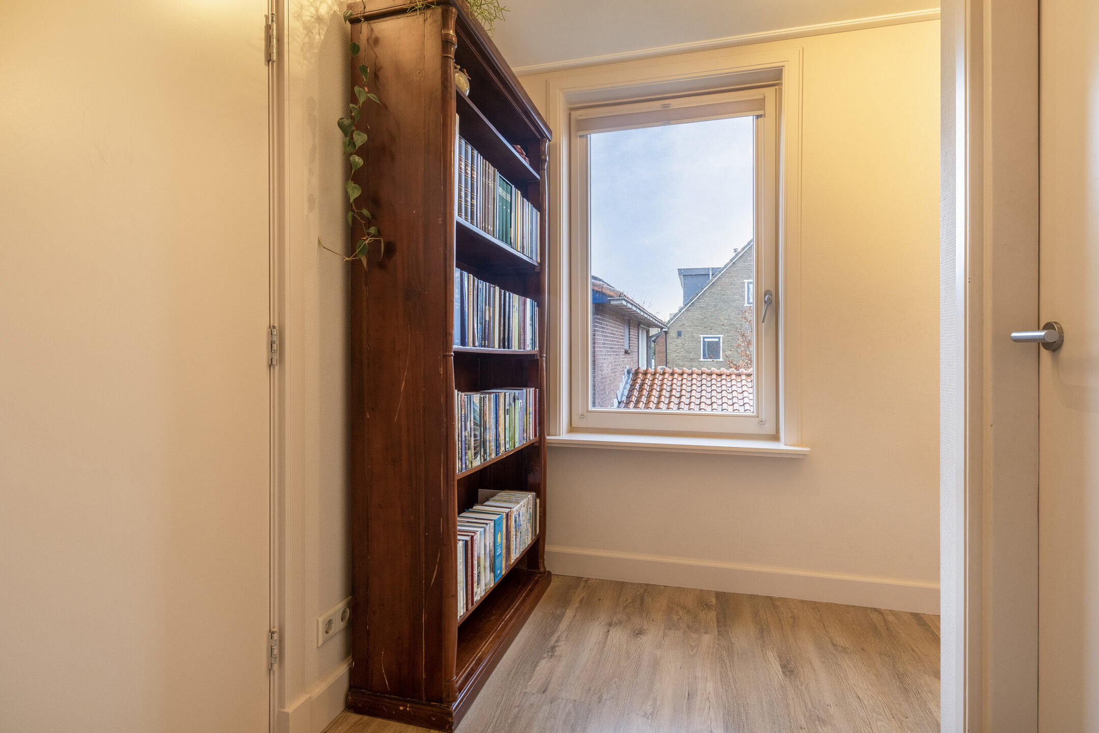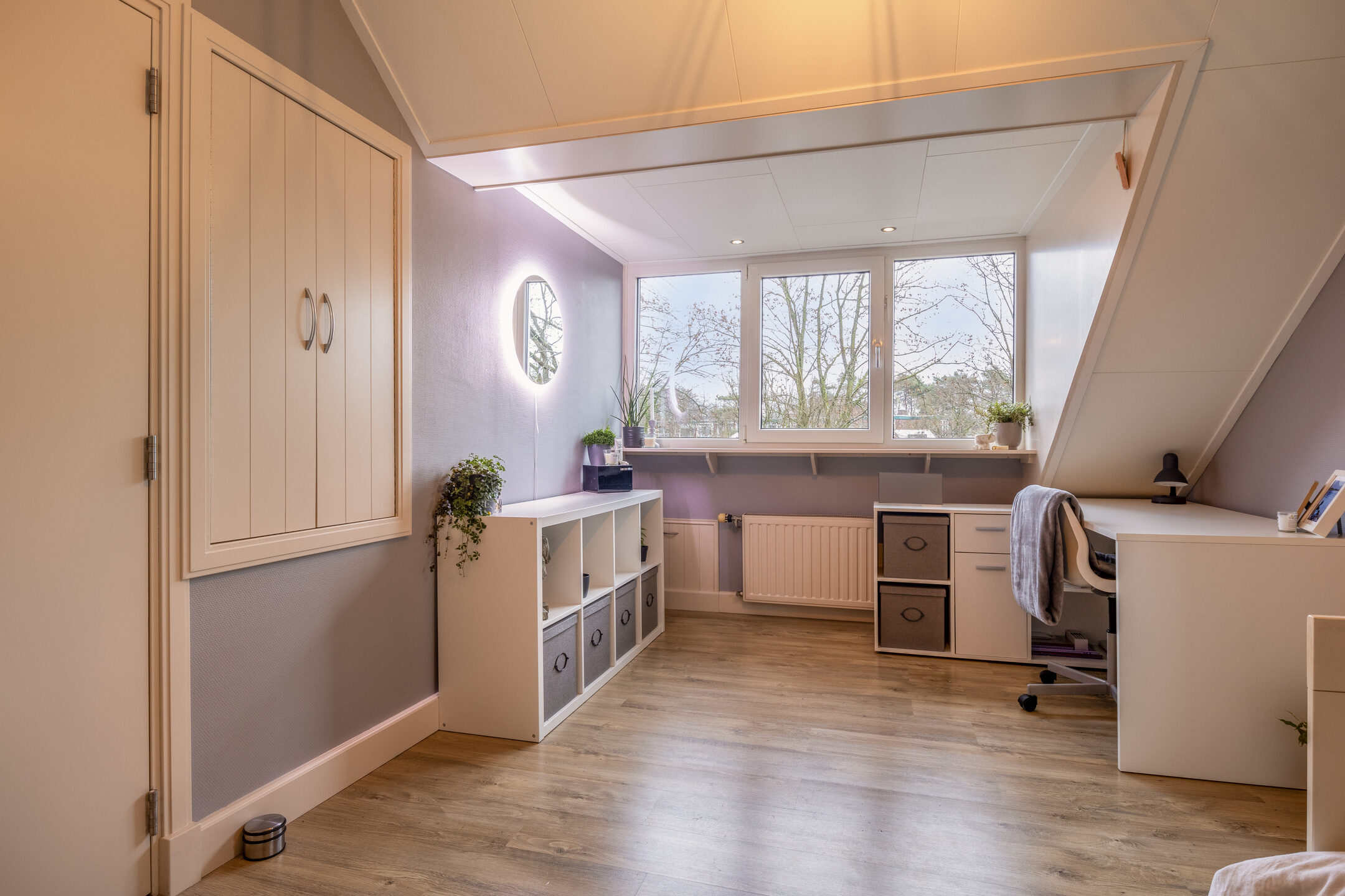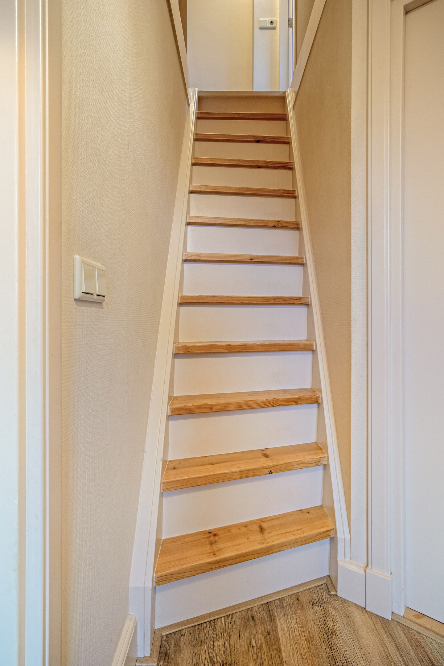 Op de overloop vind je toegang tot de volledig betegelde badkamer, die is uitgerust met een toilet, een wastafel en een comfortabel bad met douchefunctie. Verder zijn er op deze verdieping twee slaapkamers. De eerste slaapkamer is ruim en beschikt over een praktische inbouwkast. Daarnaast is deze kamer voorzien van een losse wastafel in een aparte ruimte, wat extra gemak biedt. De tweede slaapkamer is eveneens ruim en kan flexibel worden ingericht, bijvoorbeeld als kinder-, logeer- of werkkamer. Vaste kast onder de trap vanuit deze kamer.