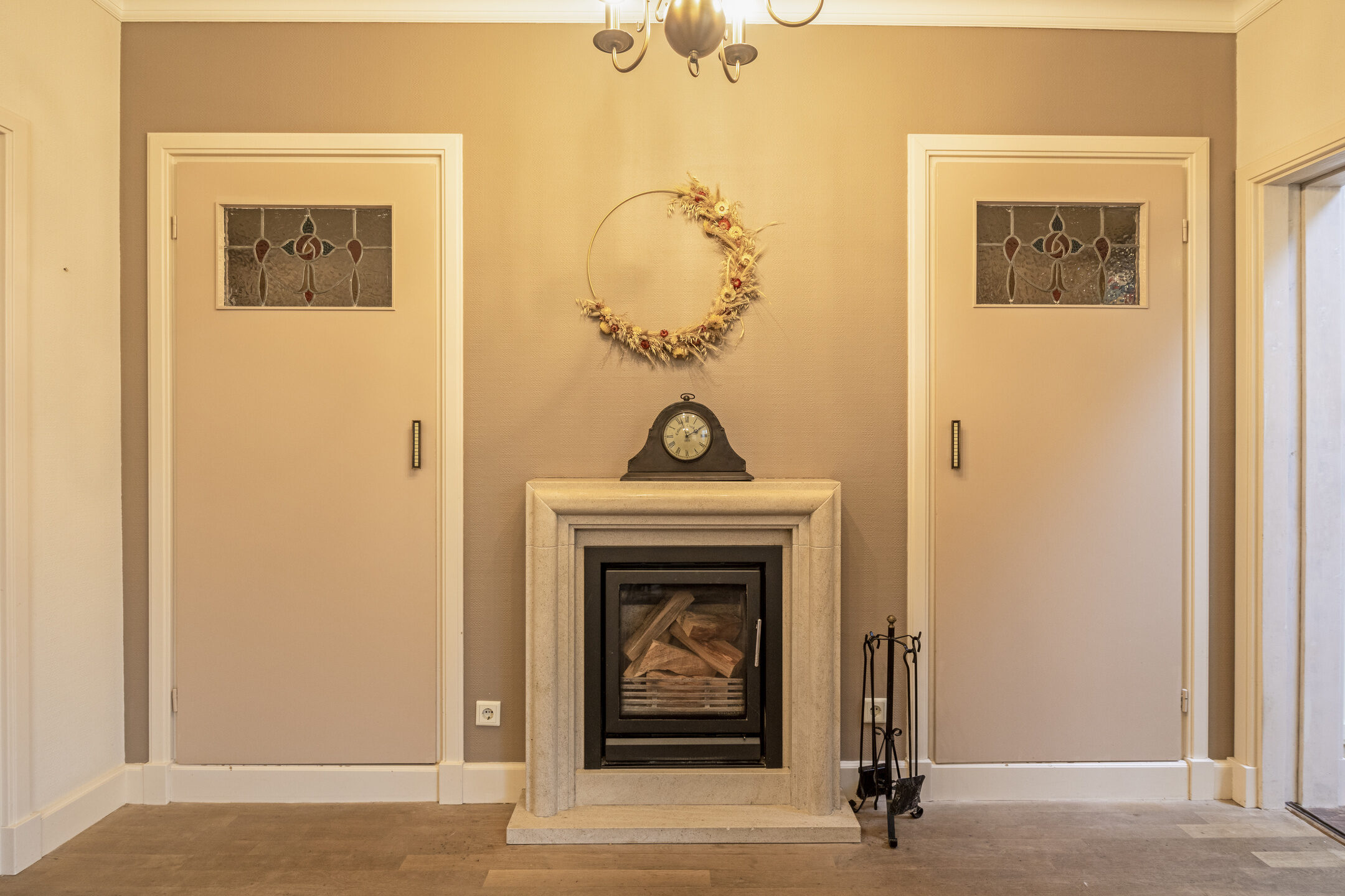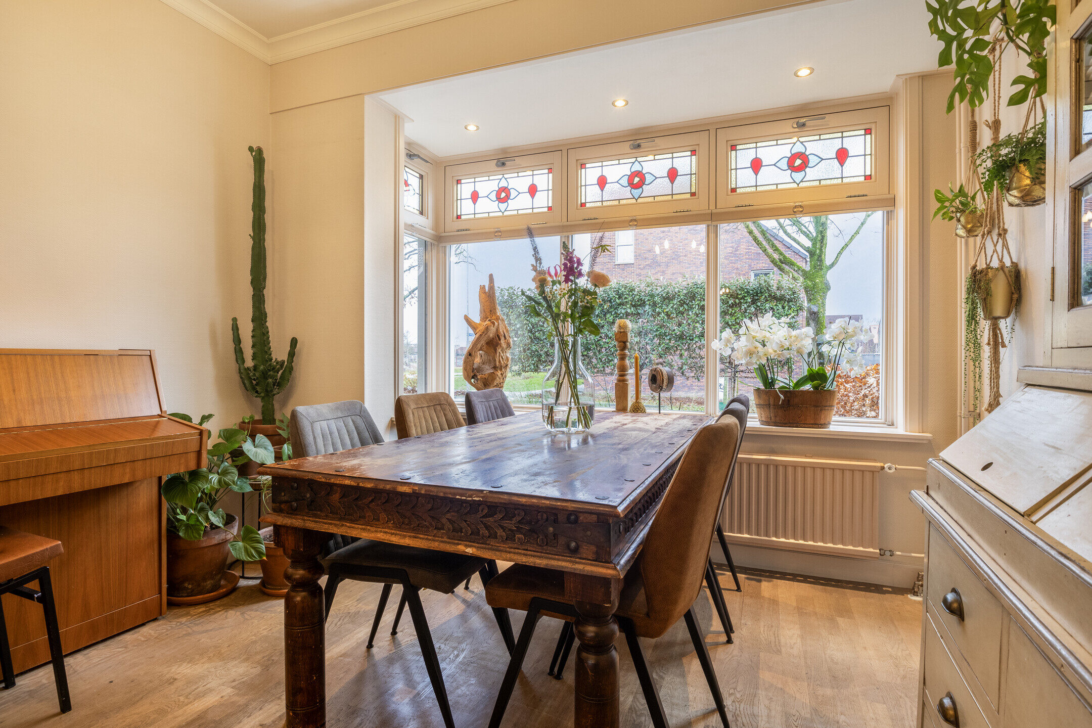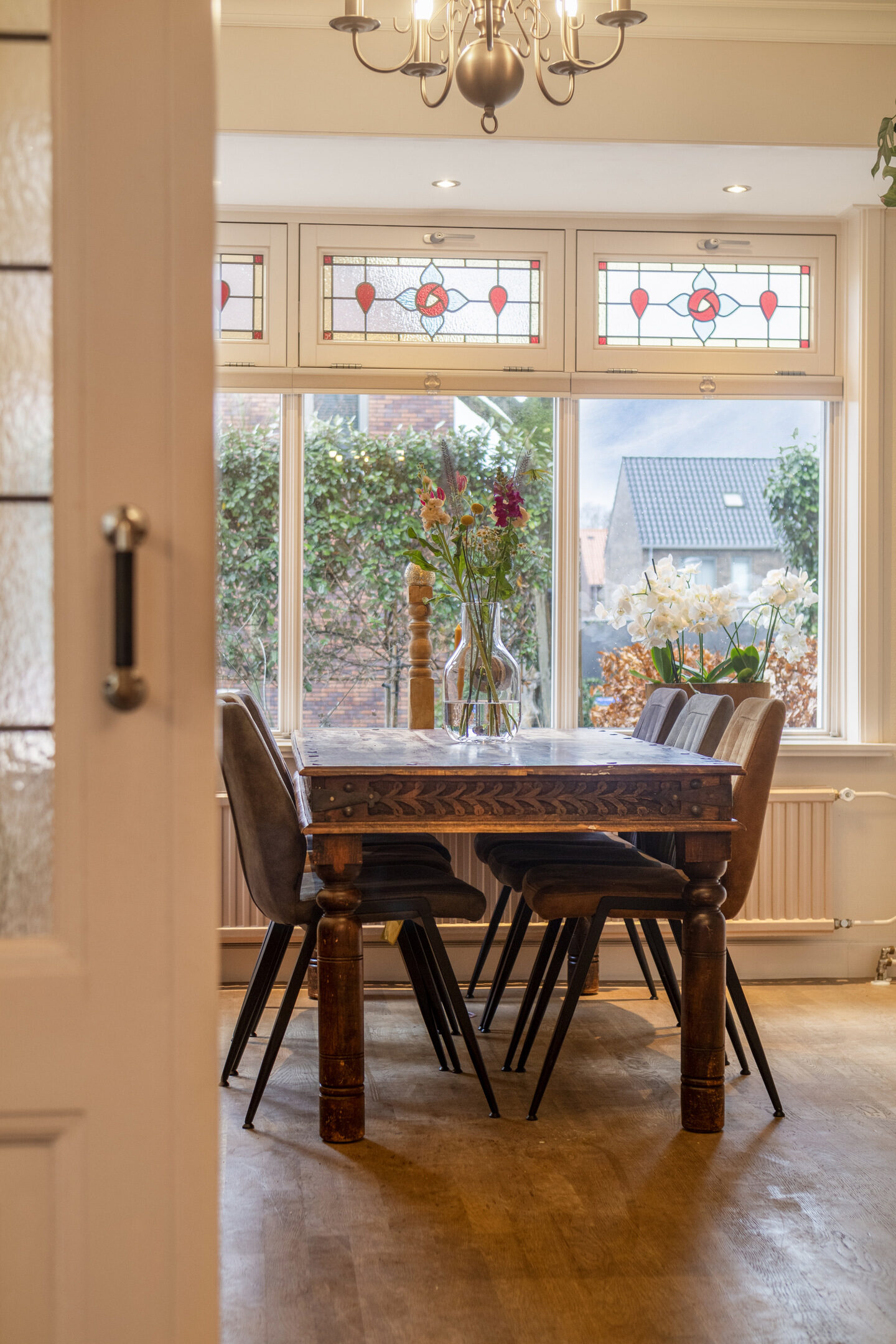 + Glas-in-lood ensuite deuren en ramen voegen een charmant en uniek element toe aan de woon- en eetkamer;