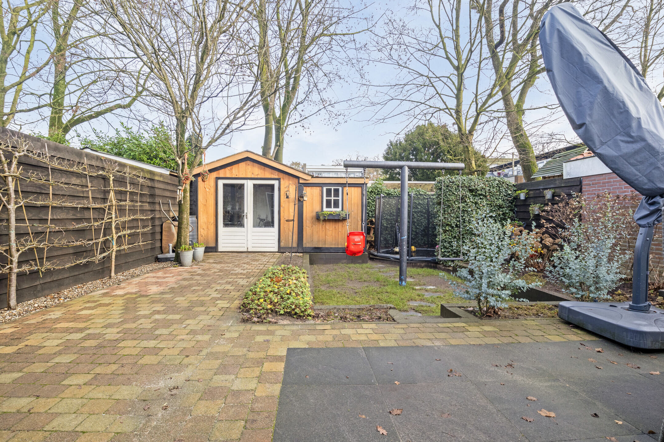 De tuin is toegankelijk via de serre of de bijkeuken. Deze is prachtig aangelegd en beschikt over een terras en een speelplek. Achterin de tuin vind je een trampoline en een berging, perfect voor het opbergen van fietsen en tuingereedschap. De tuin is ook bereikbaar vanaf de oprit door middel van de brede poort. Aan de zijkant van de woning is een houten afdak gerealiseerd perfect voor de kliko's of fietsen.
