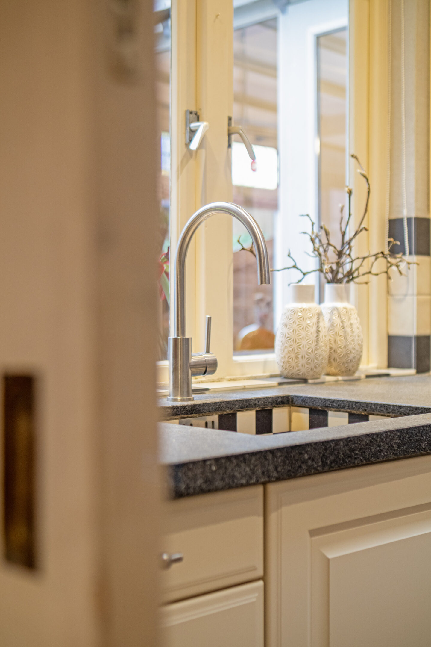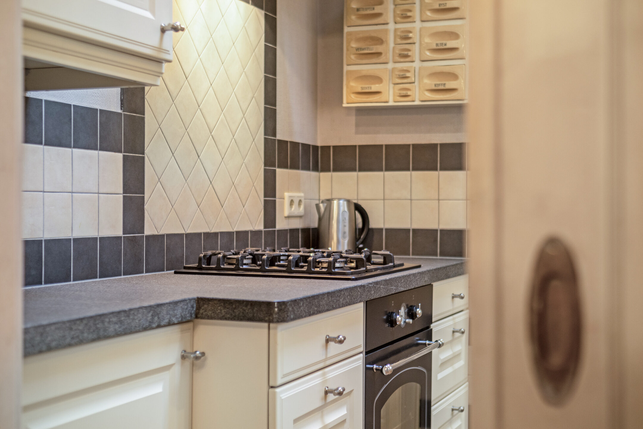 De woonkamer biedt toegang tot de serre, waar je beschut kunt zitten. Op warme dagen kun je de schuifdeuren openen voor extra ventilatie. Naast de serre bevindt zich de keuken, die is uitgerust met lichte kastjes, een natuurstenen werkblad en diverse inbouwapparatuur, waaronder een vierpits gasfornuis, afzuigkap, vaatwasser, oven en koelkast. Dankzij het Velux dakraam valt er veel daglicht binnen in de keuken. Vanuit de keuken leidt een schuifdeur naar de bijkeuken, waar de aansluiting voor de wasmachine is te vinden en meerdere grote inbouwkasten. De bijkeuken is voorzien van bergzolder.