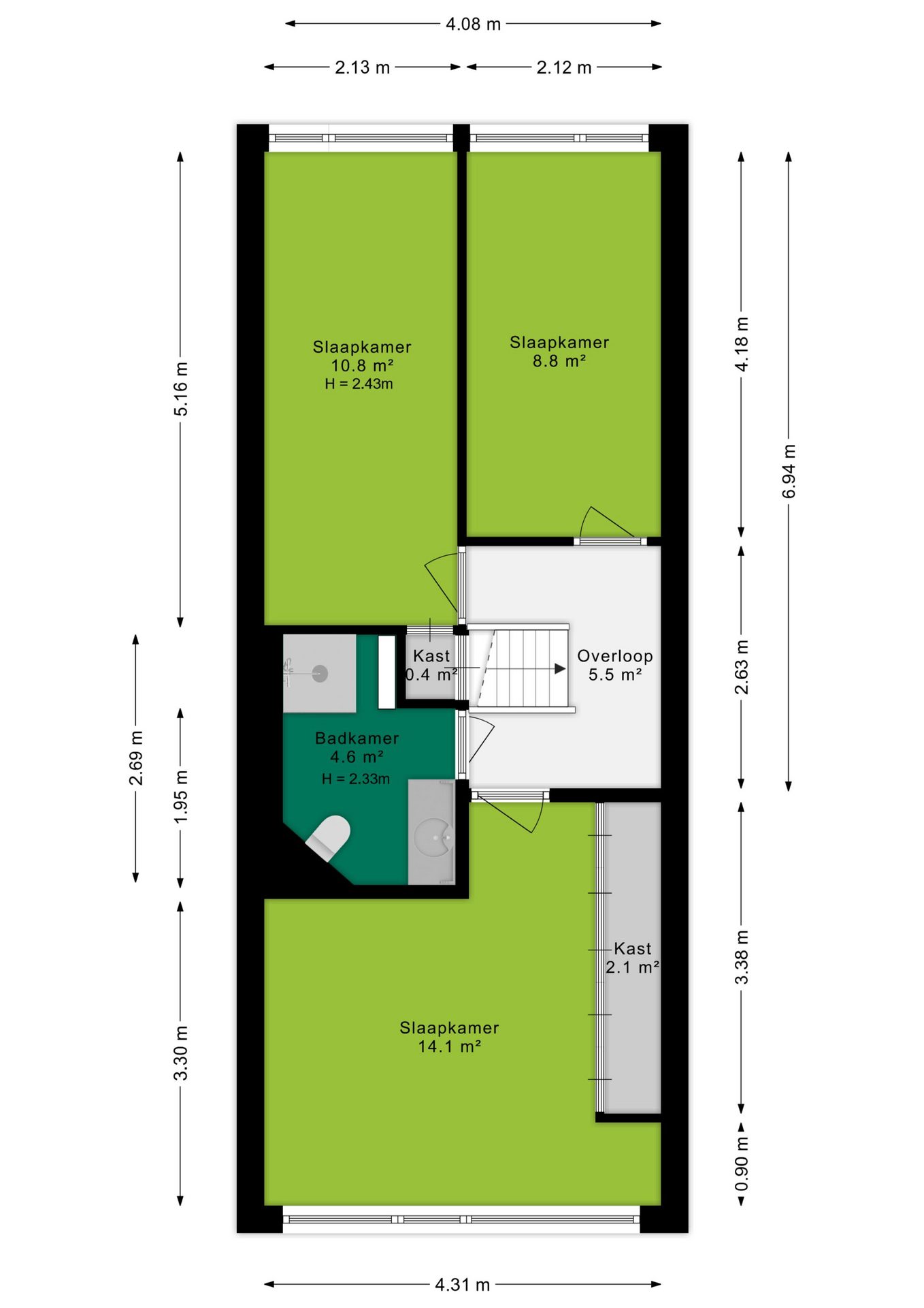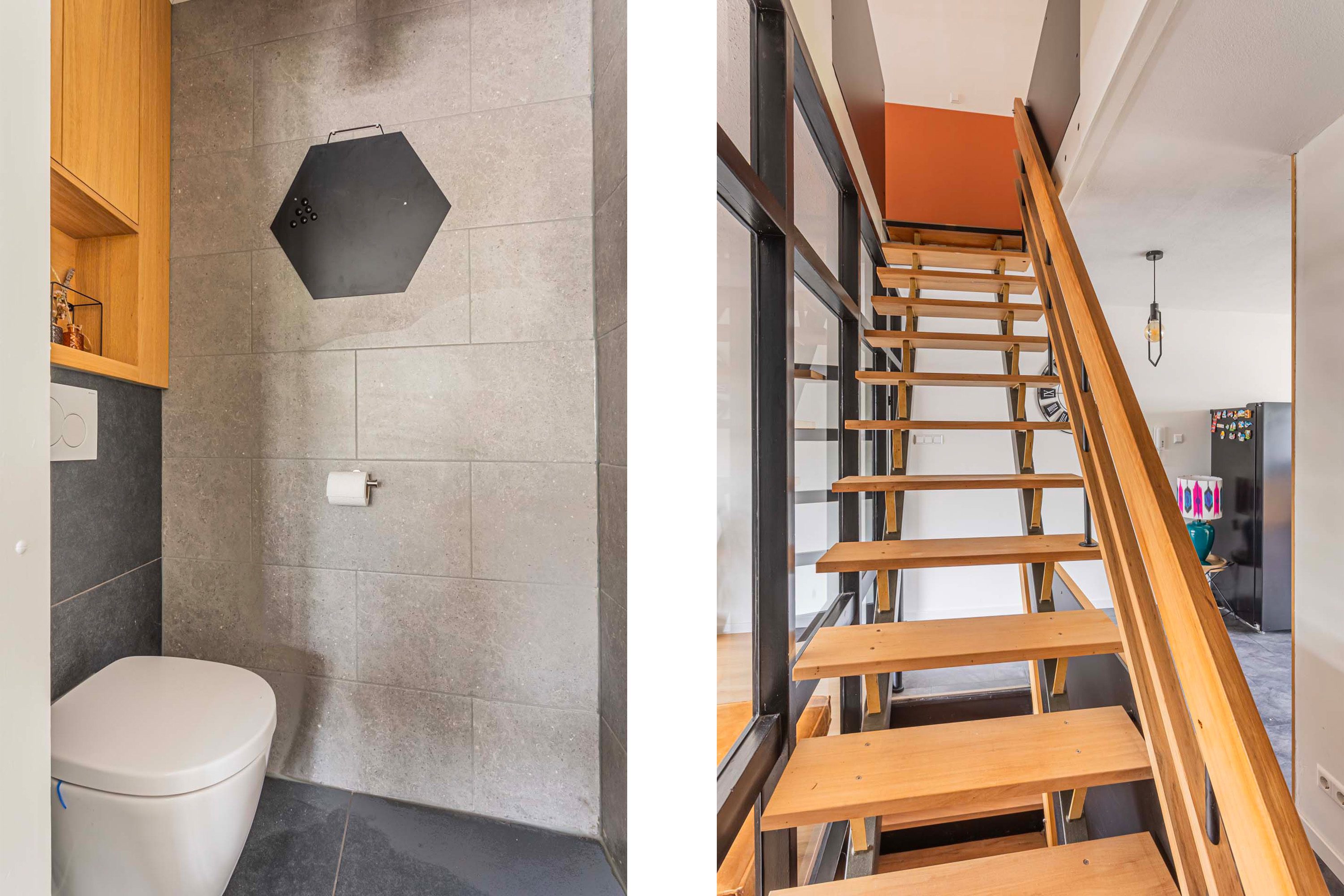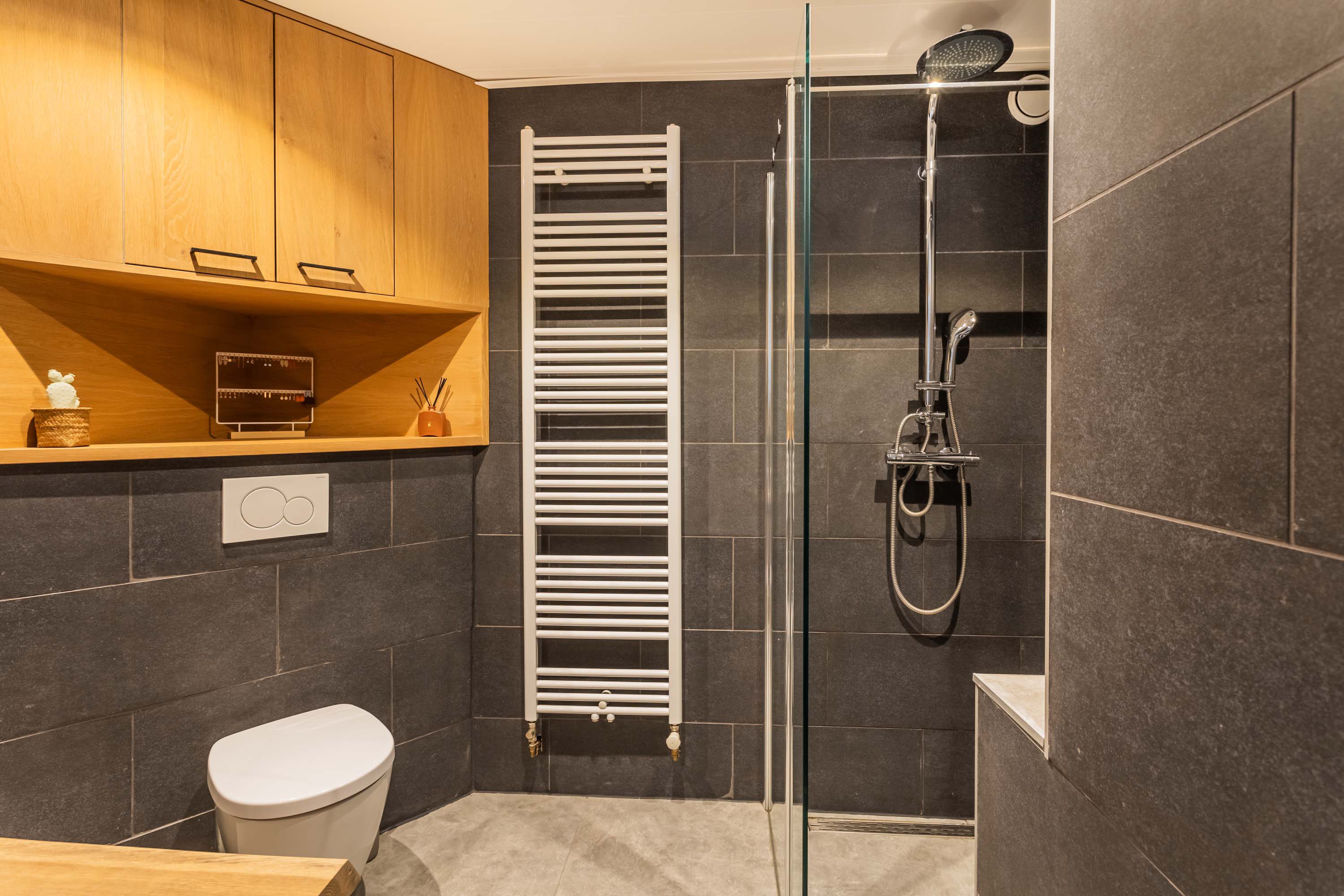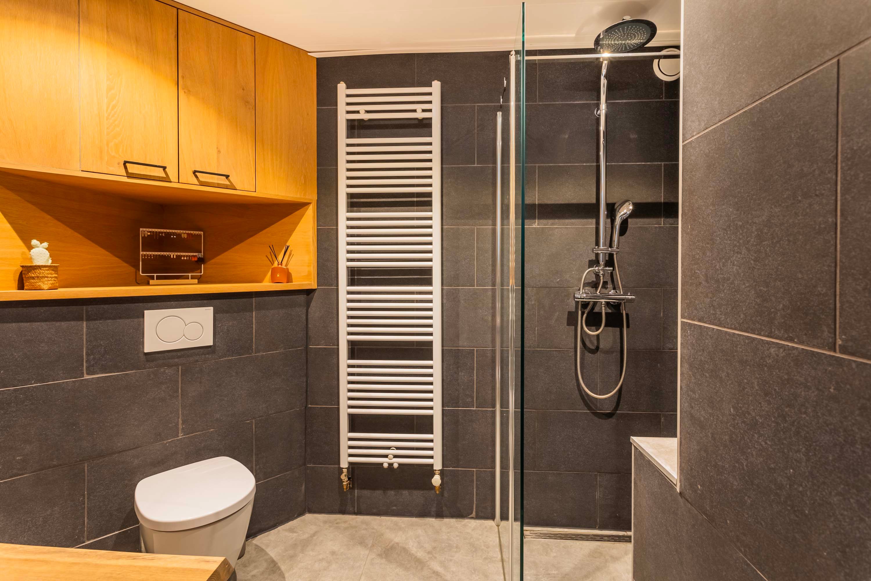 Via de trap kom je op de tweede verdieping, waar je drie ruime slaapkamers tegenkomt. Elk van deze kamers biedt volop natuurlijk licht en diverse mogelijkheden. De moderne badkamer straalt luxe uit door het gebruik van donkere tegels en is uitgerust met een douche, een toilet, een designradiator en een stijlvolle wastafel.