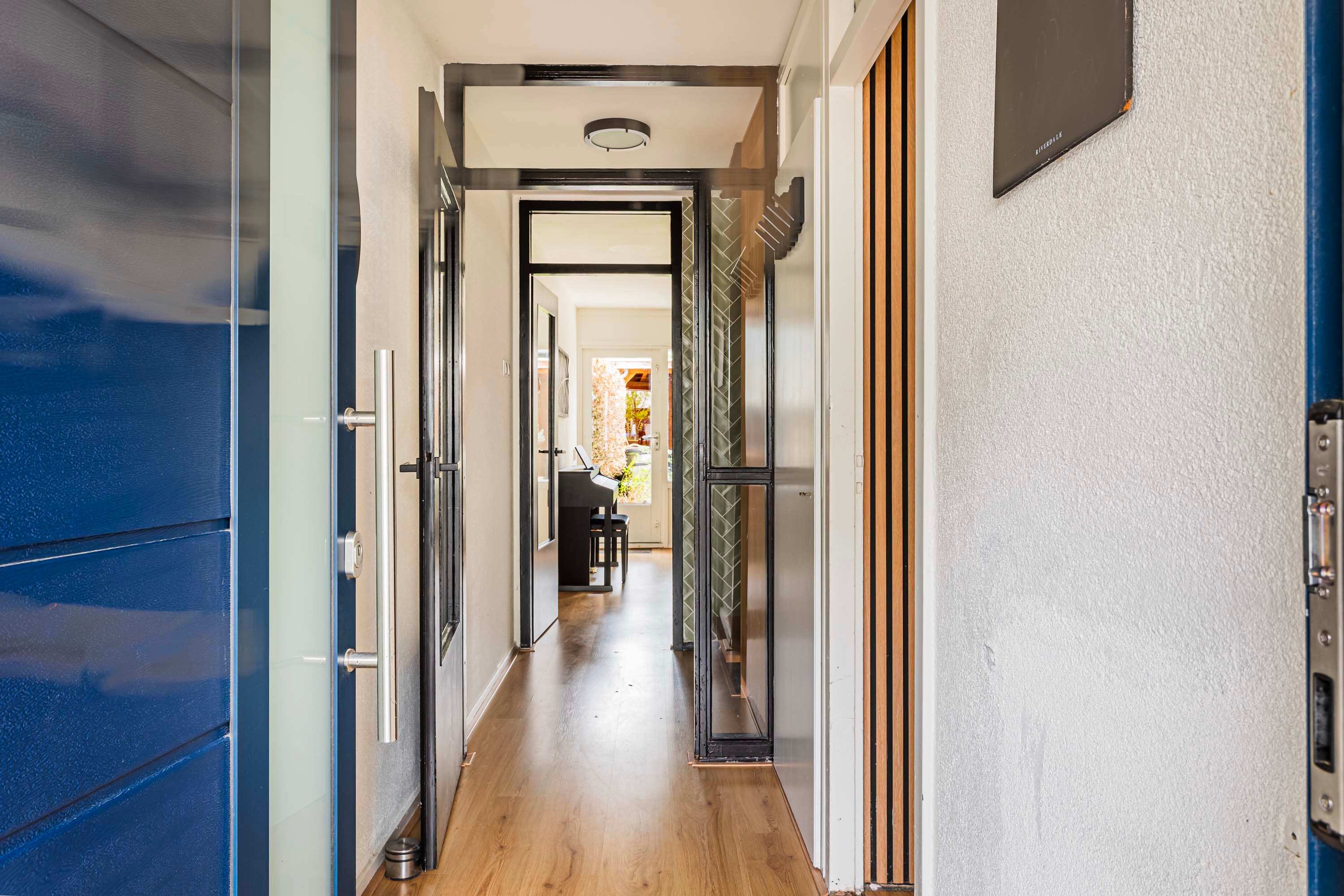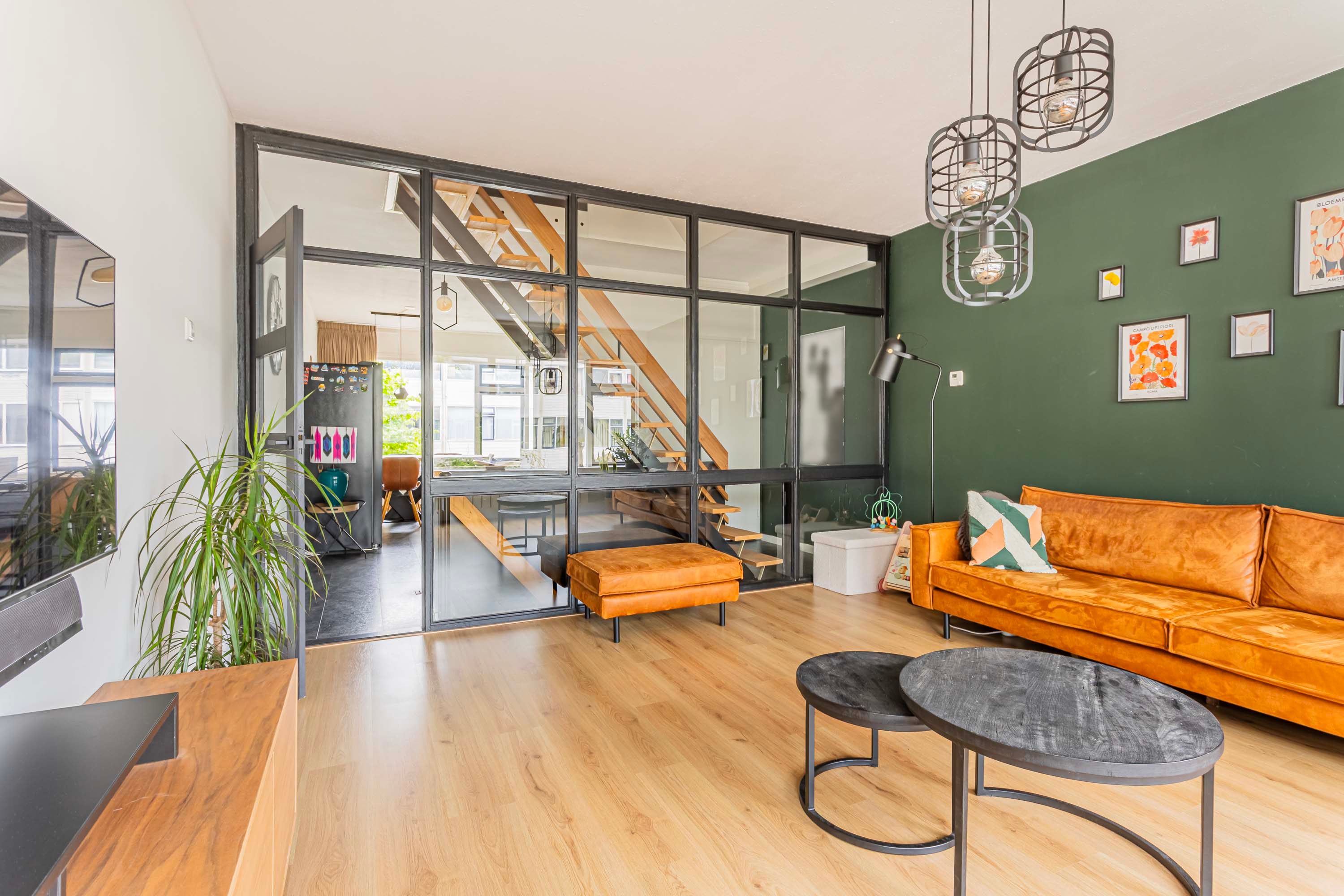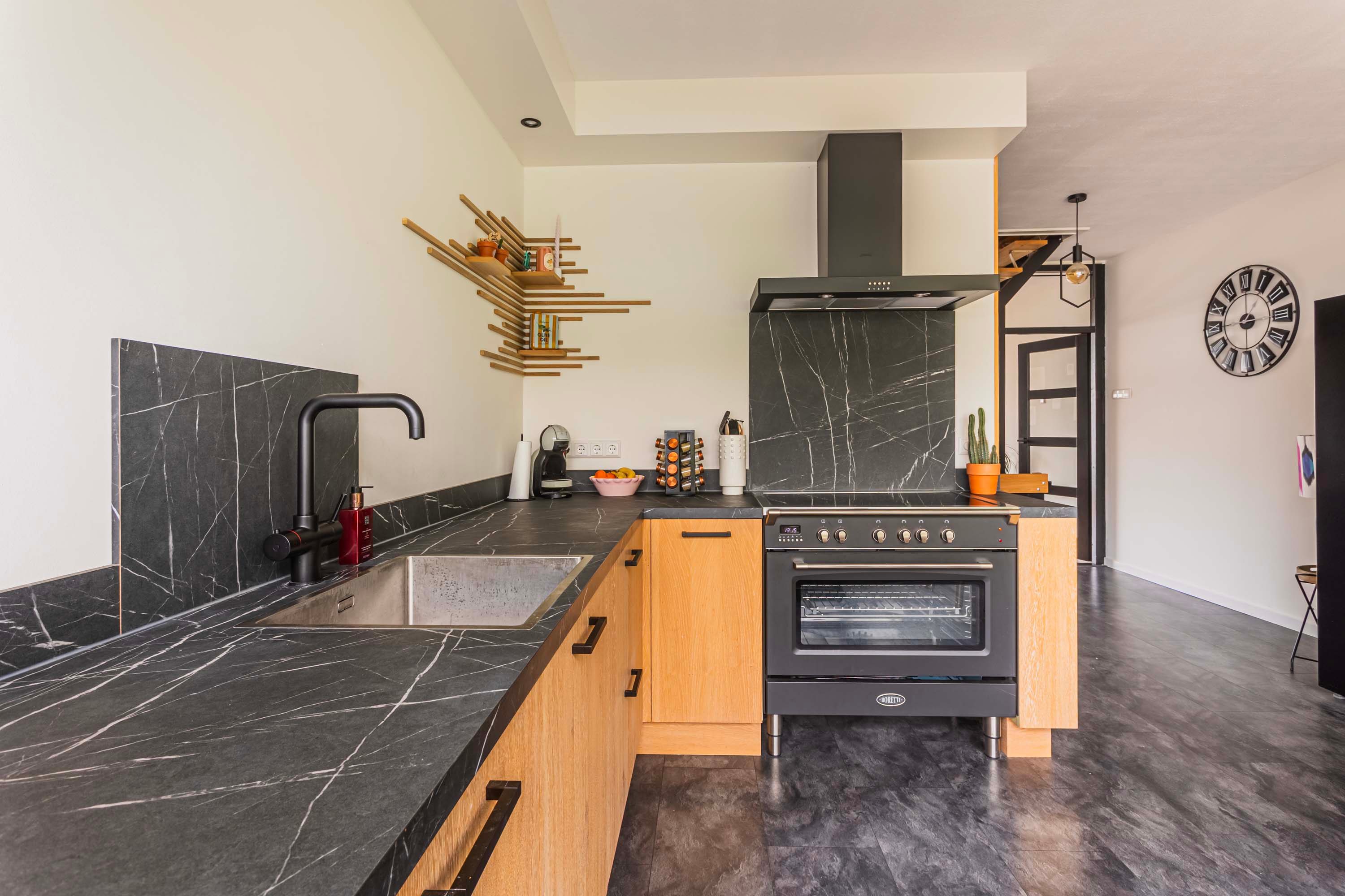 Via de trap kom je op de eerste verdieping. Aan de voorzijde bevindt zich de moderne keuken, uitgevoerd met een donker werkblad en houten kastjes, wat zorgt voor een warme en stijlvolle uitstraling. De keuken beschikt over diverse inbouwapparatuur, zoals een inductiekookplaat, een afzuigkap, quooker, een oven en een vaatwasser. Vanuit de hal loop je door naar de achterzijde van de woning naar de ruime woonkamer. De grote raampartijen zorgen voor veel natuurlijk licht, waardoor de woonkamer een lichte en uitnodigende uitstraling heeft.