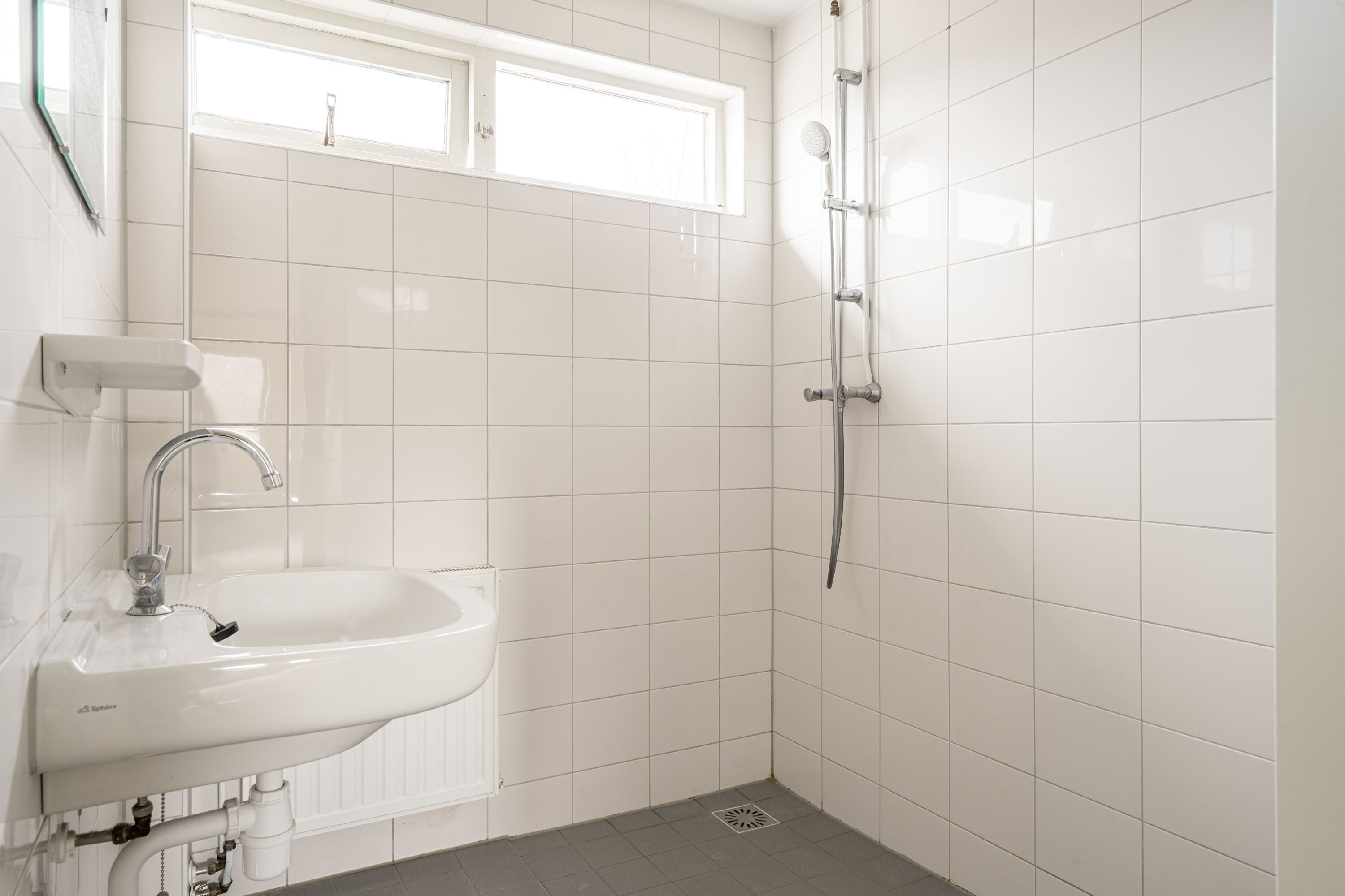 De overloop biedt toegang tot drie slaapkamers, de badkamer en via de vaste trap is de zolder bereikbaar. De badkamer is volledig betegeld en voorzien van een inloopdouche en wastafel. Het raam in de badkamer biedt een fijn daglicht en de mogelijkheid om op een natuurlijke manier te ventileren.
